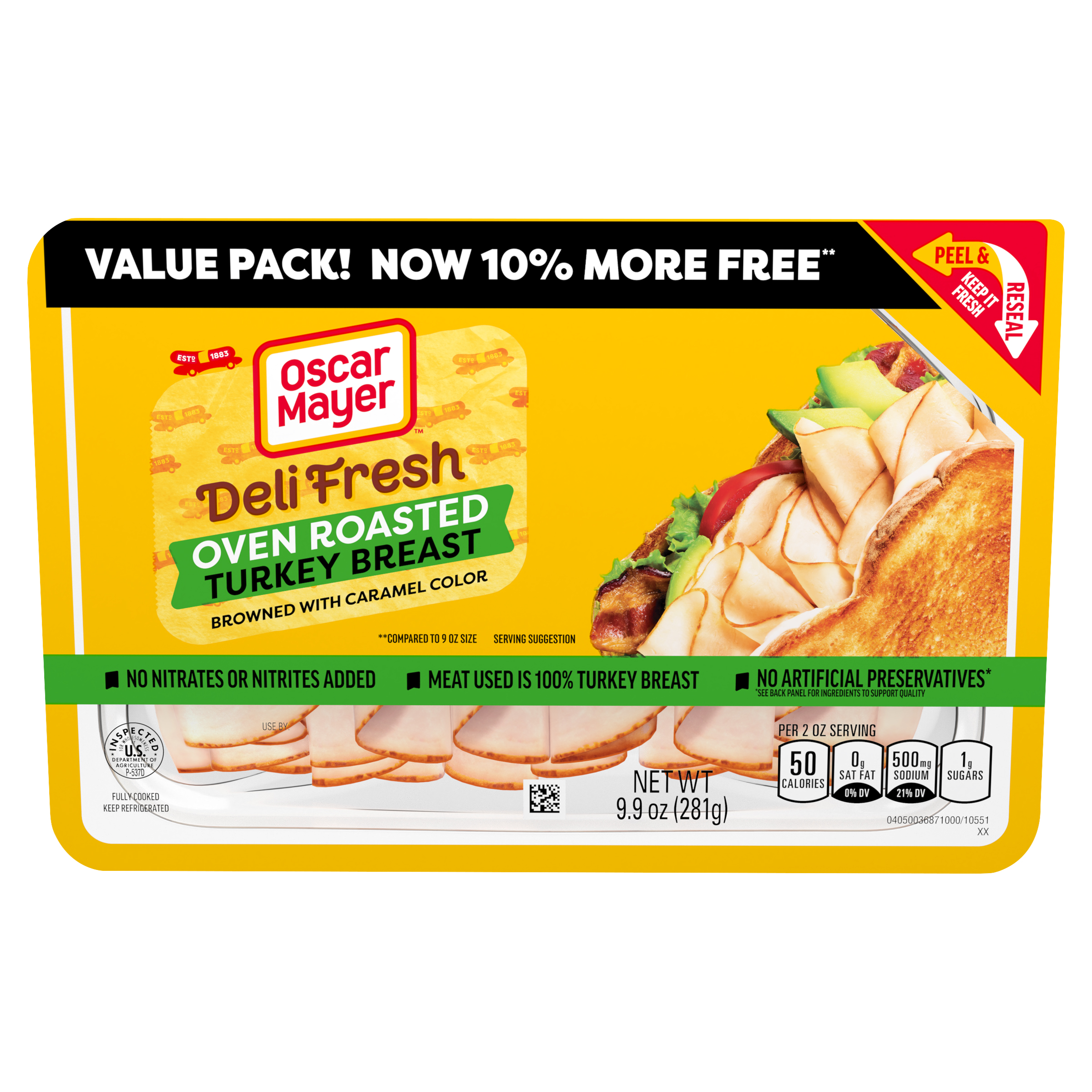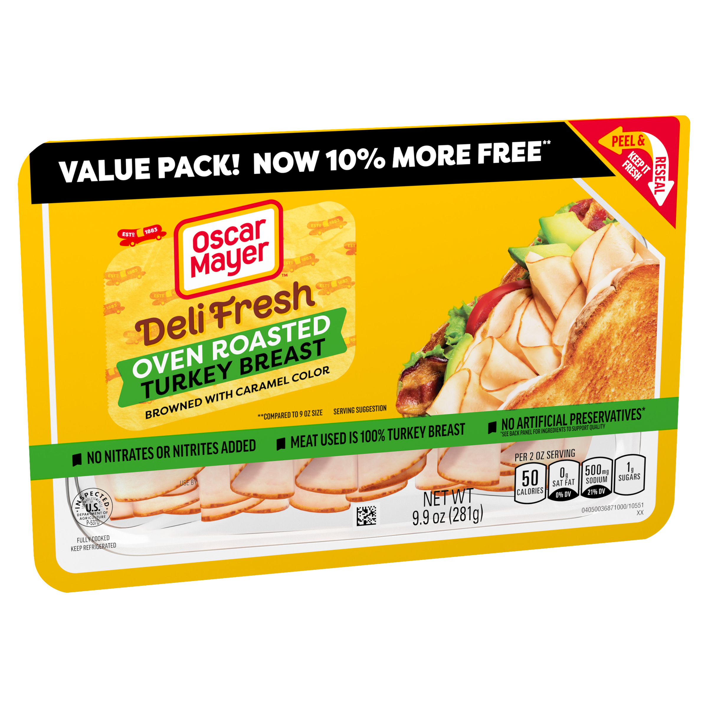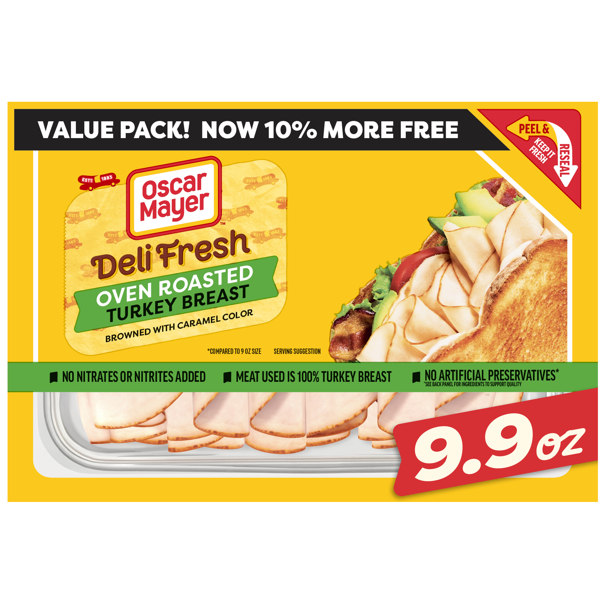 Product Description It's not the deli, it's Deli Fresh. Skip the deli line and enjoy turkey slices you know, love and trust — now in a value pack with 10% more free (compared to 9 oz pack)! Oscar Mayer Deli Fresh Oven Roasted Turkey Breast lunch meat provides pre-sliced quality deli meats, folded just like at the deli, with no artificial preservatives (see ingredient line for ingredients to support quality) and no nitrites or nitrates added. Our cold cuts are great for parents who value convenient, high-protein and satisfying meal solutions. Easily make delicious sandwiches at home, piled high with fully cooked, ready-to-eat 100% turkey breast slices on bread with mayonnaise or your favorite condiments and pre-sliced cheese. Add Oscar Mayer lunch meat to salads, wraps or charcuterie boards, or snack straight from the fridge. Kids, adults and on-the-go parents have the perfect turkey sandwich solution for weekday lunches or family lunches and snacks on the weekends. Busy working adults and families with kids will love easy-to-prepare lunches that save time and reduce stress. Each 9.9-ounce value pack of Oscar Mayer Deli Fresh Oven Roasted sliced turkey breast contains about 5 servings and maintains freshness. Store in the refrigerator and use within 7 days of opening. Keep it Oscar and enjoy Deli Fresh lunch meat without the deli price.