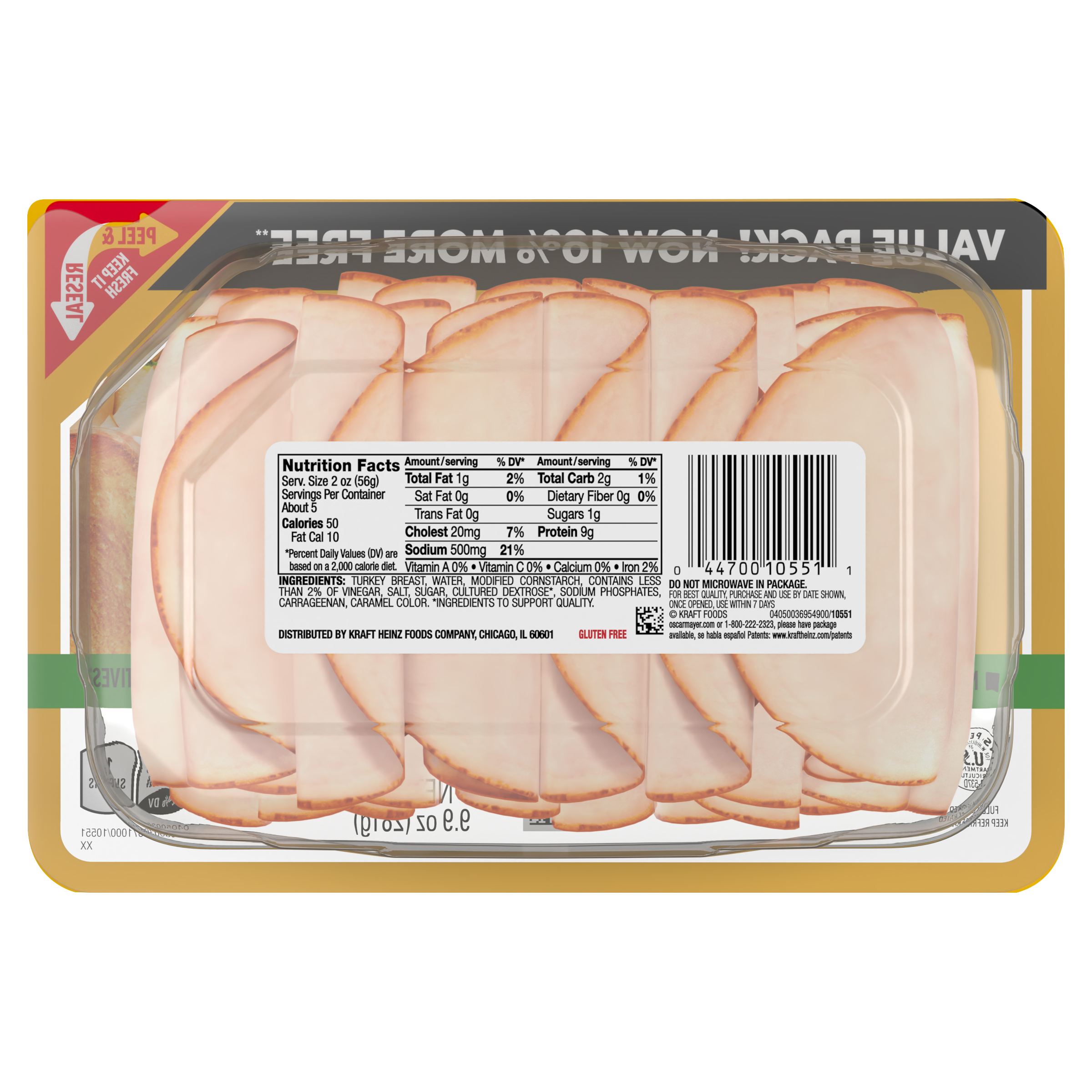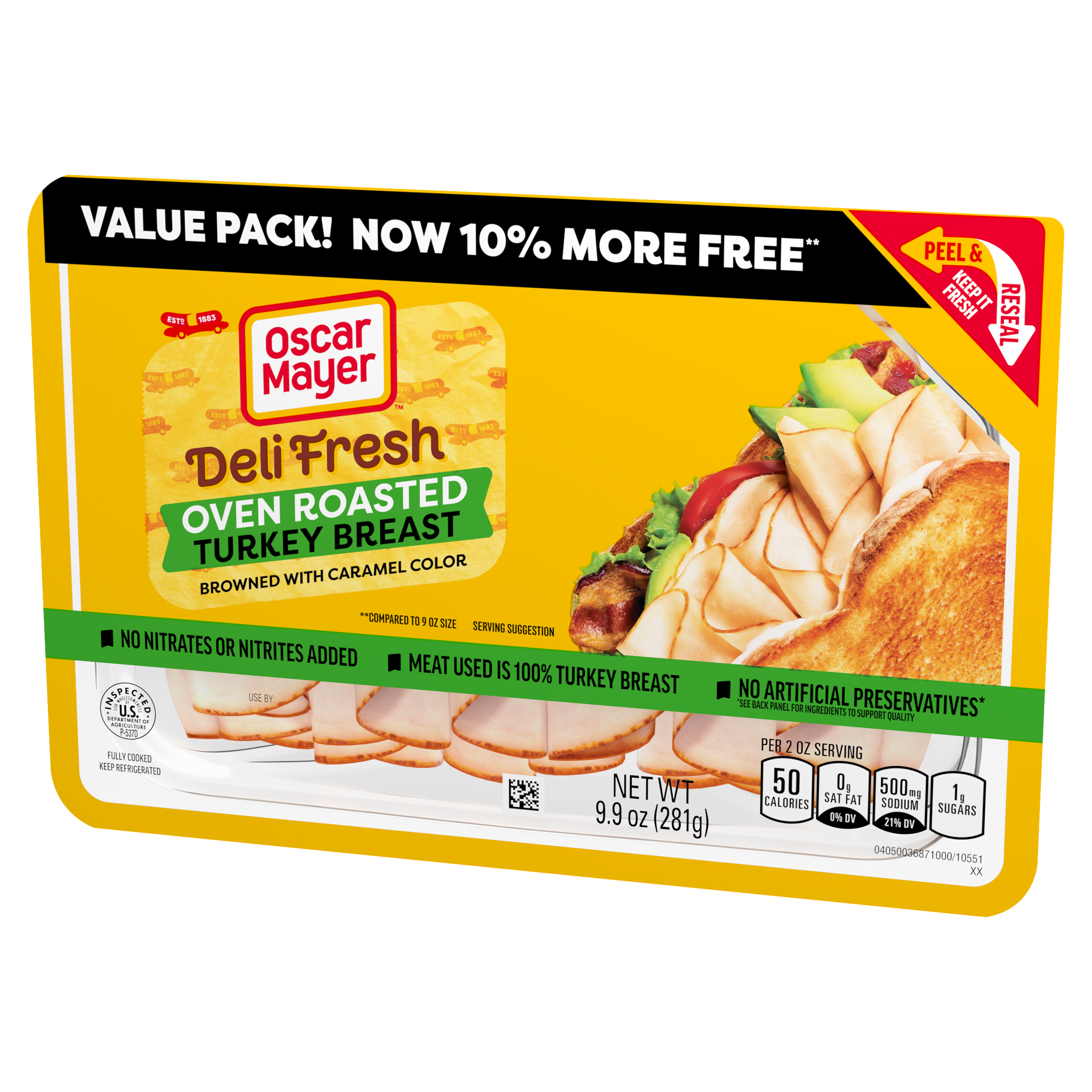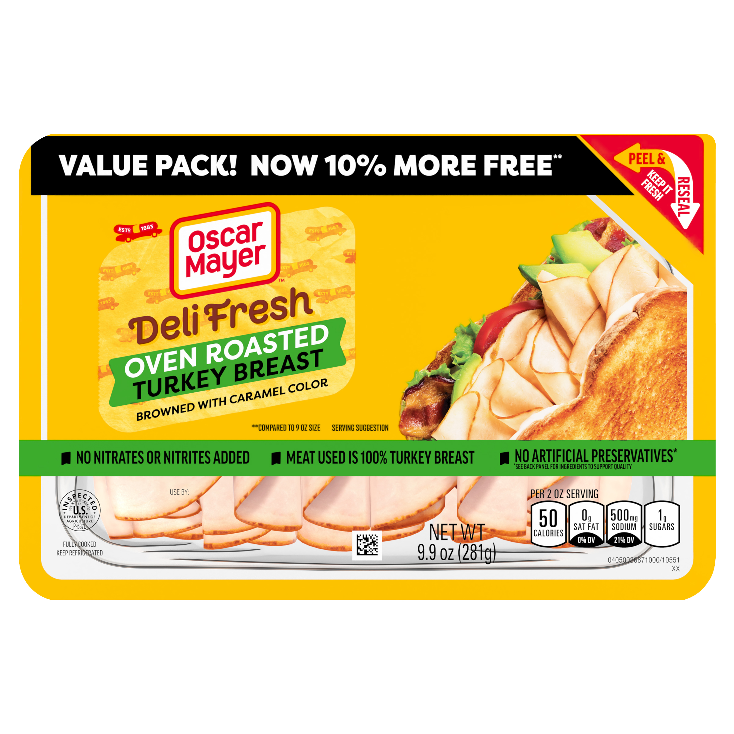 Product Description It's not the deli, it's Deli Fresh. Skip the deli line and enjoy turkey slices you know, love and trust — now in a value pack with 10% more free (compared to 9 oz pack)! Oscar Mayer Deli Fresh Oven Roasted Turkey Breast lunch meat provides pre-sliced quality deli meats, folded just like at the deli, with no artificial preservatives (see ingredient line for ingredients to support quality) and no nitrites or nitrates added. Our cold cuts are great for parents who value convenient, high-protein and satisfying meal solutions. Easily make delicious sandwiches at home, piled high with fully cooked, ready-to-eat 100% turkey breast slices on bread with mayonnaise or your favorite condiments and pre-sliced cheese. Add Oscar Mayer lunch meat to salads, wraps or charcuterie boards, or snack straight from the fridge. Kids, adults and on-the-go parents have the perfect turkey sandwich solution for weekday lunches or family lunches and snacks on the weekends. Busy working adults and families with kids will love easy-to-prepare lunches that save time and reduce stress. Each 9.9-ounce value pack of Oscar Mayer Deli Fresh Oven Roasted sliced turkey breast contains about 5 servings and maintains freshness. Store in the refrigerator and use within 7 days of opening. Keep it Oscar and enjoy Deli Fresh lunch meat without the deli price.