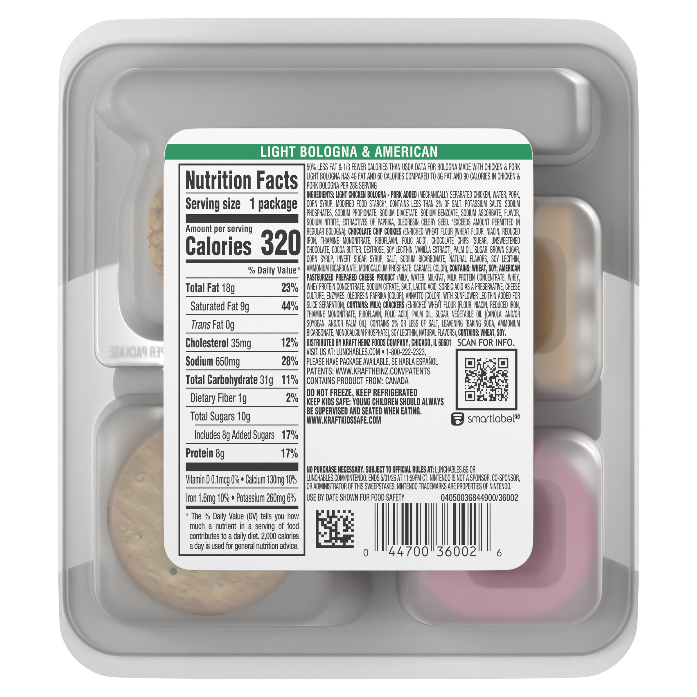 GTIN 00044700360026 Kraft Item Code (SKU) 00447003600270 Product Status Active Pack Level EACH Brand Name Lunchables Business Unit Meat Cheese Coffee & Snacks Catalog Platform Snacking Product Category Lunchables Consumer Unit Size 3.1 Consumer Unit Size UOM OZ Packaging Type (Computed) Pack Packaging Type Code TRAY Packaging Type Code Override (Manual) TRAY Sub Units Per Item 1 Variant Light Bologna & American Sub Variant Light Bologna & American Global Product Classification Mixed Species Meat/Poultry - Prepared/Processed Global Product Classification Code 10006754 Computed Exports - Ingredients LIGHT CHICKEN BOLOGNA - PORK ADDED (MECHANICALLY SEPARATED CHICKEN, WATER, PORK, CORN SYRUP, MODIFIED FOOD STARCH*, CONTAINS LESS THAN 2% OF SALT, POTASSIUM SALTS, SODIUM PHOSPHATES, SODIUM PROPIONATE, SODIUM DIACETATE, SODIUM BENZOATE, SODIUM ASCORBATE, FLAVOR, SODIUM NITRITE, EXTRACTIVES OF PAPRIKA, OLEORESIN CELERY SEED. *EXCEEDS AMOUNT PERMITTED IN REGULAR BOLOGNA); CHOCOLATE CHIP COOKIES (ENRICHED WHEAT FLOUR [WHEAT FLOUR, NIACIN, REDUCED IRON, THIAMINE MONONITRATE, RIBOFLAVIN, FOLIC ACID], CHOCOLATE CHIPS [SUGAR, UNSWEETENED CHOCOLATE, COCOA BUTTER, DEXTROSE, SOY LECITHIN, VANILLA EXTRACT], PALM OIL, SUGAR, BROWN SUGAR, CORN SYRUP, INVERT SUGAR SYRUP, SALT, SODIUM BICARBONATE, NATURAL FLAVORS, SOY LECITHIN, AMMONIUM BICARBONATE, MONOCALCIUM PHOSPHATE, CARAMEL COLOR), CONTAINS: WHEAT, SOY; AMERICAN PASTEURIZED PREPARED CHEESE PRODUCT (MILK, WATER, MILKFAT, MILK PROTEIN CONCENTRATE, WHEY, WHEY PROTEIN CONCENTRATE, SODIUM CITRATE, SALT, LACTIC ACID, SORBIC ACID AS A PRESERVATIVE, CHEESE CULTURE, ENZYMES, OLEORESIN PAPRIKA [COLOR], ANNATTO [COLOR], WITH SUNFLOWER LECITHIN ADDED FOR SLICE SEPARATION), CONTAINS: MILK; CRACKERS (ENRICHED WHEAT FLOUR [FLOUR, NIACIN, REDUCED IRON, THIAMINE MONONITRATE, RIBOFLAVIN, FOLIC ACID], PALM OIL, SUGAR, VEGETABLE OIL [CANOLA, AND/OR SOYBEAN, AND/OR PALM OIL], CONTAINS 2% OR LESS OF SALT, LEAVENING [BAKING SODA, AMMONIUM BICARBONATE, MONOCALCIUM PHOSPHATE], SOY LECITHIN, NATURAL FLAVORS), CONTAINS: WHEAT, SOY. Parent Reference 10044700360023 Quality Statement Use by date shown for food safety Storage Instructions Do Not Freeze | Keep Refrigerated Customer Guarantee 30 Temperature Classification Refrigerated (Meat - USDA) 1 to 4 °C / 35 to 40 °F Temperature Classification Code 02 Net Weight 0.194 Gross Weight 0.228 Weight UOM LB Height (in) 5.75 Length/Depth (in) 1.284 Width (in) 5.332 Case Cube 0.023 Parent Relation CASE_10044700360023 Parent Kraft Item Code (SKU) 00447003600200 Product Title Lunchables Light Bologna & American with Chocolate Chip Cookies, 3.1 oz Pack eCommerce Product Name (Generic Name) Light Bologna & American with Chocolate Chip Cookies Product Benefits (Includes Seasonal + Formatting) - One 3.1 oz pack of Lunchables Light Bologna & American with Chocolate Chip Cookies