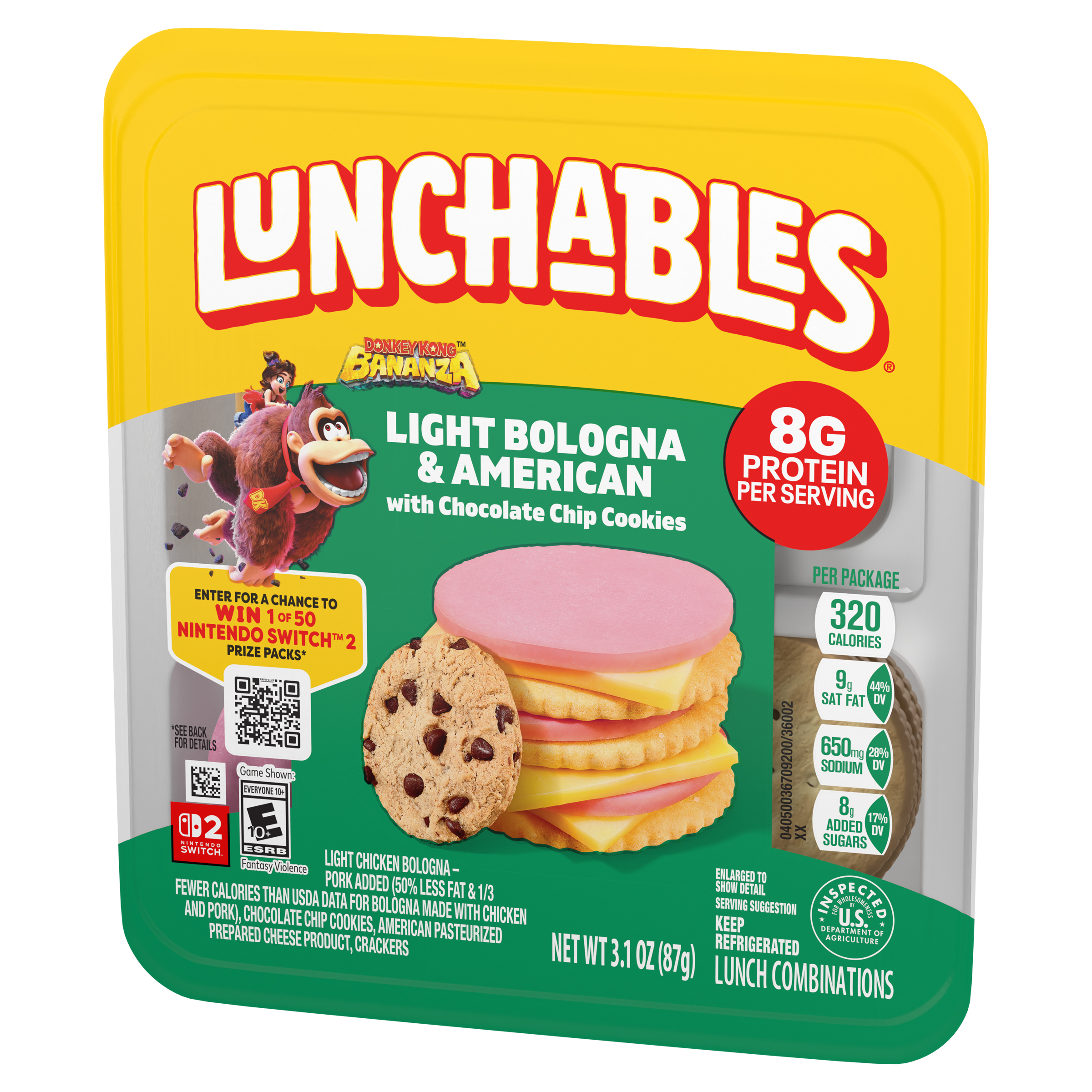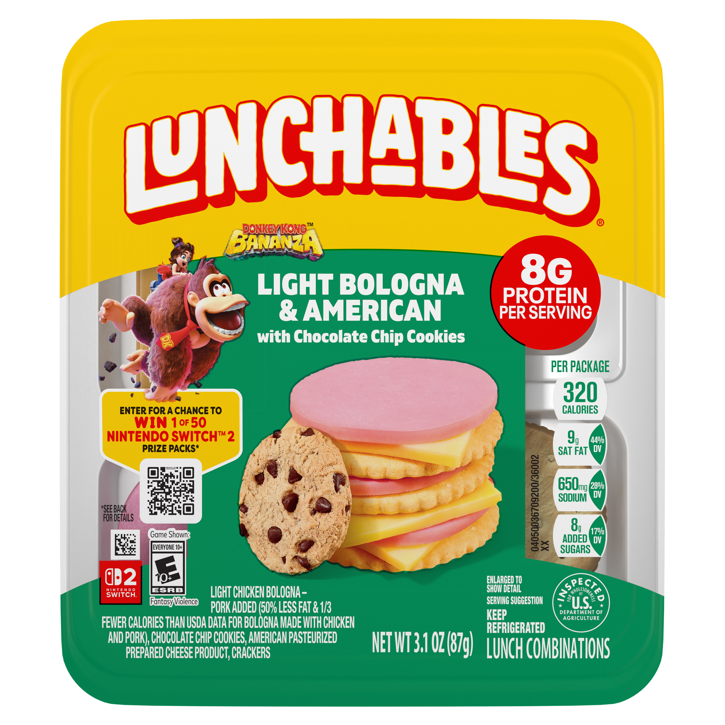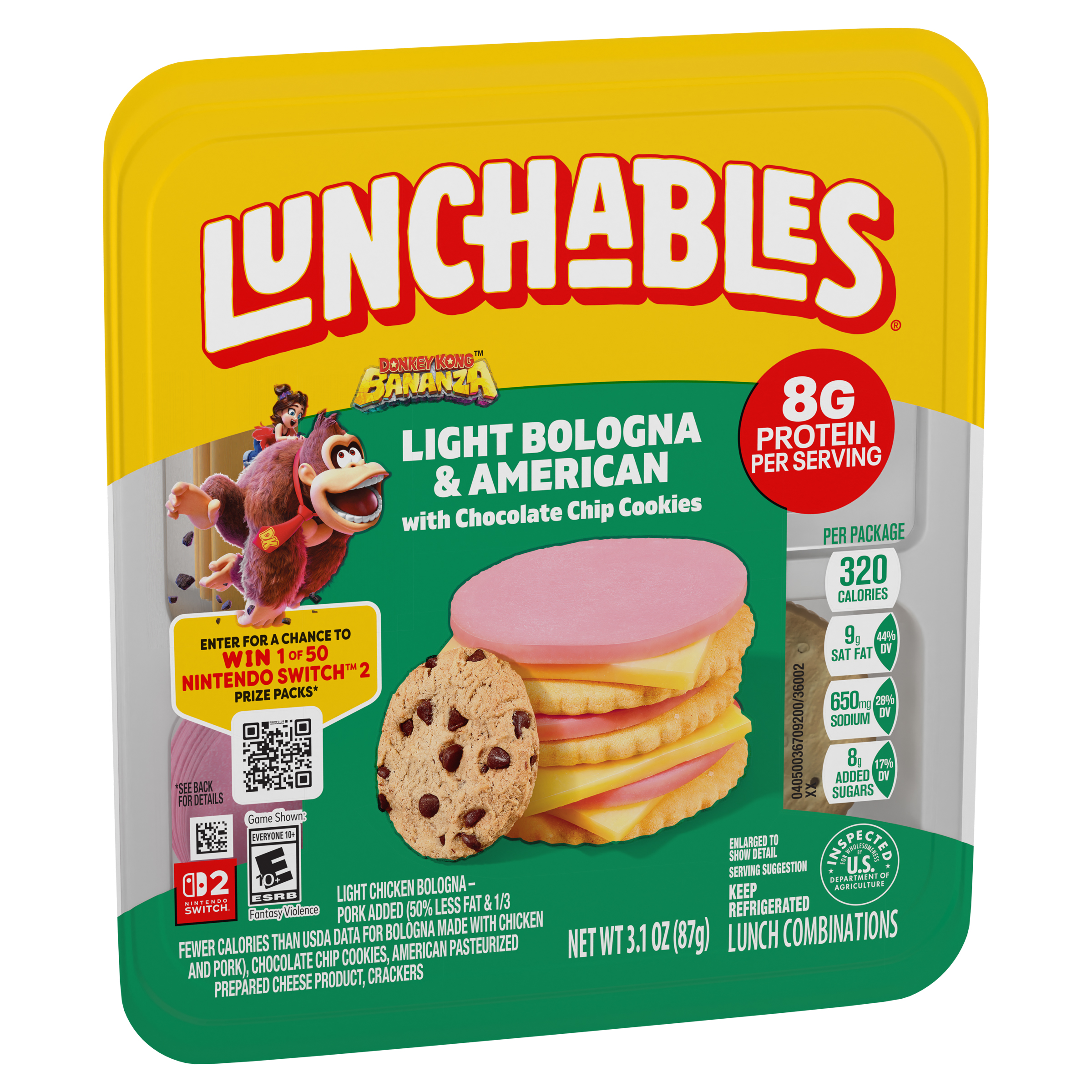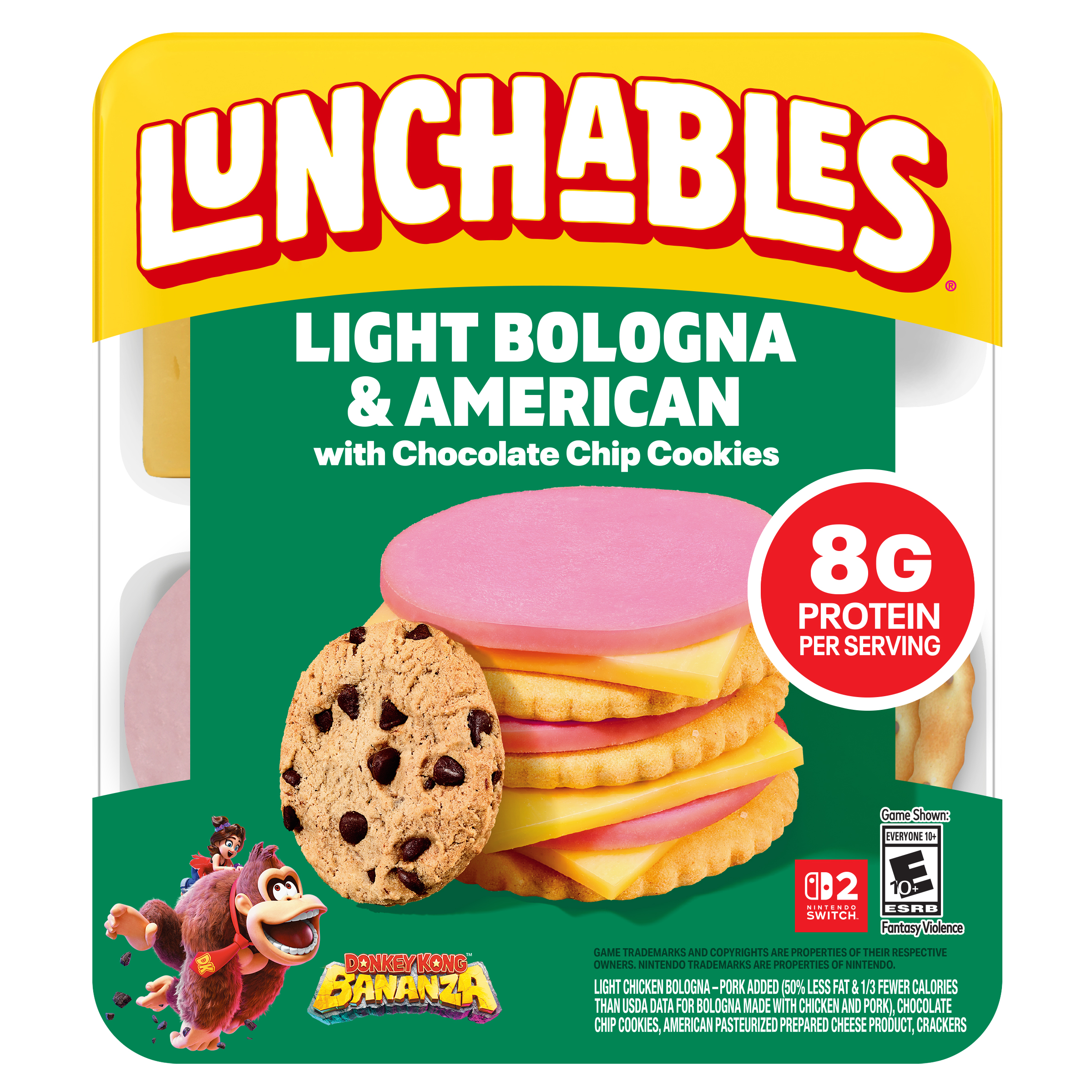Product Description Have fun with lunch! Lunchables Light Bologna & American with Chocolate Chip Cookies lets kids eat it their way — no prep needed! Each 3.1-ounce pack contains light chicken bologna with pork added (50% less fat & 1/3 fewer calories than USDA data for bologna made with chicken & pork) and American pasteurized prepared cheese product that are perfectly paired with buttery, flaky crackers featuring the perfect combo of salty and sweet flavor. For a tasty treat, enjoy delicious chocolate chip cookies. With fun in every bite, each serving contains 8 grams of protein. Our Lunchables kit tastes great and is perfect as part of school lunches, weekend bites or any time hunger strikes. The real win is that kids get to make it and eat it their way! Keep Lunchables refrigerated until you're ready to enjoy.