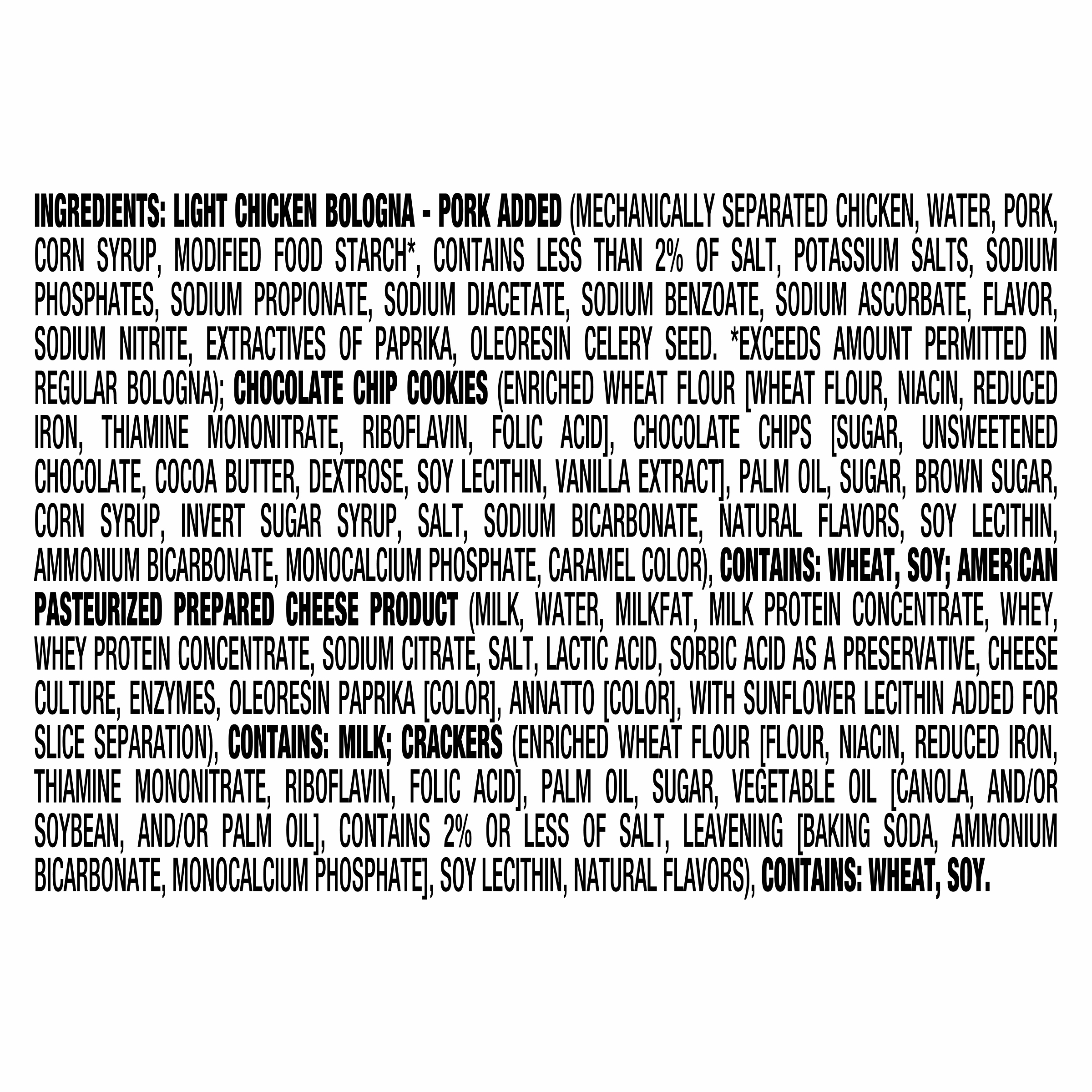 - Contains light chicken bologna with pork added (50% less fat & 1/3 fewer calories than USDA data for bologna made with chicken & pork), American pasteurized prepared cheese product, buttery, flaky crackers and chocolate chip cookies