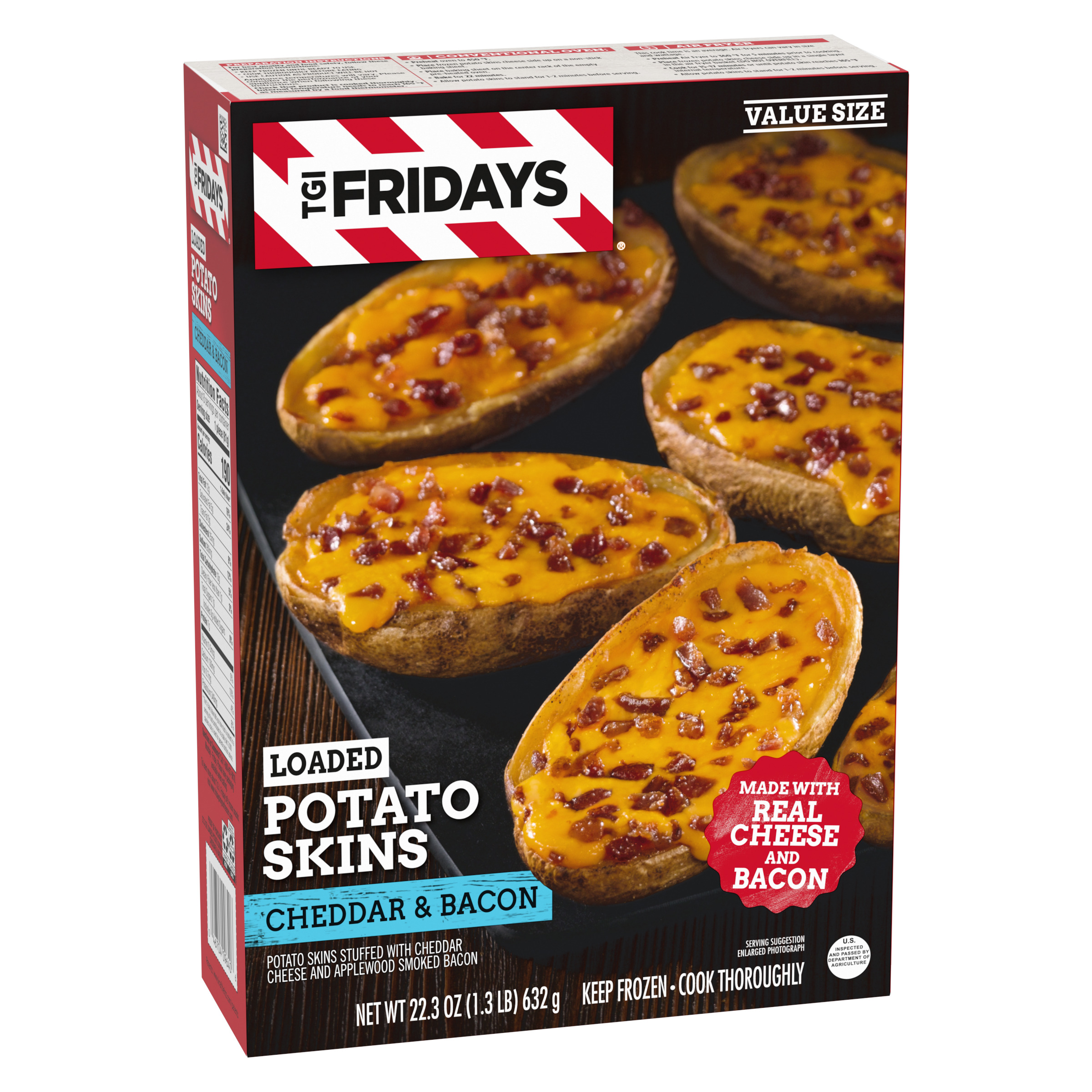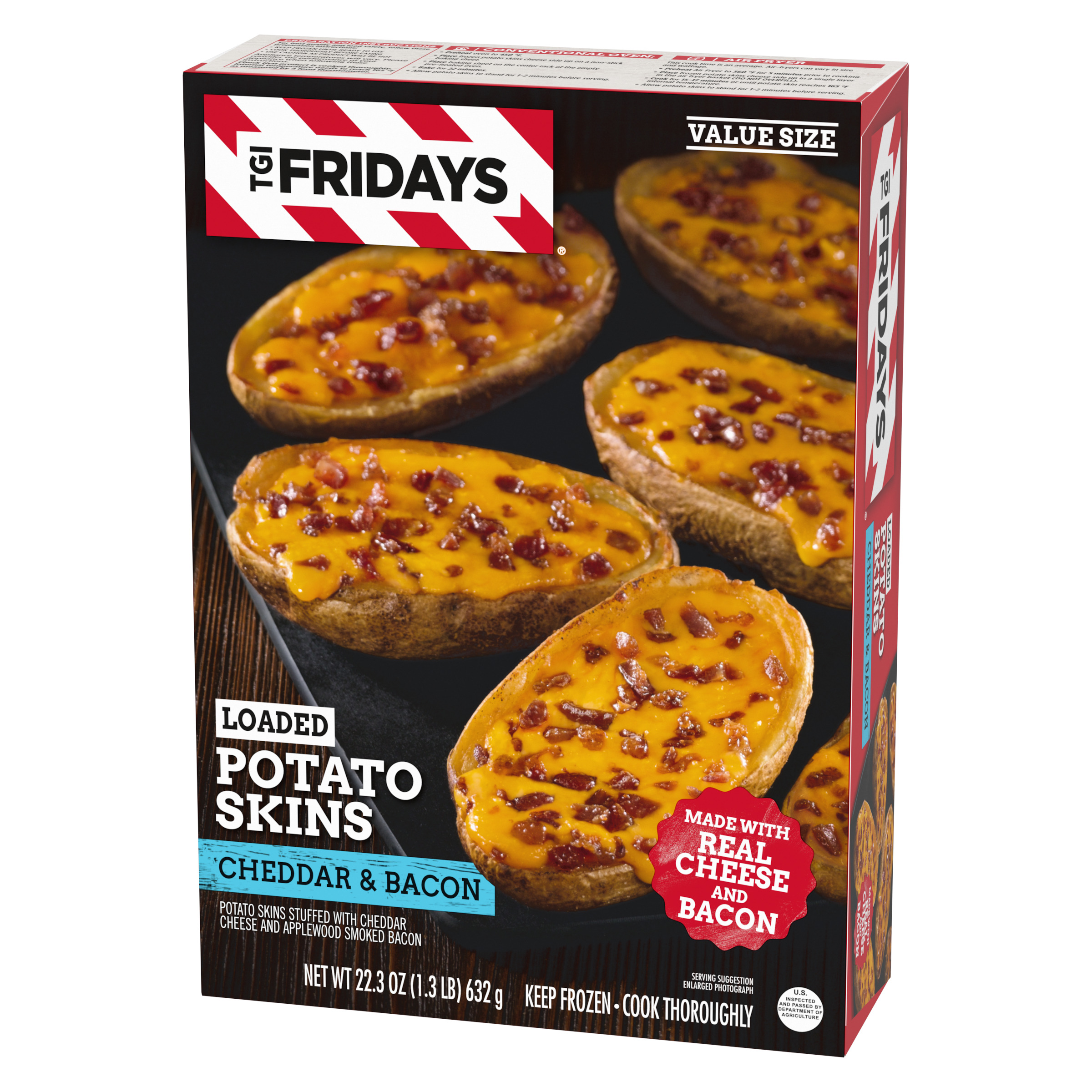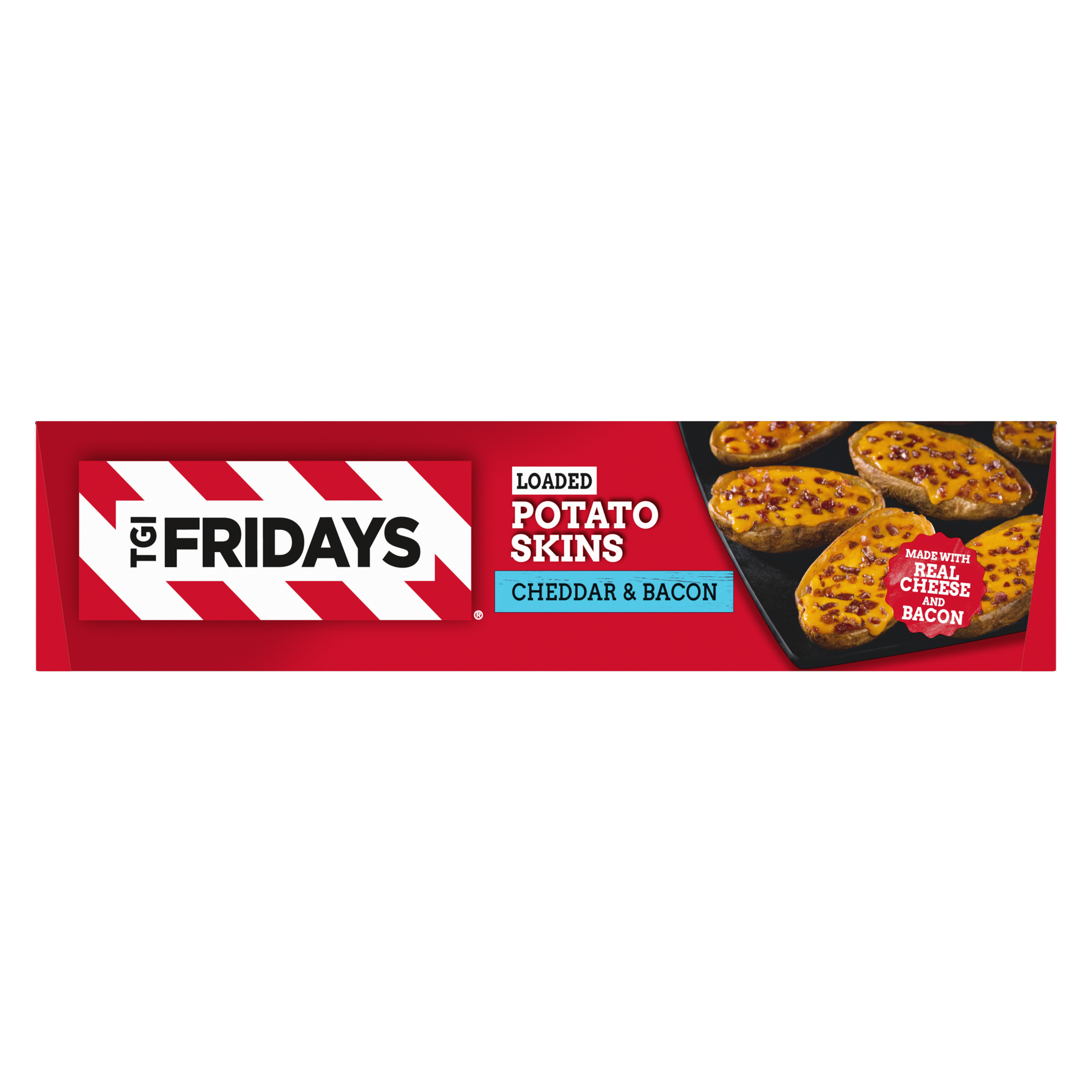 Product Description Enjoy your TGI Fridays menu favorites at home with our easy restaurant style appetizers. Ready to heat, TGI Fridays Loaded Cheddar & Bacon Potato Skins are a quick and delicious appetizer or party food. Our TGIF loaded potato skins are stuffed with real cheese and bacon. Packaged in a box for convenient storage, our potato skins heat quickly in the oven or air fryer. Store our 22.3 ounce box of potato skins in the freezer until ready to prepare. Whether you’re craving potato skins, spinach artichoke dip, chicken bites and wings, mozzarella sticks, sliders or jalapeno poppers, TGI Fridays has frozen appetizers the whole family will enjoy.