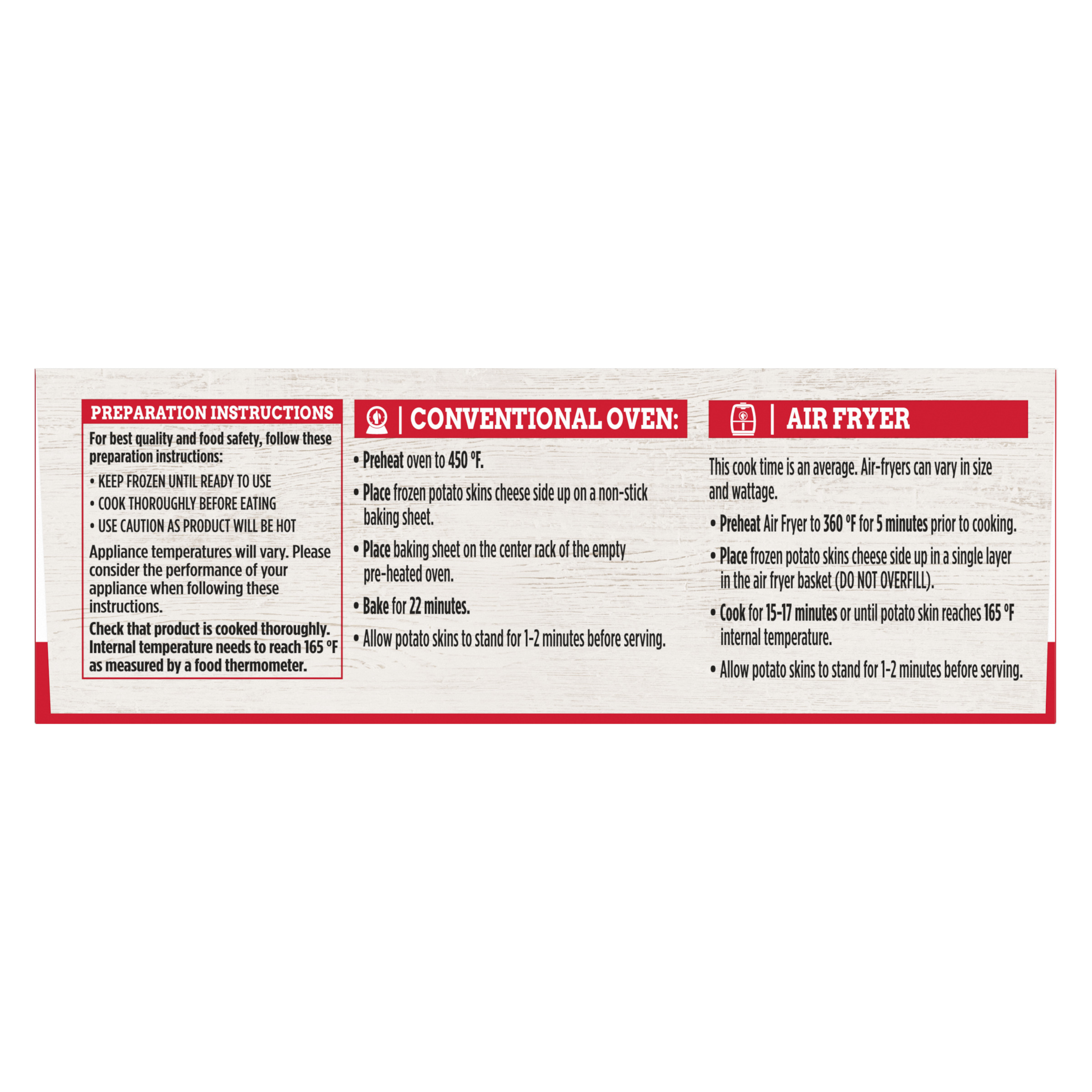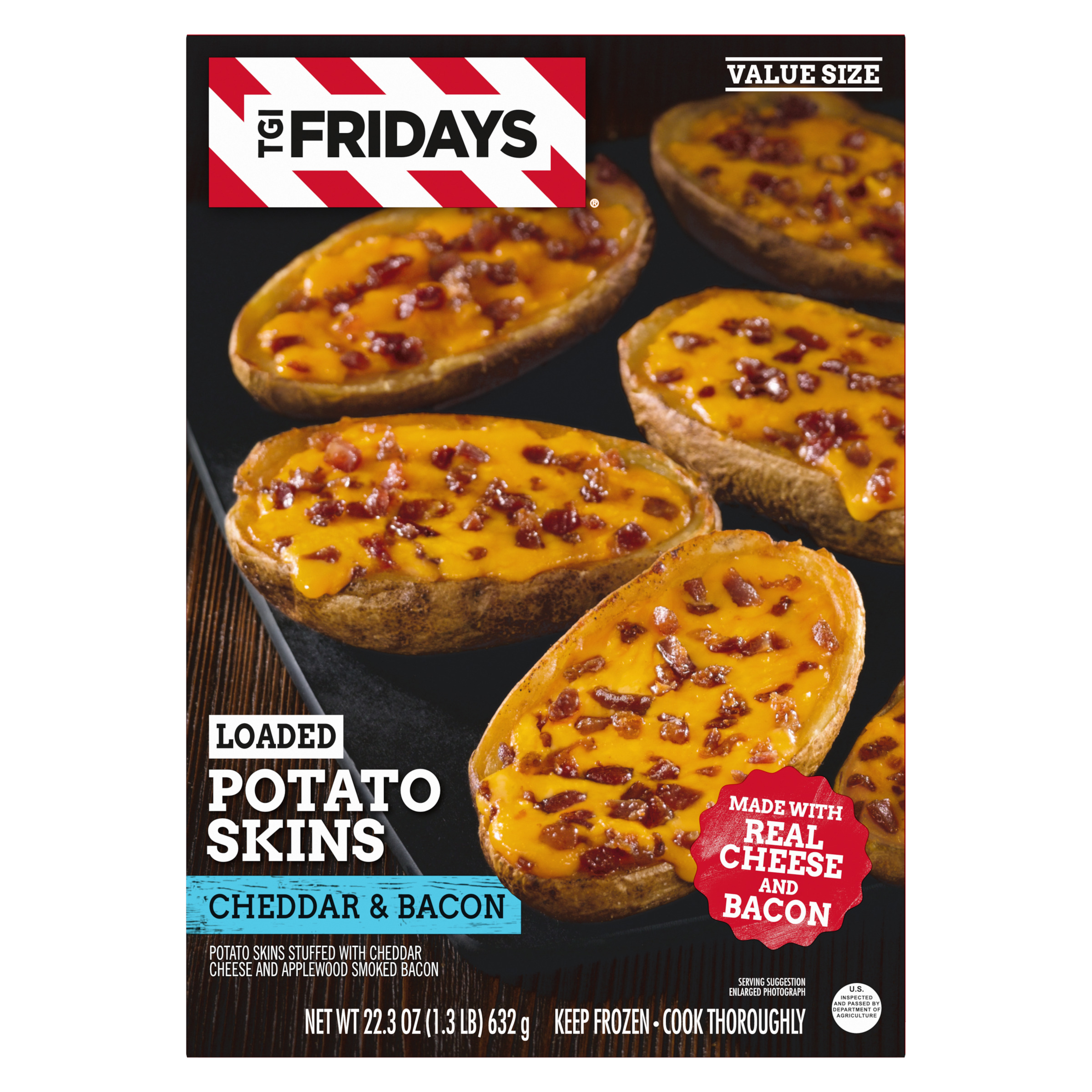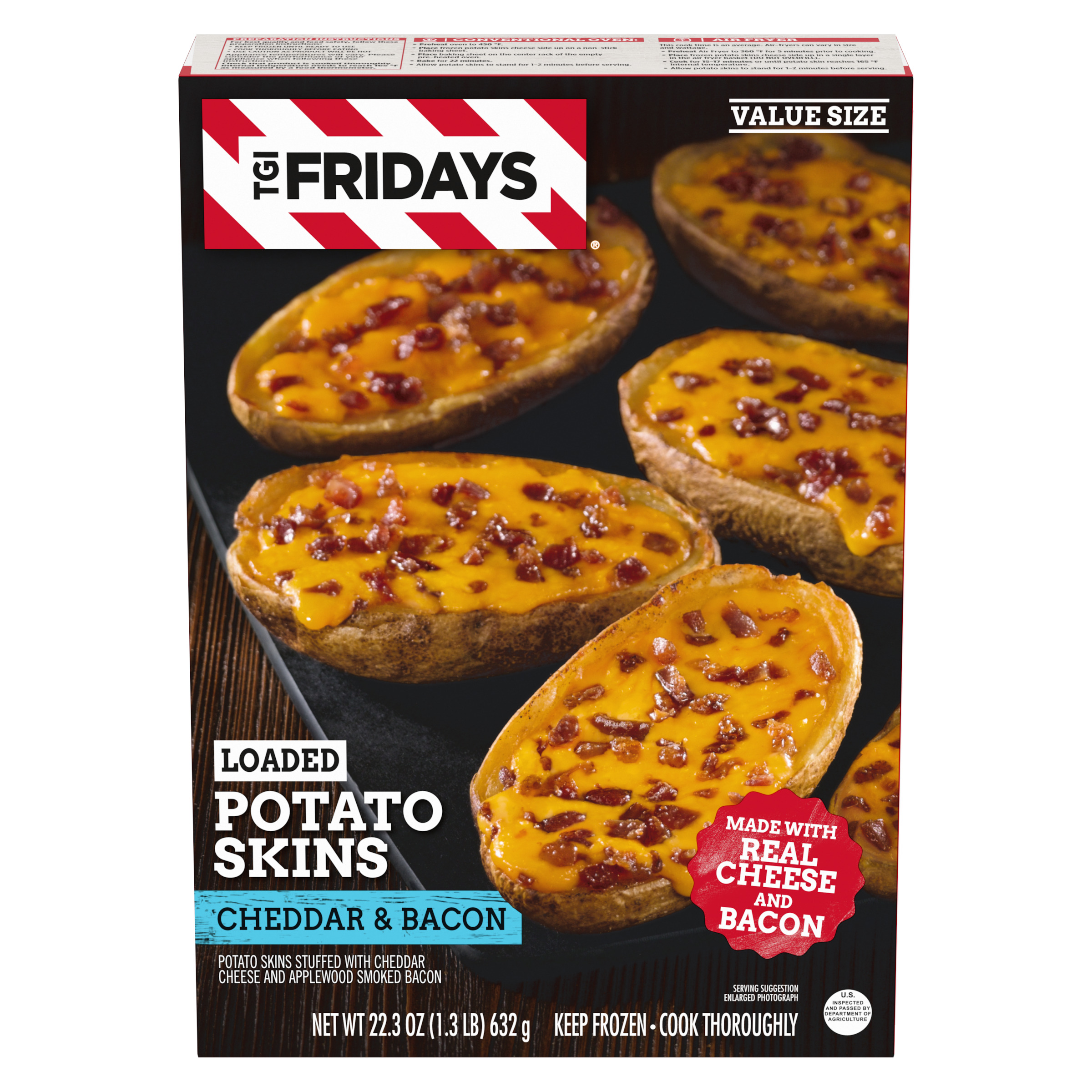 Product Description Enjoy your TGI Fridays menu favorites at home with our easy restaurant style appetizers. Ready to heat, TGI Fridays Loaded Cheddar & Bacon Potato Skins are a quick and delicious appetizer or party food. Our TGIF loaded potato skins are stuffed with real cheese and bacon. Packaged in a box for convenient storage, our potato skins heat quickly in the oven or air fryer. Store our 22.3 ounce box of potato skins in the freezer until ready to prepare. Whether you’re craving potato skins, spinach artichoke dip, chicken bites and wings, mozzarella sticks, sliders or jalapeno poppers, TGI Fridays has frozen appetizers the whole family will enjoy.