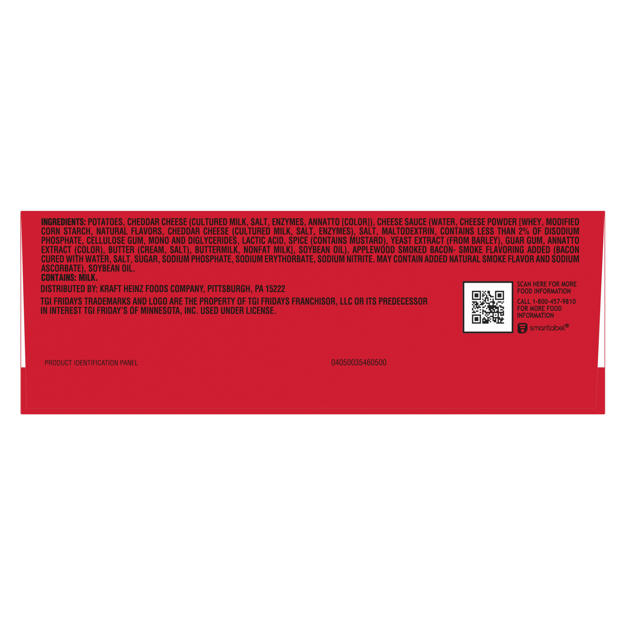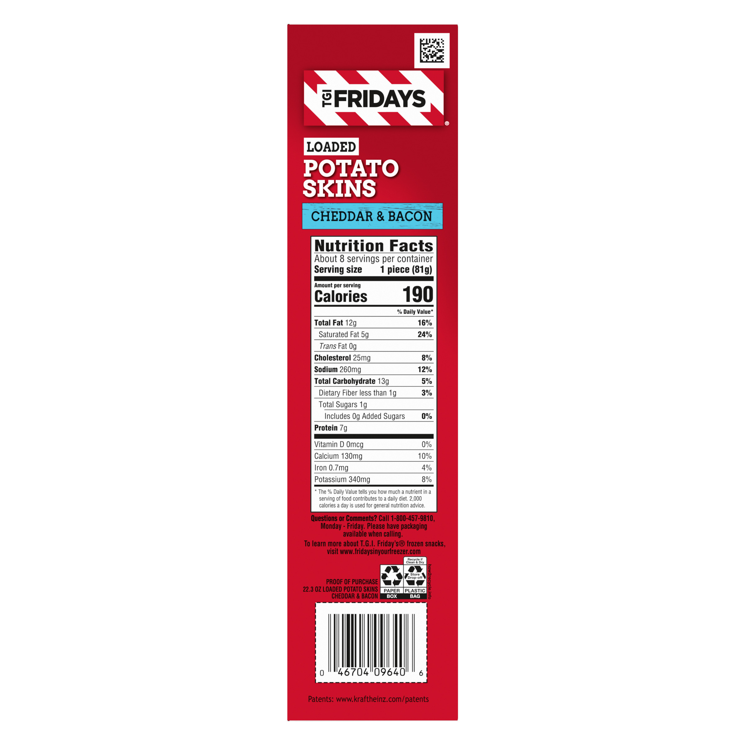 GTIN 00046704096406 Kraft Item Code (SKU) 00467040964070 Product Status Active Pack Level EACH Brand Name TGIF Business Unit Hydration Desserts & Meals Catalog Platform Easy Ready Meals Product Category Frozen Snacks Consumer Unit Size 22.3 Consumer Unit Size UOM OZ Packaging Type (Computed) Box Packaging Type Code BOX/CARTON Packaging Type Code Override (Manual) BOX Sub Units Per Item 1 Variant Cheddar And Bacon Global Product Classification Vegetable Based Products - Not Ready to Eat (Frozen) Global Product Classification Code 10000254 Computed Exports - Ingredients POTATOES, CHEDDAR CHEESE (CULTURED MILK, SALT, ENZYMES, ANNATTO [COLOR]), CHEESE SAUCE (WATER, CHEESE POWDER [WHEY, MODIFIED CORNSTARCH, NATURAL FLAVORS, CHEDDAR CHEESE (CULTURED MILK, SALT, ENZYMES), SALT, MALTODEXTRIN, CONTAINS LESS THAN 2% OF DISODIUM PHOSPHATE, CELLULOSE GUM, MONO AND DIGLYCERIDES, LACTIC ACID, SPICE (CONTAINS MUSTARD), YEAST EXTRACT (FROM BARLEY), GUAR GUM, ANNATTO EXTRACT (COLOR), BUTTER (CREAM, SALT), BUTTERMILK, NONFAT MILK], SOYBEAN OIL), APPLEWOOD SMOKED BACON - SMOKE FLAVORING ADDED (BACON CURED WITH WATER, SALT, SUGAR, SODIUM PHOSPHATE, SODIUM ERYTHORBATE, SODIUM NITRITE. MAY CONTAIN ADDED NATURAL SMOKE FLAVOR AND SODIUM ASCORBATE), SOYBEAN OIL. Parent Reference 00046704620106 Storage Instructions Keep frozen until ready to use Customer Guarantee 180 Temperature Classification Frozen Storage -30 to -18 °C / -22 to 0 °F Temperature Classification Code 08 Net Weight 1.394 Gross Weight 1.56 Weight UOM LB Height (in) 9.947 Length/Depth (in) 2.474 Width (in) 7.054 Case Cube 0.1 Parent Relation CASE_00046704620106 Parent Kraft Item Code (SKU) 00467046201000 Product Title TGI Fridays Loaded Cheddar & Bacon Potato Skins Value Size Frozen Snacks, 22.3 oz Box eCommerce Product Name (Generic Name) Loaded Cheddar & Bacon Potato Skins Value Size Frozen Snacks Product Benefits (Includes Seasonal + Formatting) - One 22.3 oz box of TGI Fridays Frozen Appetizers Loaded Cheddar & Bacon Potato Skins, containing about 8 servings