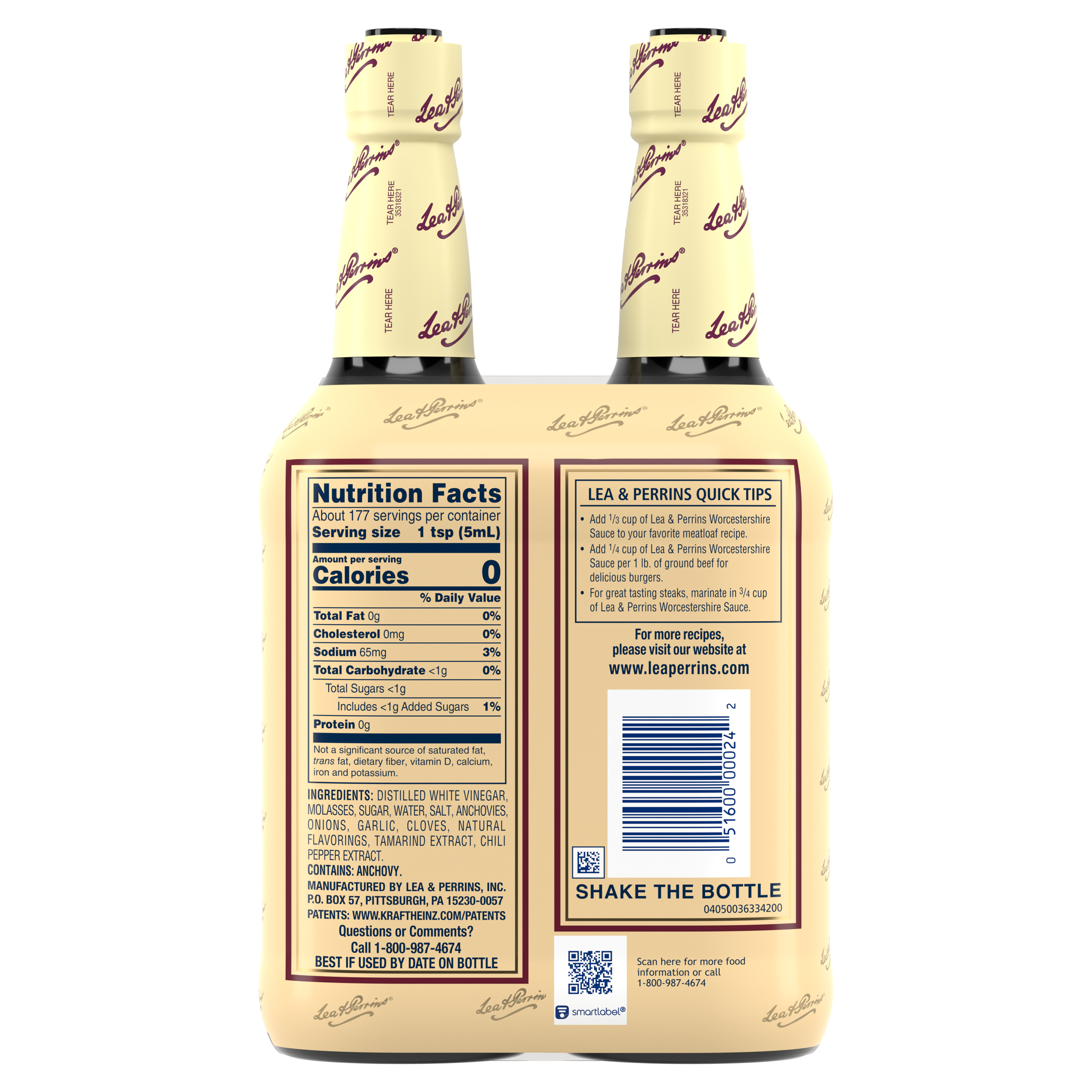 GTIN 00051600000242 Kraft Item Code (SKU) 00516000002470 Product Status Active Pack Level EACH Brand Name Lea & Perrins Business Unit Elevation Catalog Platform Taste Elevation Product Category All Other Condiments and Sauces Consumer Unit Size 30 Consumer Unit Size UOM FO Packaging Type (Computed) Bottle Packaging Type Code BOTTLE Packaging Type Code Override (Manual) PACK Sub Units Per Item 1 Lowest Level Side Override (Manual) 15 fl oz Bottles Global Product Classification Sauces Dipping/Condiments/Savoury Toppings/Savoury Spreads/Marinades (Shelf Stable) Global Product Classification Code 10000280 Computed Exports - Ingredients DISTILLED WHITE VINEGAR, MOLASSES, SUGAR, WATER, SALT, ONIONS, ANCHOVIES, GARLIC, CLOVES, TAMARIND EXTRACT, NATURAL FLAVORINGS, CHILI PEPPER EXTRACT. Parent Reference 10051600000249 Customer Guarantee 180 Temperature Classification Ambient Prevailing Conditions Temperature Classification Code 01 Net Weight 1.875 Gross Weight 3.502 Weight UOM LB Height (in) 9.593 Length/Depth (in) 2.648 Width (in) 5.29 Case Cube 0.078 Parent Relation CASE_10051600000249 Parent Kraft Item Code (SKU) 00516000002400 Product Title Lea & Perrins The Original Worcestershire Sauce, 2 ct. Pack, 15 fl. oz. Bottles eCommerce Product Name (Generic Name) The Original Worcestershire Sauce Product Benefits (Includes Seasonal + Formatting) - Two 15 fl oz bottles of Lea & Perrins The Original Worcestershire Sauce