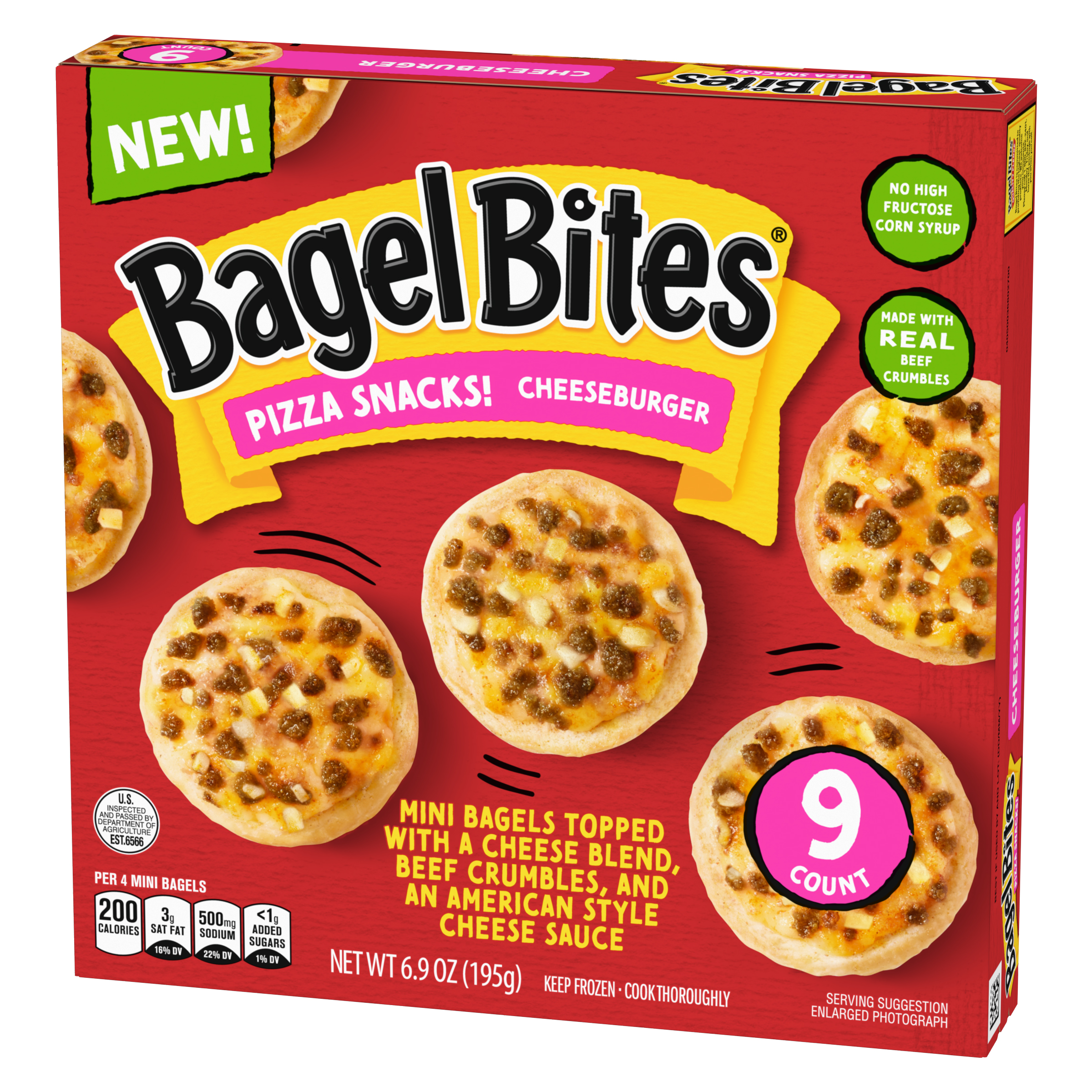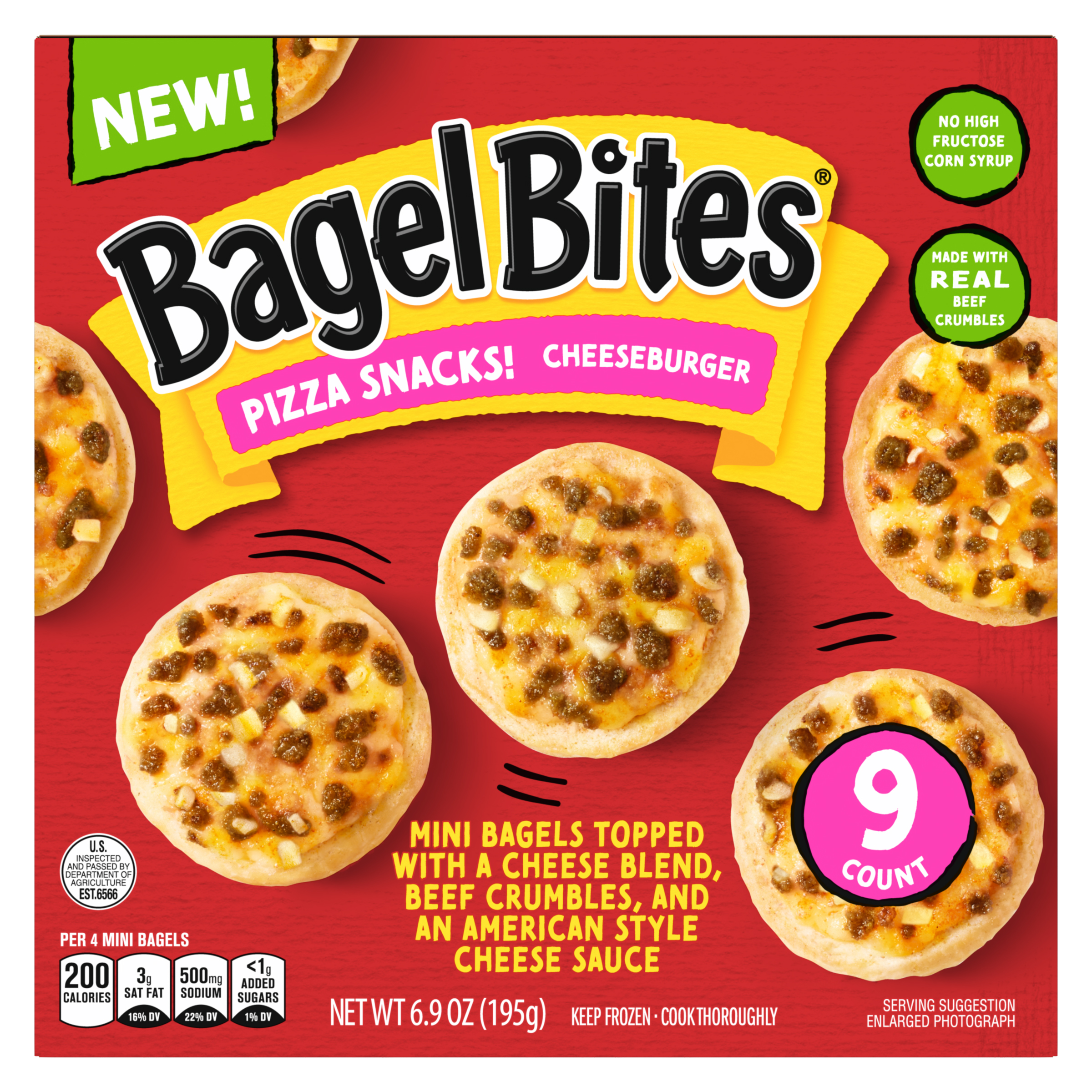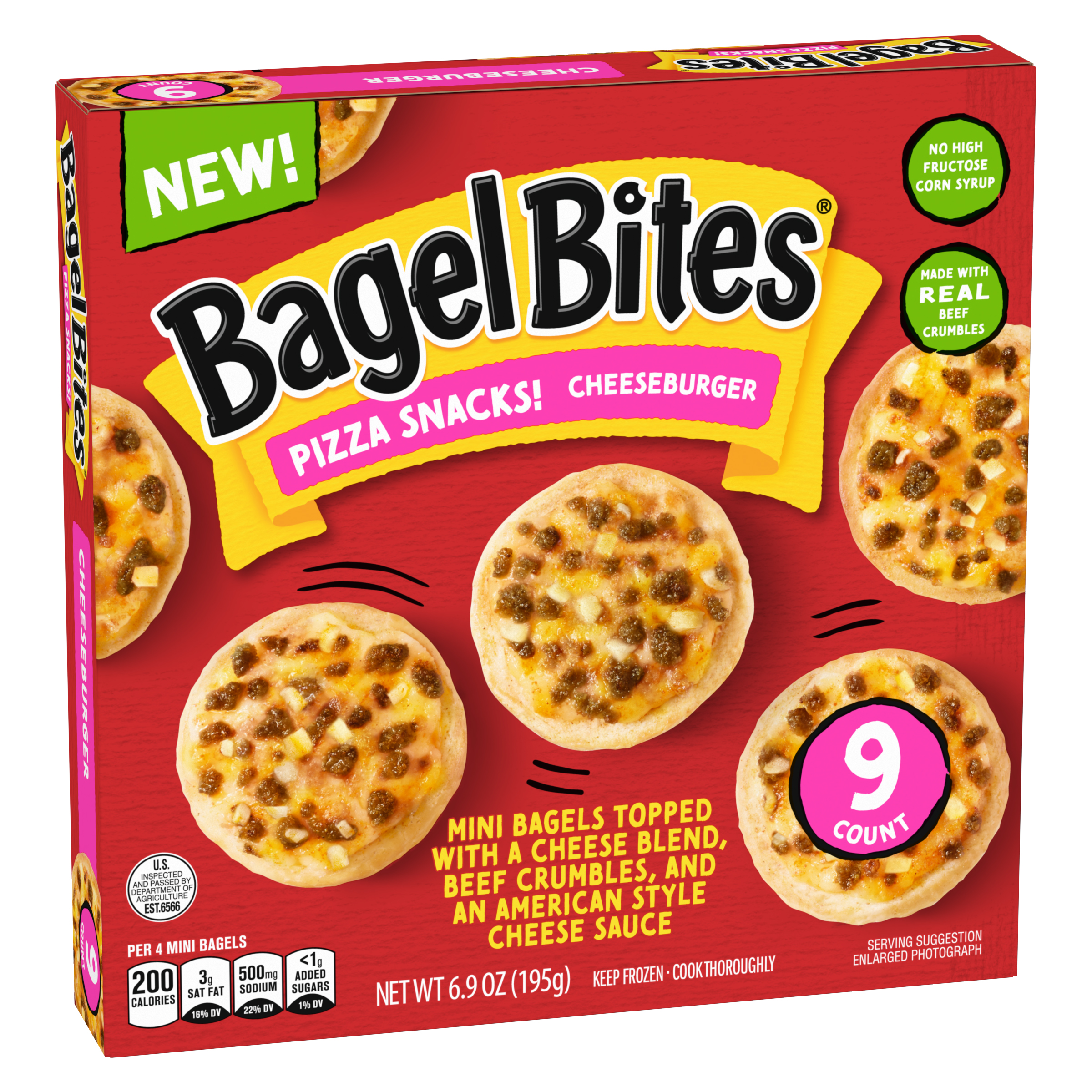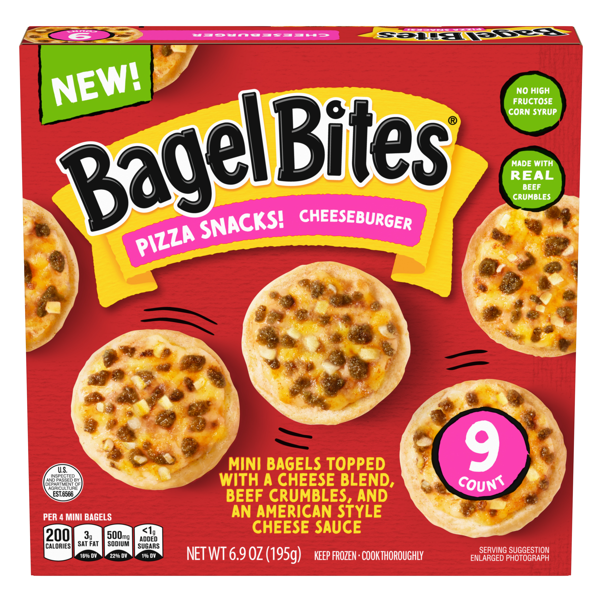 Product Description We took bagels. We took pizza. We fused them together and the rest is history. Enjoy a blast from the past with our fan-favorite Bagel Bites Cheeseburger Mini Bagels. Our nostalgic 90s snacks are topped with a cheese blend, real beef crumbles and an American style cheese sauce, and contain no high-fructose corn syrup. Bagel Bites are a satisfying combination that always hits the spot, and now you can share your favorite childhood variety with your teens and kids. They can enjoy our finger foods at home whenever the craving hits. Our delicious mini pizzas are perfect kids' snacks, great for weekend hangouts or late-night snacking. Looking for family-friendly frozen snacks and appetizers to serve as an easy dinner or game-day appetizer? Grab a box of Bagel Bites, your favorite condiments and dipping sauces, and enjoy! Each box of cheeseburger Bagel Bites comes with a convenient crisping tray for easy preparation in your microwave. Want 'em crispier? Pop them in the oven, air fryer or toaster oven. Each 6.9-ounce box contains about 2.5 servings. Keep our personal pizza bites frozen until ready to prepare. Stock your freezer with our 9-count box of Bagel Bites Mini Pizza Bagels, so you always have convenient snacks on hand when your busy schedule calls for a quick and easy afternoon or weekend bite. Snack without limits with Bagel Bites Cheeseburger Mini Pizza Bagel Frozen Snacks.
