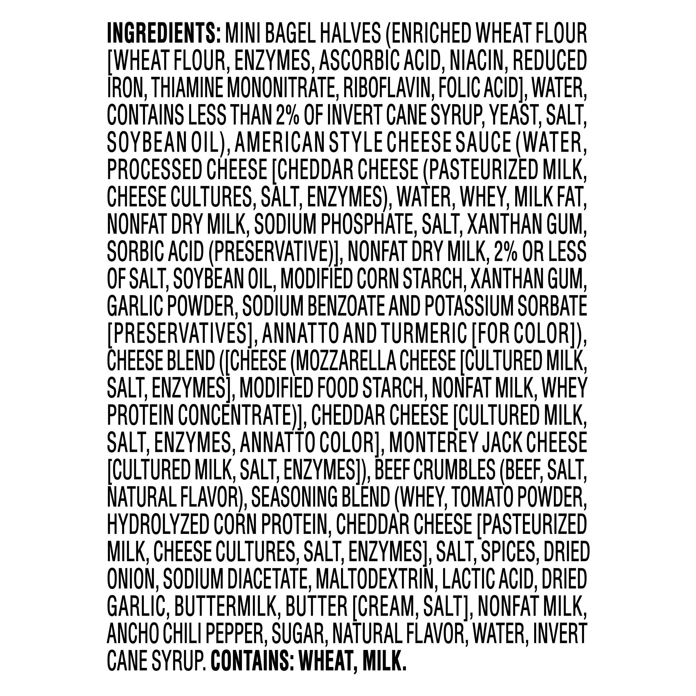 - BAGEL BITES CHEESEBURGER: Delicious mini bagels topped with a cheese blend, real beef crumbles and an American style cheese sauce