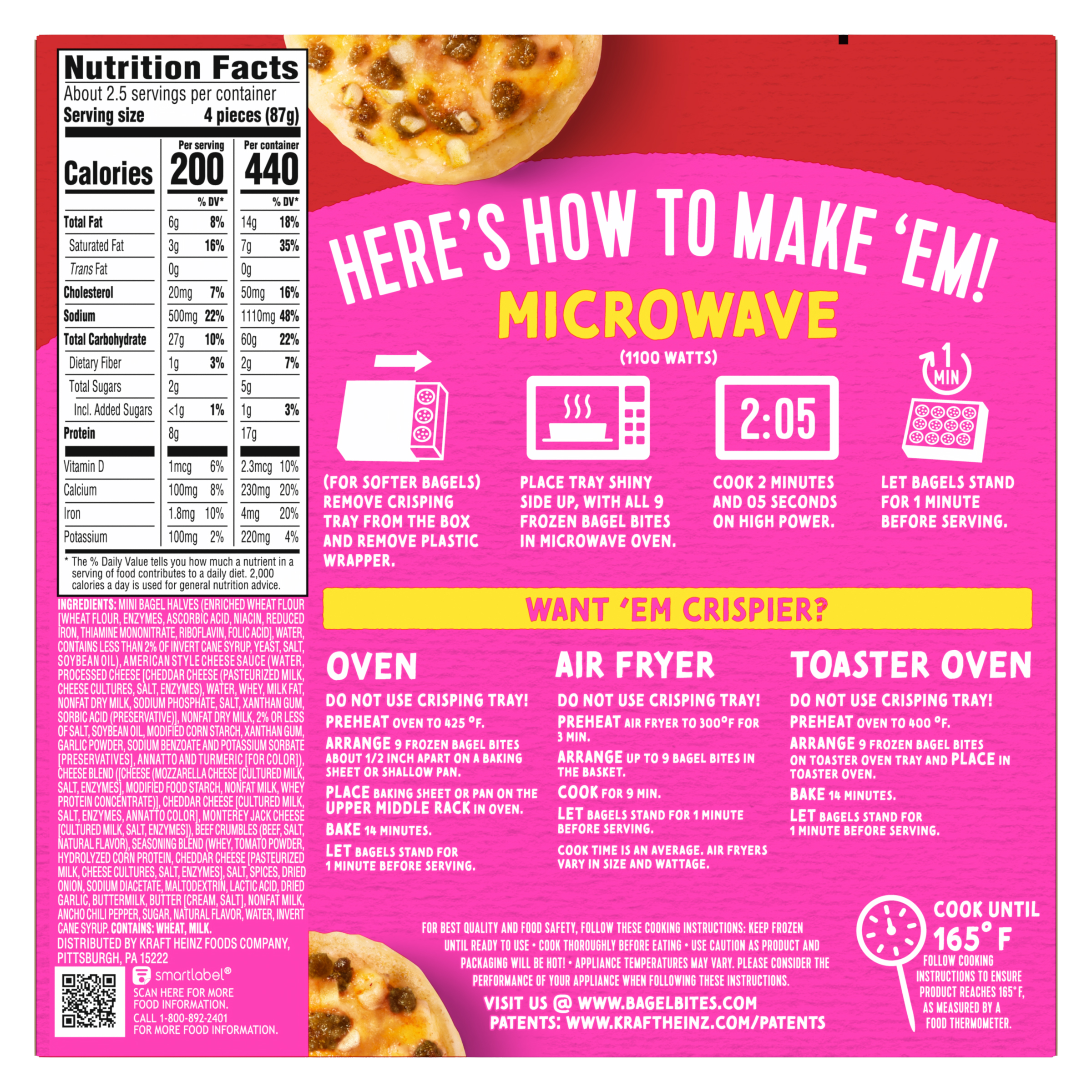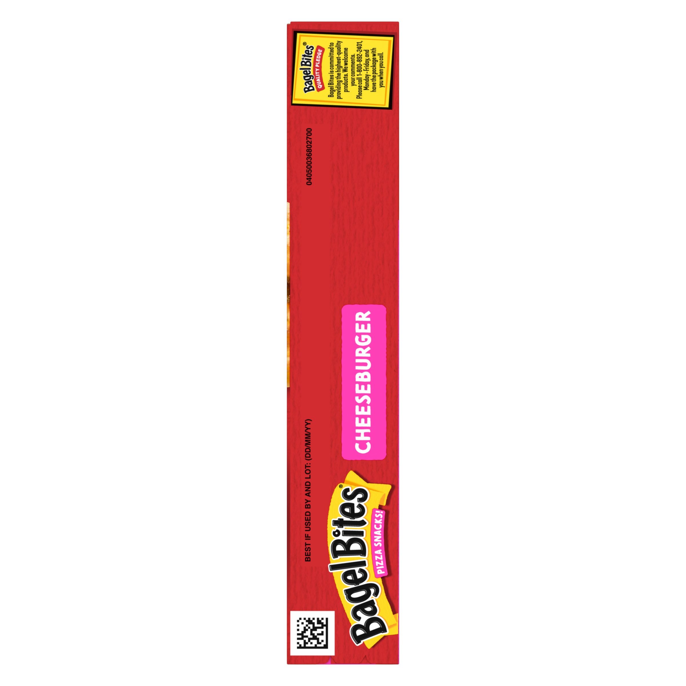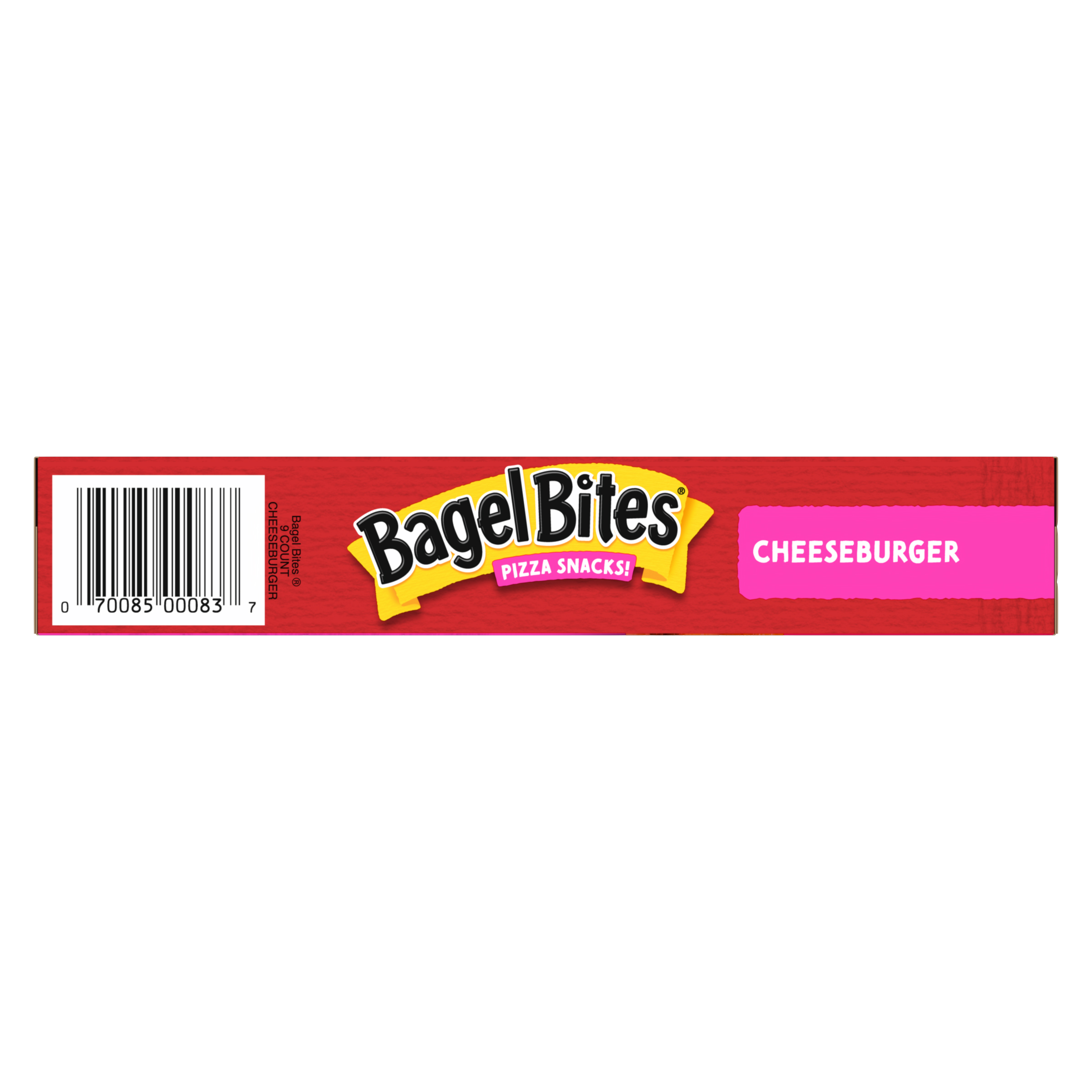 GTIN 00070085000837 Kraft Item Code (SKU) 00700850008370 Product Status Active Pack Level EACH Brand Name Bagel Bites Business Unit Hydration Desserts & Meals Catalog Platform Easy Ready Meals Product Category Frozen Snacks Consumer Unit Size 6.9 Consumer Unit Size UOM OZ Packaging Type (Computed) Box Packaging Type Code BOX/CARTON Packaging Type Code Override (Manual) BOX/CARTON Sub Units Per Item 1 Variant CHEESEBURGER Global Product Classification Code 10000248 Computed Exports - Ingredients MINI BAGEL HALVES (ENRICHED WHEAT FLOUR [WHEAT FLOUR, ENZYMES, ASCORBIC ACID, NIACIN, REDUCED IRON, THIAMINE MONONITRATE, RIBOFLAVIN, FOLIC ACID], WATER, CONTAINS LESS THAN 2% OF INVERT CANE SYRUP, YEAST, SALT, SOYBEAN OIL), AMERICAN STYLE CHEESE SAUCE (WATER, PROCESSED CHEESE [CHEDDAR CHEESE (PASTEURIZED MILK, CHEESE CULTURES, SALT, ENZYMES), WATER, WHEY, MILK FAT, NONFAT DRY MILK, SODIUM PHOSPHATE, SALT, XANTHAN GUM, SORBIC ACID (PRESERVATIVE)], NONFAT DRY MILK, 2% OR LESS OF SALT, SOYBEAN OIL, MODIFIED CORN STARCH, XANTHAN GUM, GARLIC POWDER, SODIUM BENZOATE AND POTASSIUM SORBATE [PRESERVATIVES], ANNATTO AND TURMERIC [FOR COLOR]), CHEESE BLEND ([CHEESE (MOZZARELLA CHEESE [CULTURED MILK, SALT, ENZYMES], MODIFIED FOOD STARCH, NONFAT MILK, WHEY PROTEIN CONCENTRATE)], CHEDDAR CHEESE [CULTURED MILK, SALT, ENZYMES, ANNATTO COLOR], MONTEREY JACK CHEESE [CULTURED MILK, SALT, ENZYMES]), BEEF CRUMBLES (BEEF, SALT, NATURAL FLAVOR), SEASONING BLEND (WHEY, TOMATO POWDER, HYDROLYZED CORN PROTEIN, CHEDDAR CHEESE [PASTEURIZED MILK, CHEESE CULTURES, SALT, ENZYMES], SALT, SPICES, DRIED ONION, SODIUM DIACETATE, MALTODEXTRIN, LACTIC ACID, DRIED GARLIC, BUTTERMILK, BUTTER [CREAM, SALT], NONFAT MILK, ANCHO CHILI PEPPER, SUGAR, NATURAL FLAVOR, WATER, INVERT CANE SYRUP. Parent Reference 10070085000834 Quality Statement BEST IF USED BY AND LOT: (DD/MM/YY) Storage Instructions Keep Frozen Customer Guarantee 120 Temperature Classification Code 08 Net Weight 0.431 Gross Weight 0.531 Weight UOM LB Height (in) 1.25 Length/Depth (in) 7.25 Width (in) 7.25 Case Cube 0.038 Parent Relation CASE_10070085000834 Parent Kraft Item Code (SKU) 00700850008300 Product Title Bagel Bites Cheeseburger Mini Bagel Pizza Snacks, 9 ct, 6.9 oz Box eCommerce Product Name (Generic Name) Cheeseburger Mini Bagel Pizza Snacks Product Benefits (Includes Seasonal + Formatting) - BAGEL BITES FROZEN SNACKS: One 9 ct box of Bagel Bites Cheeseburger Mini Bagels