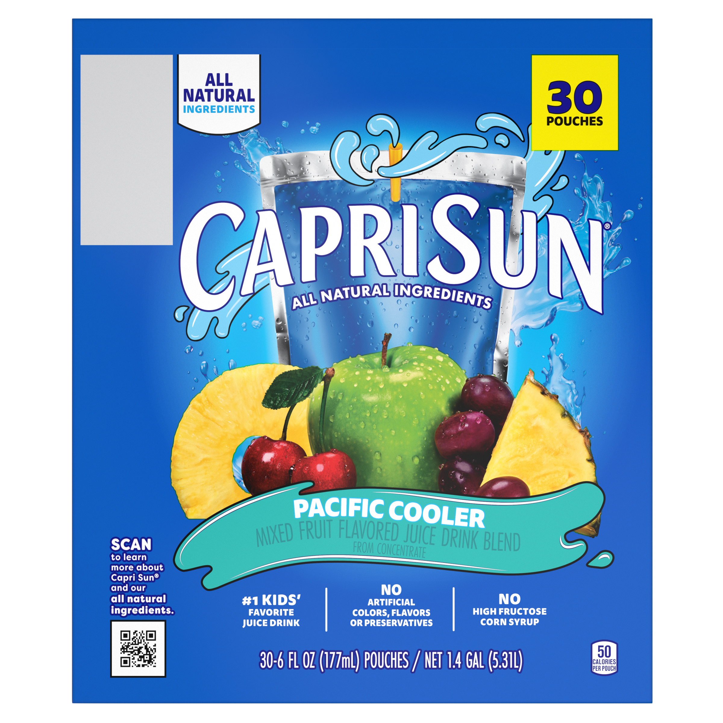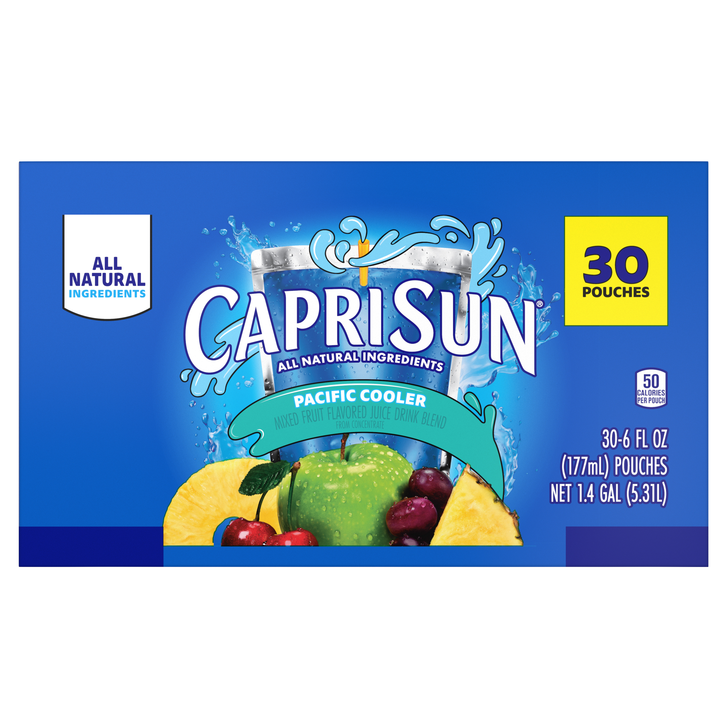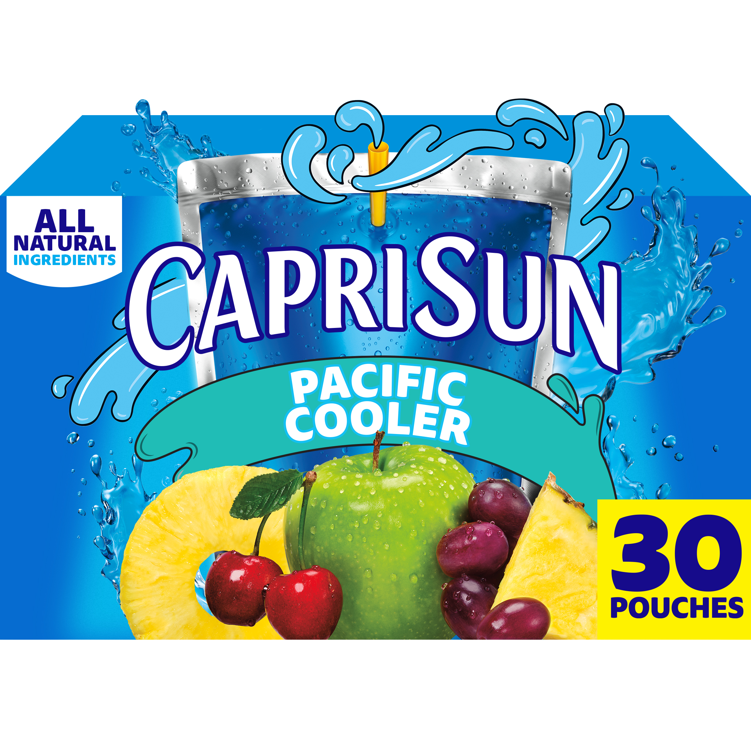 Product Description Grab a little juicy freedom with Capri Sun Pacific Cooler Flavored with Other Natural Flavor Juice Drink Blend Pouches. Quench your thirst for fun and flavor with our kids drinks pouches. Kids will love the taste of our Capri Sun. Made with all-natural sweeteners, our Pacific Cooler juice drink blend features pineapple, cherries, apples and grapes for a taste that's joyfully refreshing. We never add artificial flavors, colors, preservatives or high-fructose corn syrup to our pouches. Looking for kid drinks in bulk? Each pack contain 30 convenient pouches. Capri Sun pouches are ideal for school lunches, after-school snacks and on-the-go adventures any time of year! Designed for busy families, they’re easy to pack, easy to sip, and loved by kids and parents alike. Each 6 fluid ounce pouch in our 30 count bulk drinks box comes with a straw, so they're ready for kids to squeeze and sip. Our kids drink pouches are pantry-friendly for easy storage, but keep them chilled in the fridge so they're extra refreshing. Unleash kids' independence with a ready-to-drink Capri Sun. Poke. Sip. Squeeze. Repeat. Try them all. Capri Sun offers a wave of fun flavors made with refreshing, all-natural fruit juices. It's gonna be epic!