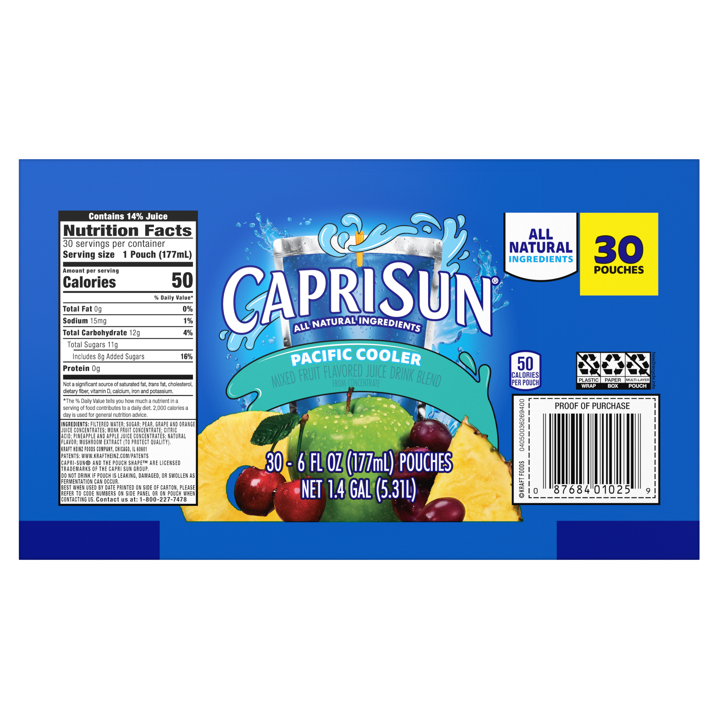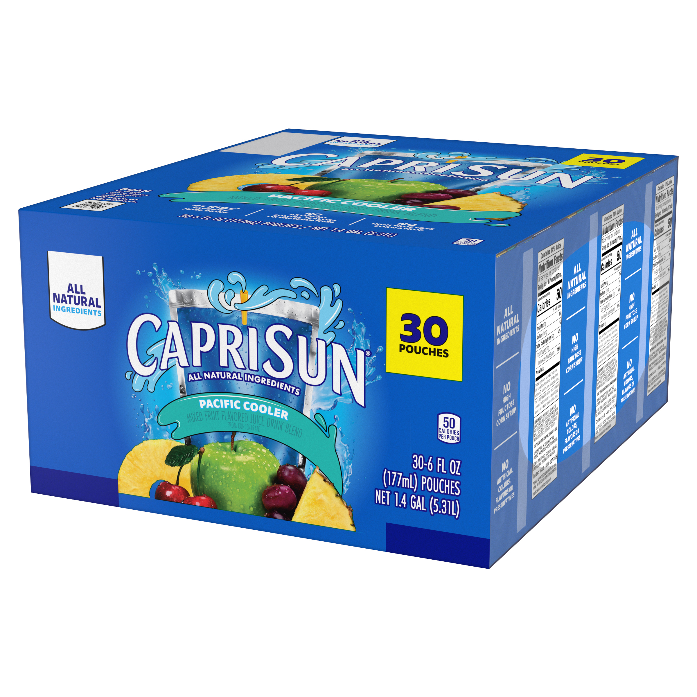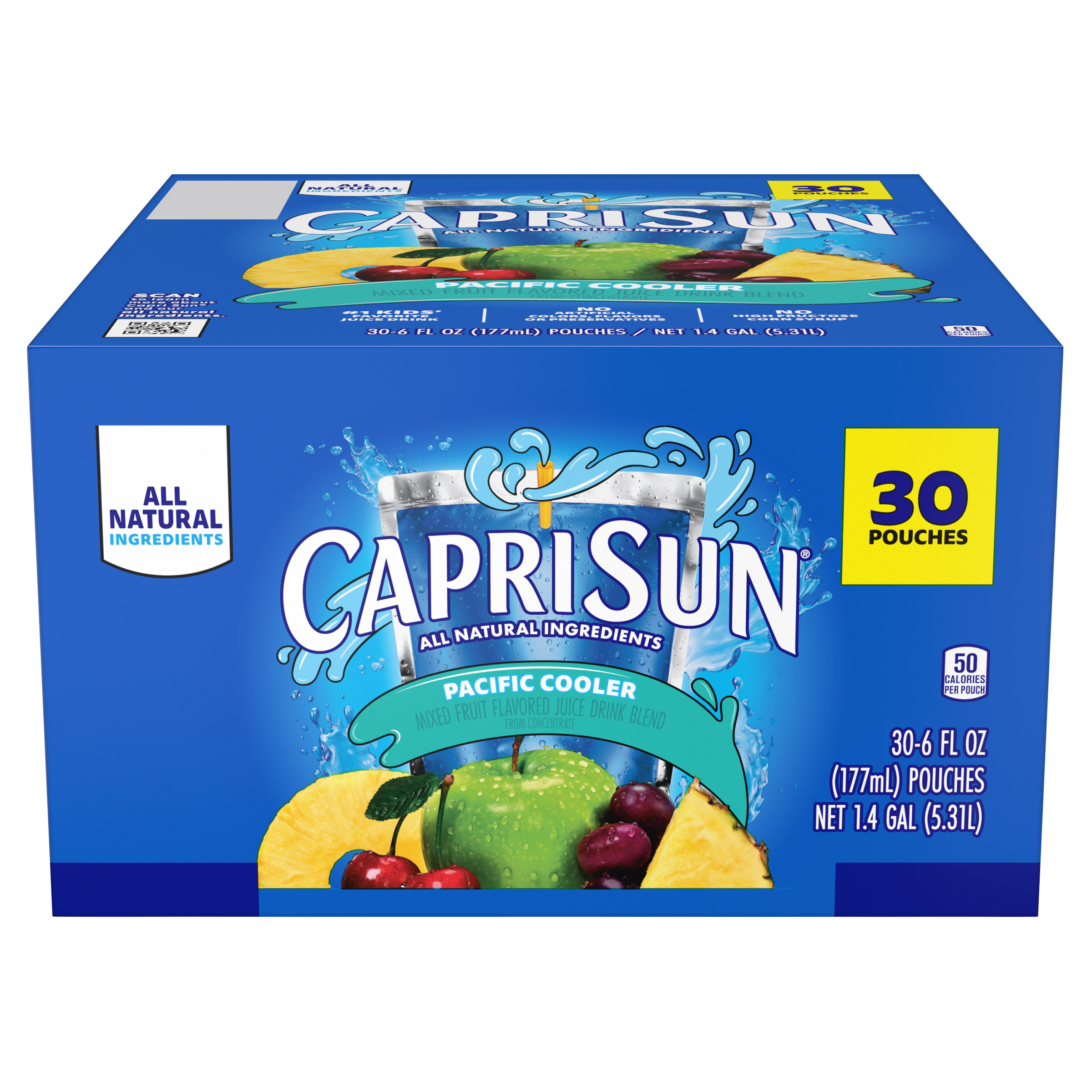 Product Description Grab a little juicy freedom with Capri Sun Pacific Cooler Flavored with Other Natural Flavor Juice Drink Blend Pouches. Quench your thirst for fun and flavor with our kids drinks pouches. Kids will love the taste of our Capri Sun. Made with all-natural sweeteners, our Pacific Cooler juice drink blend features pineapple, cherries, apples and grapes for a taste that's joyfully refreshing. We never add artificial flavors, colors, preservatives or high-fructose corn syrup to our pouches. Looking for kid drinks in bulk? Each pack contain 30 convenient pouches. Capri Sun pouches are ideal for school lunches, after-school snacks and on-the-go adventures any time of year! Designed for busy families, they’re easy to pack, easy to sip, and loved by kids and parents alike. Each 6 fluid ounce pouch in our 30 count bulk drinks box comes with a straw, so they're ready for kids to squeeze and sip. Our kids drink pouches are pantry-friendly for easy storage, but keep them chilled in the fridge so they're extra refreshing. Unleash kids' independence with a ready-to-drink Capri Sun. Poke. Sip. Squeeze. Repeat. Try them all. Capri Sun offers a wave of fun flavors made with refreshing, all-natural fruit juices. It's gonna be epic!