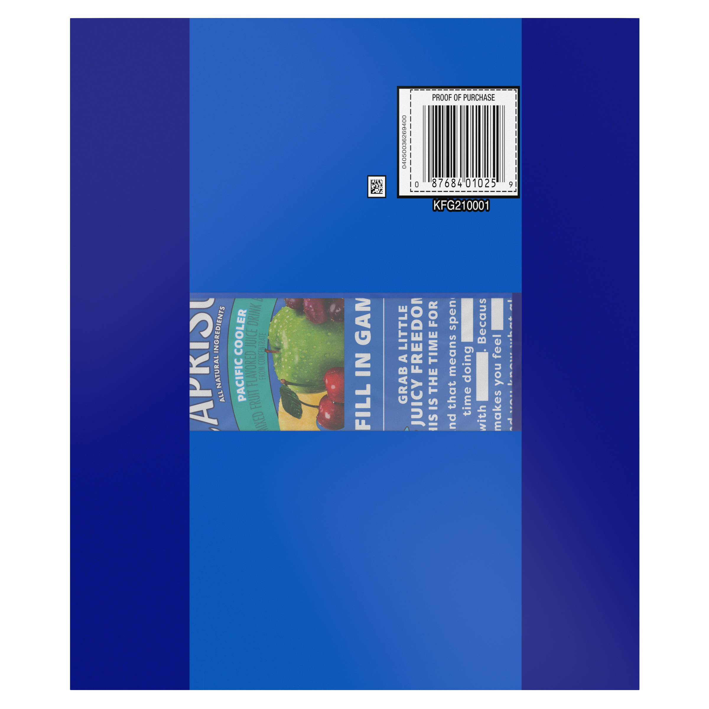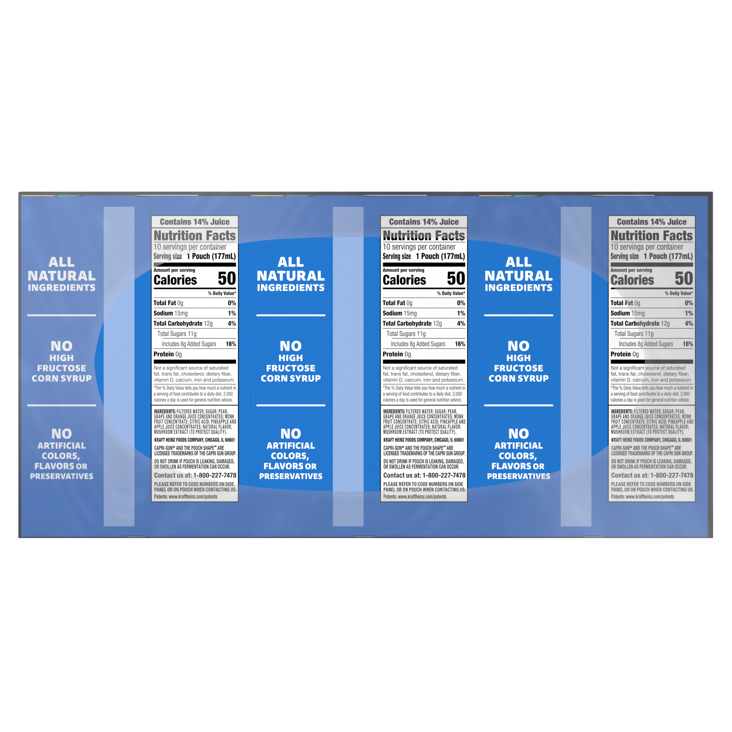 GTIN 00087684010259 Kraft Item Code (SKU) 00876840102500 Product Status Active Pack Level CASE Brand Name Capri Sun Business Unit Hydration Desserts & Meals Catalog Platform Hydration Product Category Ready To Drink Aseptic Pouch Consumer Unit Size 180 Consumer Unit Size UOM FO Packaging Type (Computed) Pack Packaging Type Code MULTIPACK Packaging Type Code Override (Manual) Box Sub Units Per Item 3 Lowest Level Side Override (Manual) 6 fl oz Pouches Variant Pacific Cooler Global Product Classification Juice Drinks - Ready to Drink (Shelf Stable) Global Product Classification Code 10000201 Computed Exports - Ingredients FILTERED WATER; SUGAR; PEAR, GRAPE AND ORANGE JUICE CONCENTRATES; MONK FRUIT CONCENTRATE; CITRIC ACID; PINEAPPLE AND APPLE JUICE CONCENTRATES; NATURAL FLAVOR; MUSHROOM EXTRACT (TO PROTECT QUALITY). Parent Reference 20087684010253 Child Reference 00087684000953 Quality Statement Best When Used By Date Printed On Side Of Carton | Please Refer To Code Numbers On Side Panel Or On Pouch When Contacting Us. Customer Guarantee 145 Temperature Classification Ambient Prevailing Conditions Temperature Classification Code 01 Net Weight 11.25 Gross Weight 13.008 Weight UOM LB Height (in) 5.563 Length/Depth (in) 11.25 Width (in) 9.5 Case Cube 0.344 Child Relation EACH_00087684000953 Parent Relation PALLET_20087684010253 Cases per Tier 16 Tiers per Pallet 8 Cases per Pallet 128 Pallet Stack Limit 1 Product Title Capri Sun Flavored with Other Natural Flavor Juice Drink Blend, 30 Pouches, for School Lunches and On-the-Go Hydration, Pacific Cooler, All Natural Ingredients, 6 fl oz eCommerce Product Name (Generic Name) Pacific Cooler Mixed Fruit Naturally Flavored Juice Drink Blend Product Benefits (Includes Seasonal + Formatting) - CAPRI SUN PACK OF 30: Thirty 6 fl oz pouches of Capri Sun Pacific Cooler Flavored with Other Natural Flavor Juice Drink Blend
