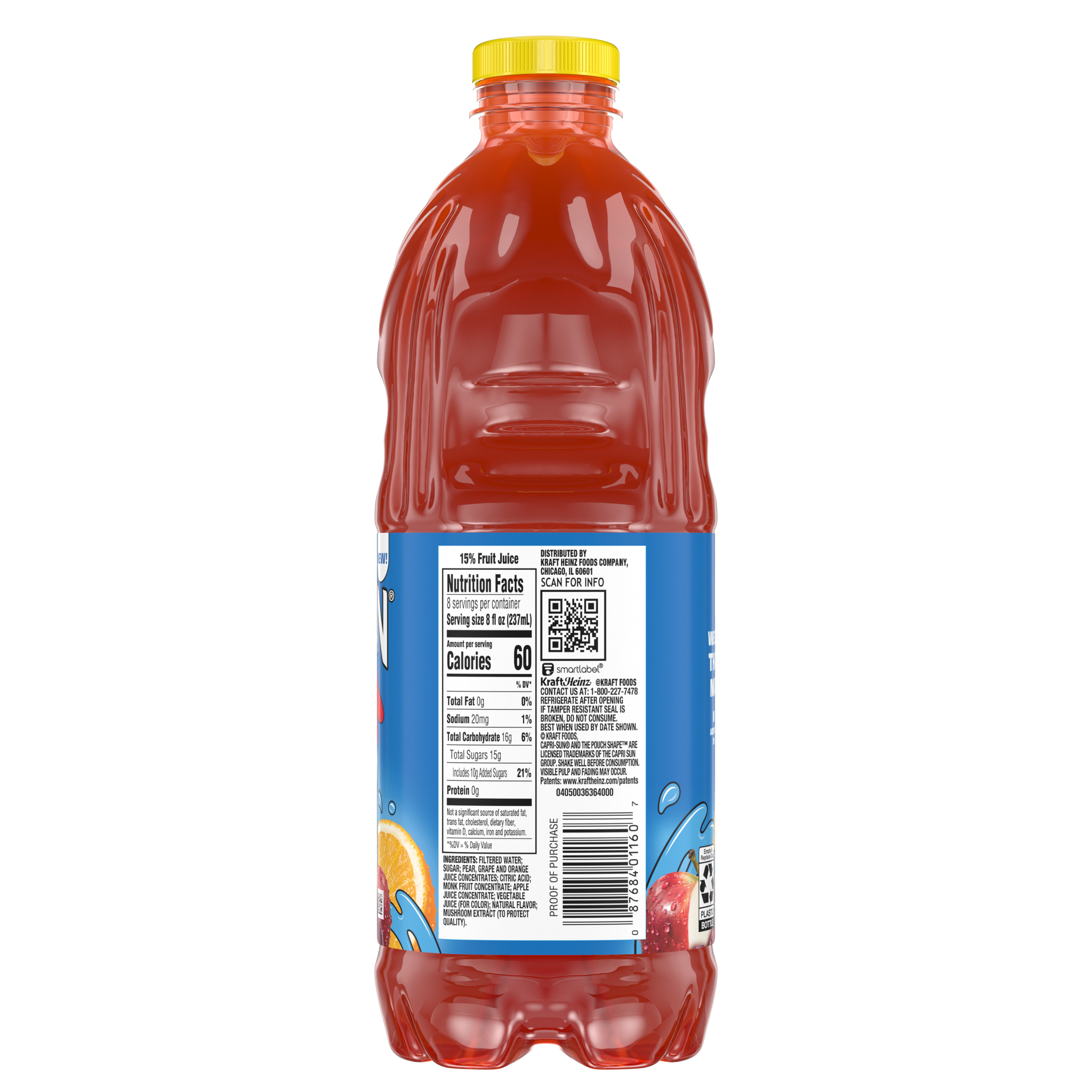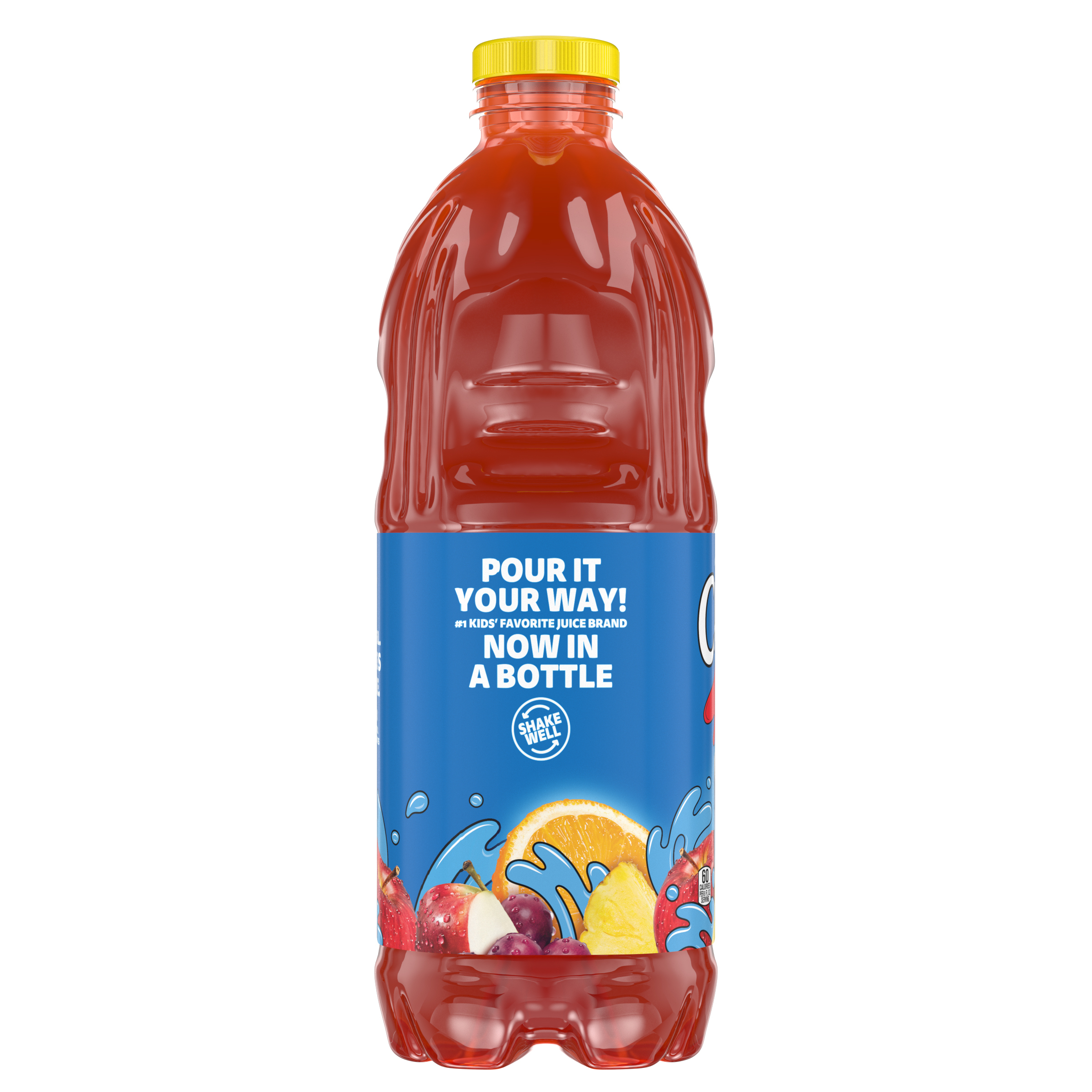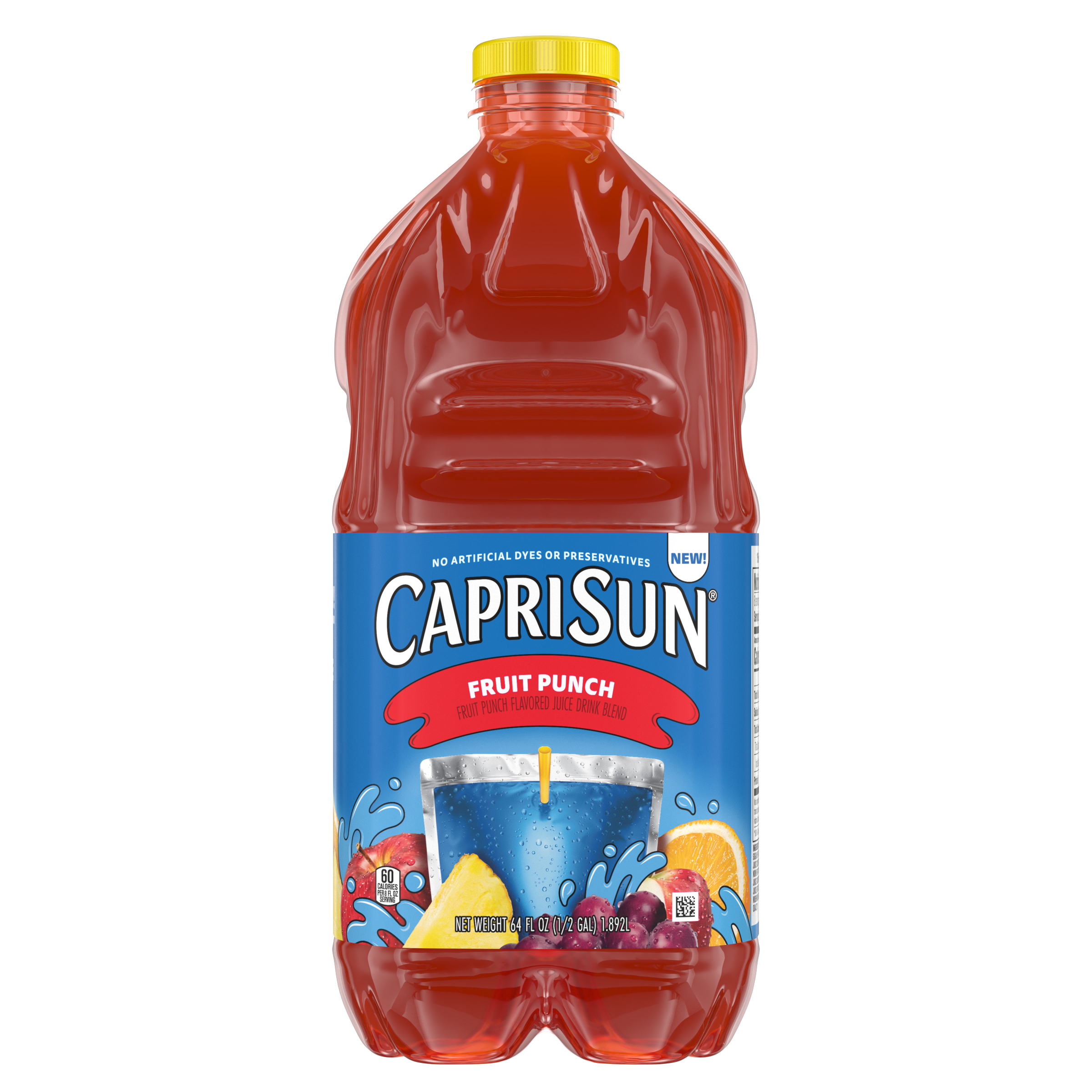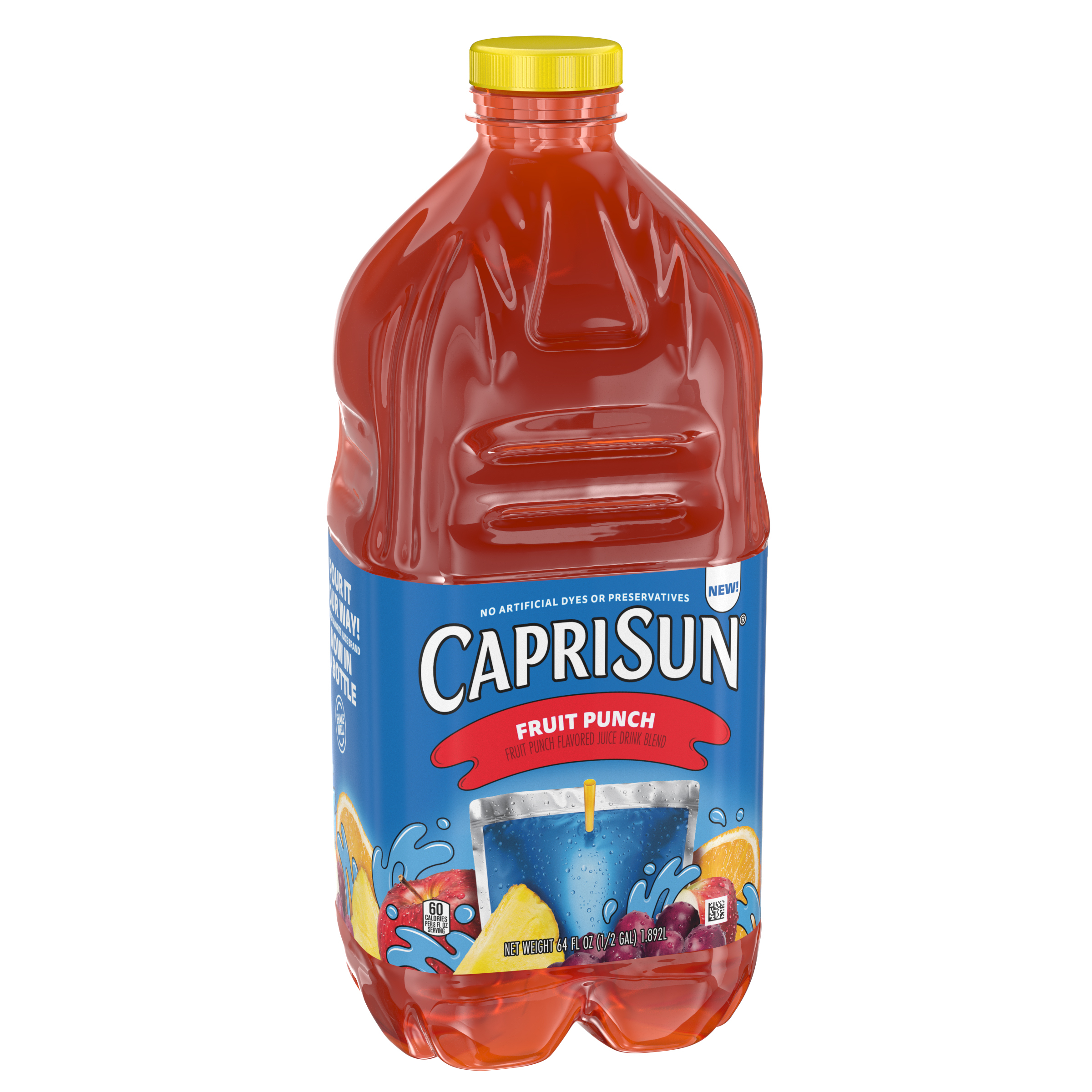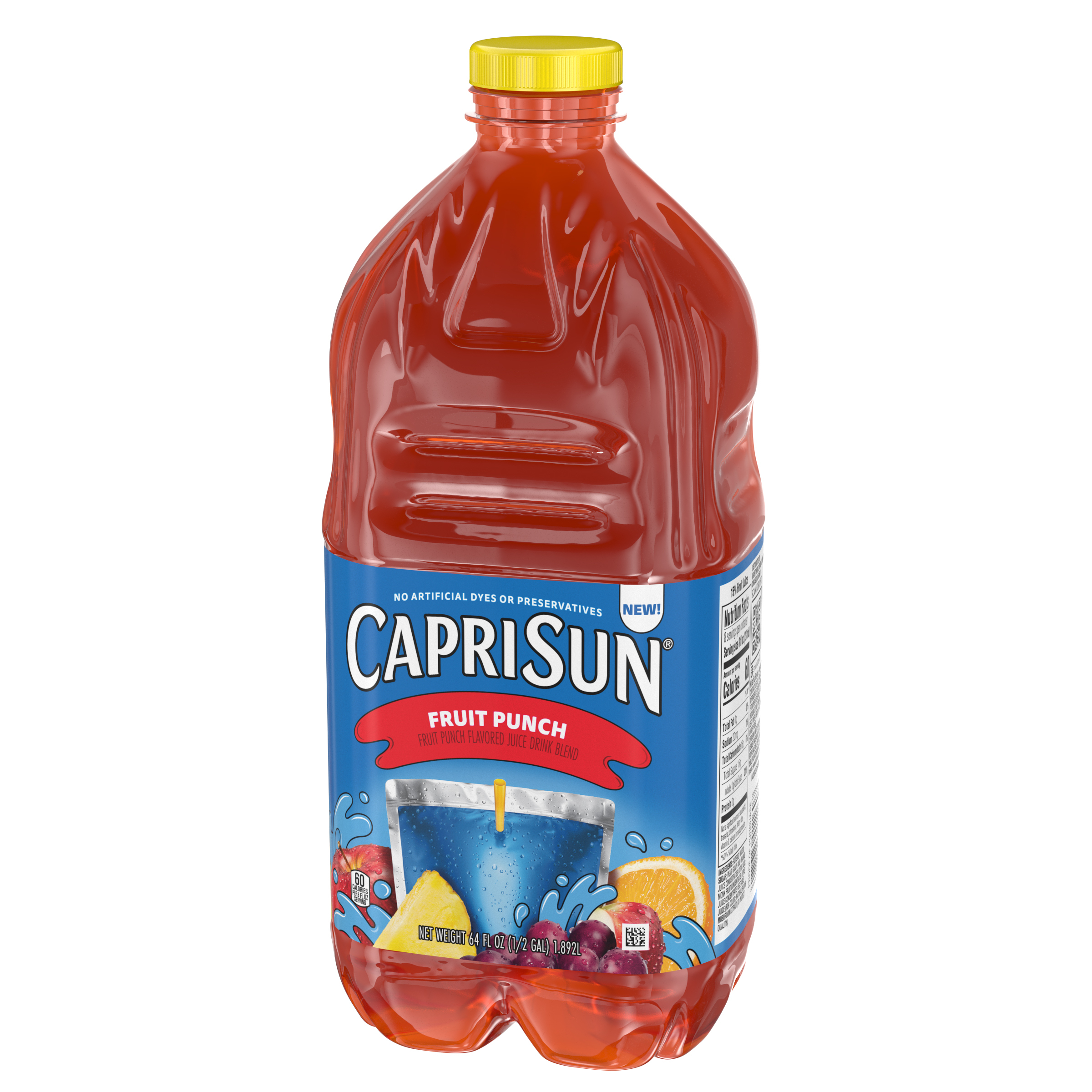Product Description Make every sip an adventure with Capri Sun Fruit Punch Flavored Juice Drink Blend in a convenient 64 fl oz bottle. Bursting with bright, fruity flavor and playful energy, it's the drink that brings smiles to every moment. Whether you're on the go or relaxing at home, Capri Sun makes it easy to enjoy a splash of fun wherever the day takes you. Each bottle blends real fruit juices from apple, grape, orange, and pear to create a sweet, tangy flavor that's refreshing and full of life. Kids love the big fruit punch taste, and parents appreciate that it's made with all-natural ingredients and contains no artificial colors, flavors, or preservatives. It's a simple, honest drink made with real fruit taste and the trusted quality of Capri Sun. Whether you're pouring glasses for family dinners, packing for a picnic, or cooling off at home, Capri Sun Fruit Punch fits right into your day. Each bottled juice has plenty to share, so there's even more to enjoy in every sip. Keep a few Capri Sun bottles chilled in the fridge for a quick, refreshing pick-me-up. With its bright flavor and real ingredients, Capri Sun Fruit Punch Bottled Juice keeps the whole family smiling from the first sip to the last.