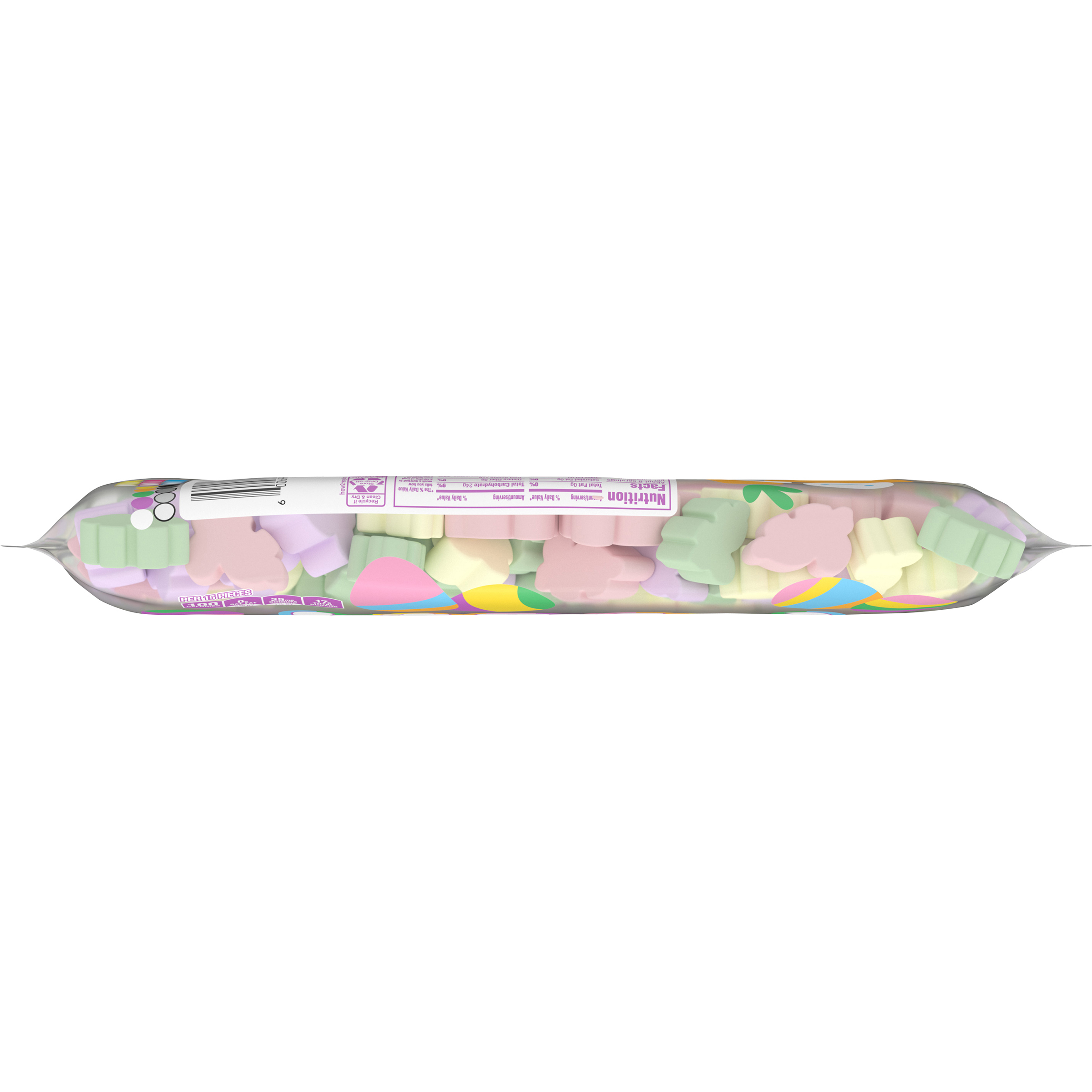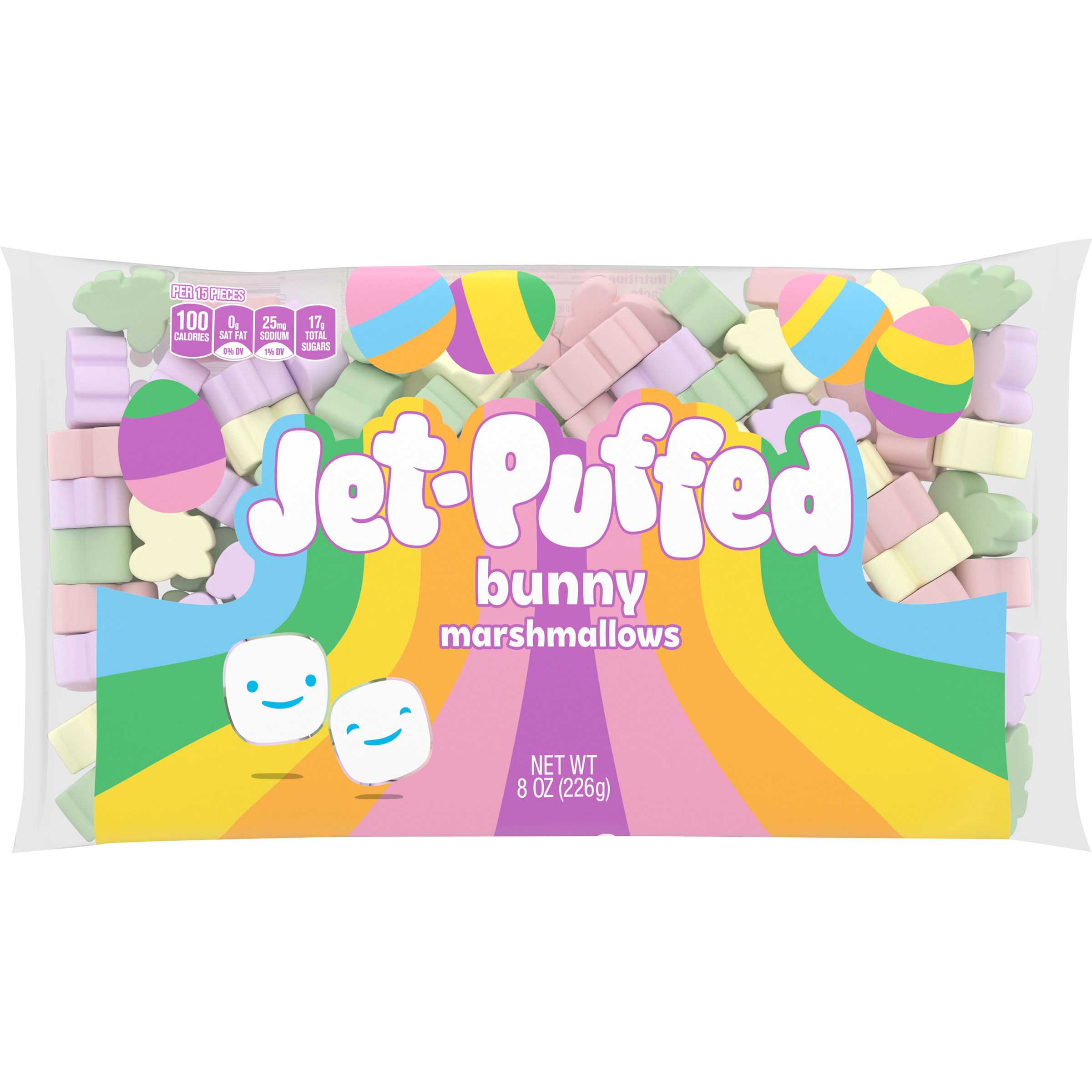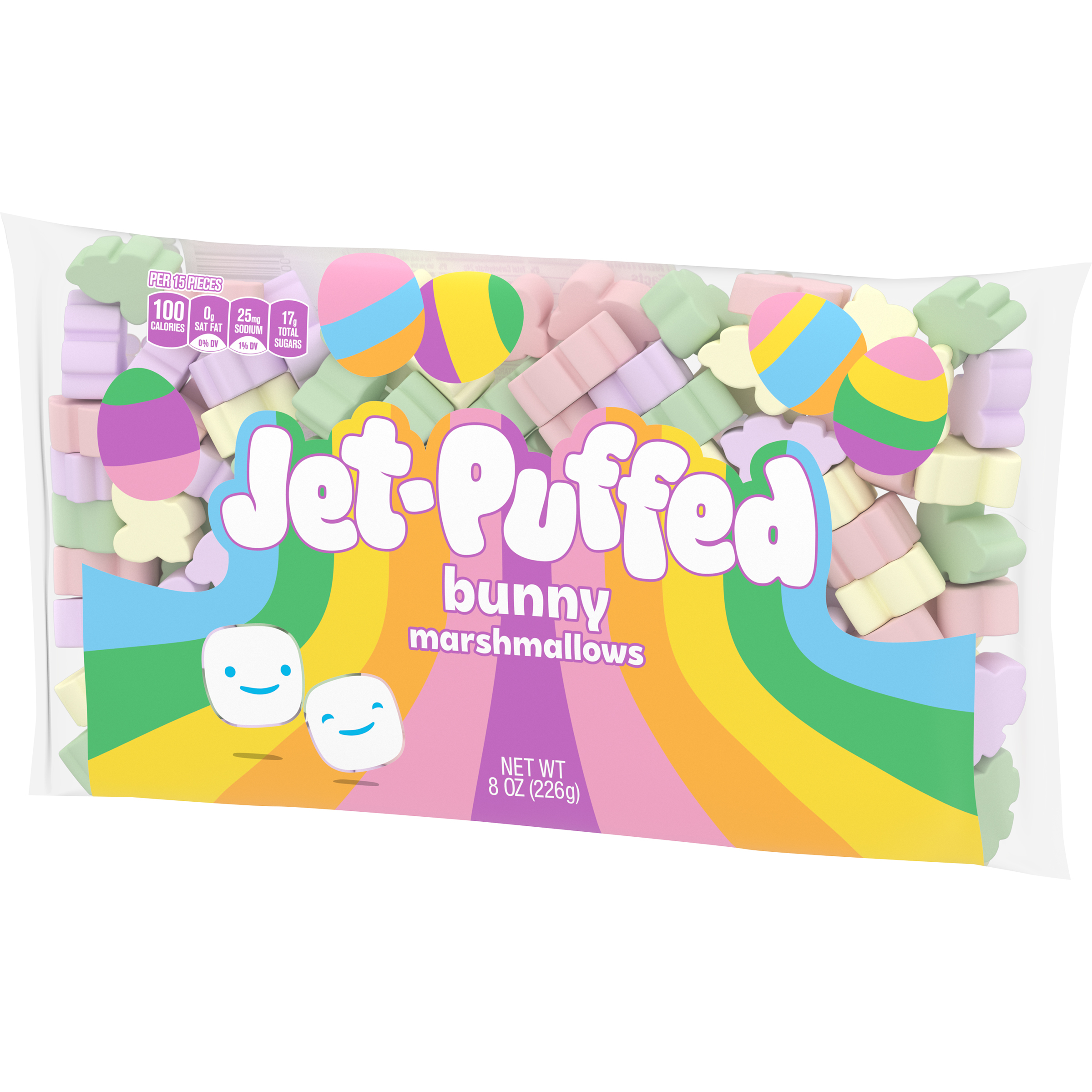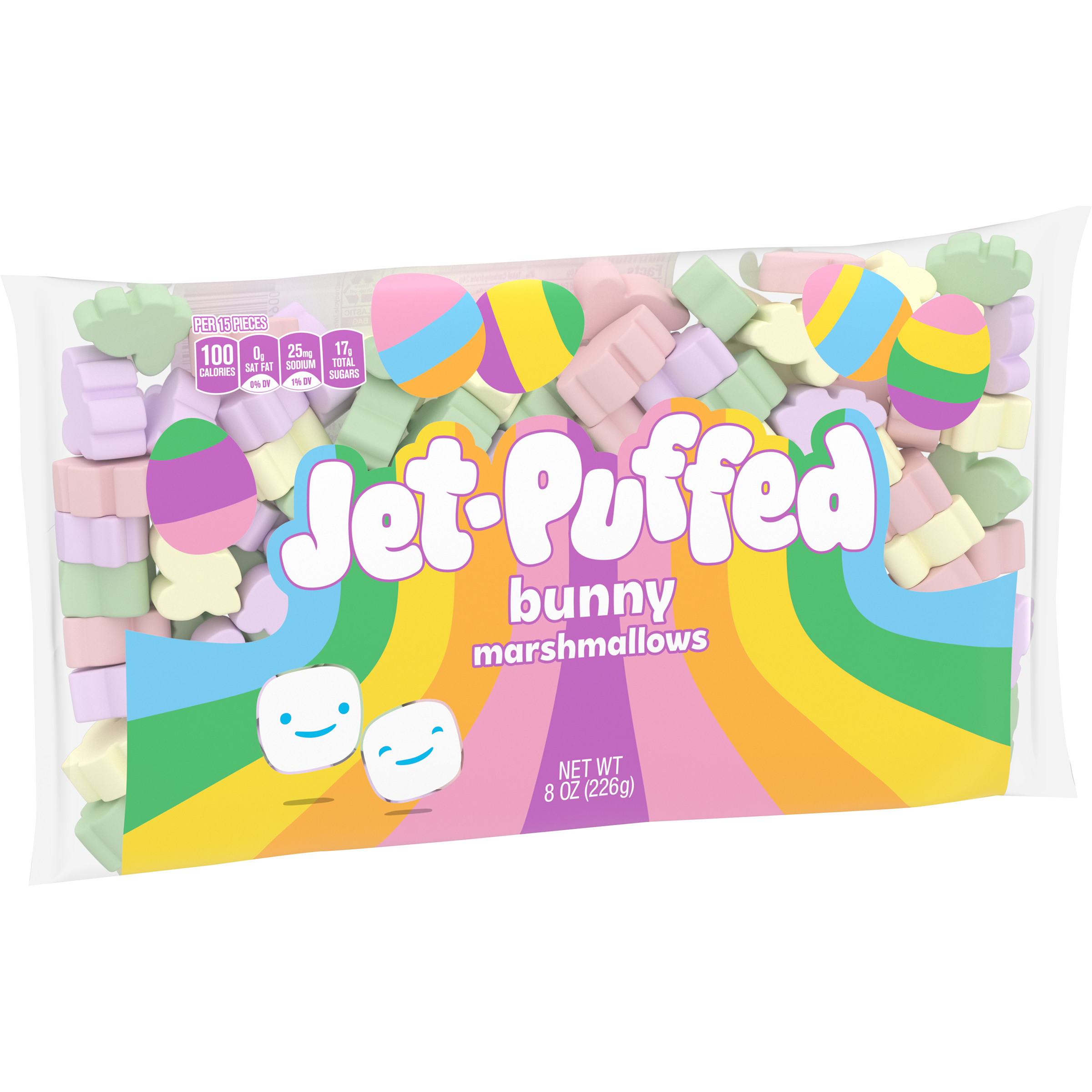 Product Description Jet-Puffed Bunny Shaped Marshmallows are a delicious and versatile dessert topping or a sweet snack for Easter. Our bunny marshmallows deliver the same delicious taste and fluffy texture you know and love from Jet-Puffed Marshmallows. Enjoy our bunny-shaped marshmallows as a fun and festive snack for kids or as a playful addition to your favorite Easter dessert recipes. Sweeten the season and use our fluffy marshmallows to make pastel rice cereal treats for spring. Put our marshmallows and a chocolate square on graham crackers to make spring s'mores. Try topping a cozy cup of hot cocoa with our bunny-shaped marshmallows for an extra sweet treat. Each package of Jet-Puffed Bunny Shaped Marshmallows comes sealed in an 8-ounce bag. Hop to it and bring home a little fluffy fun today!