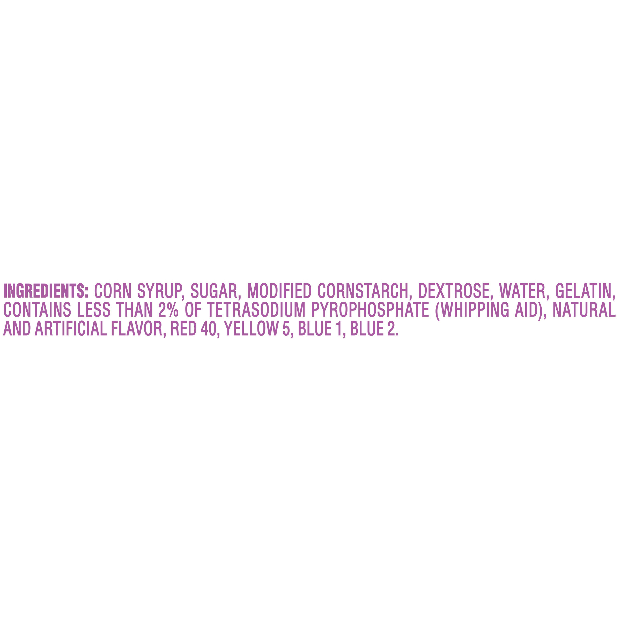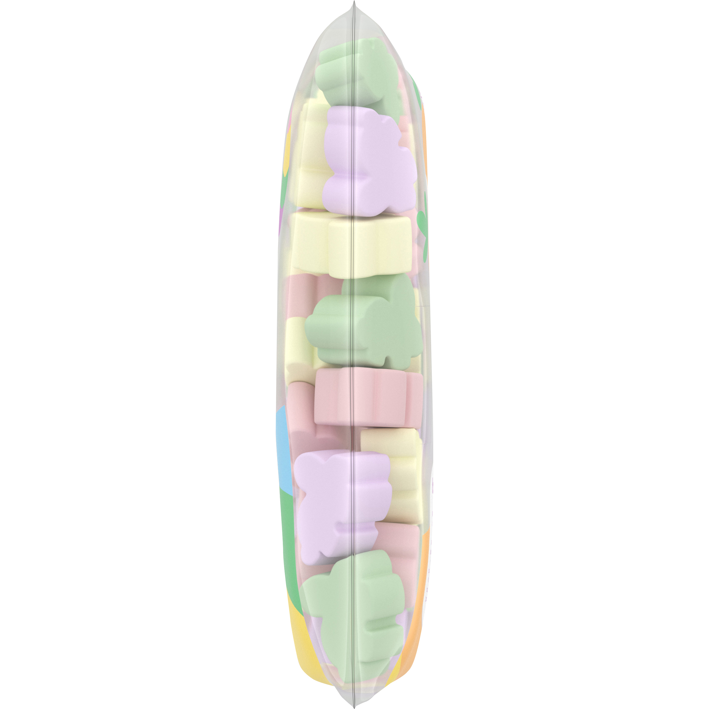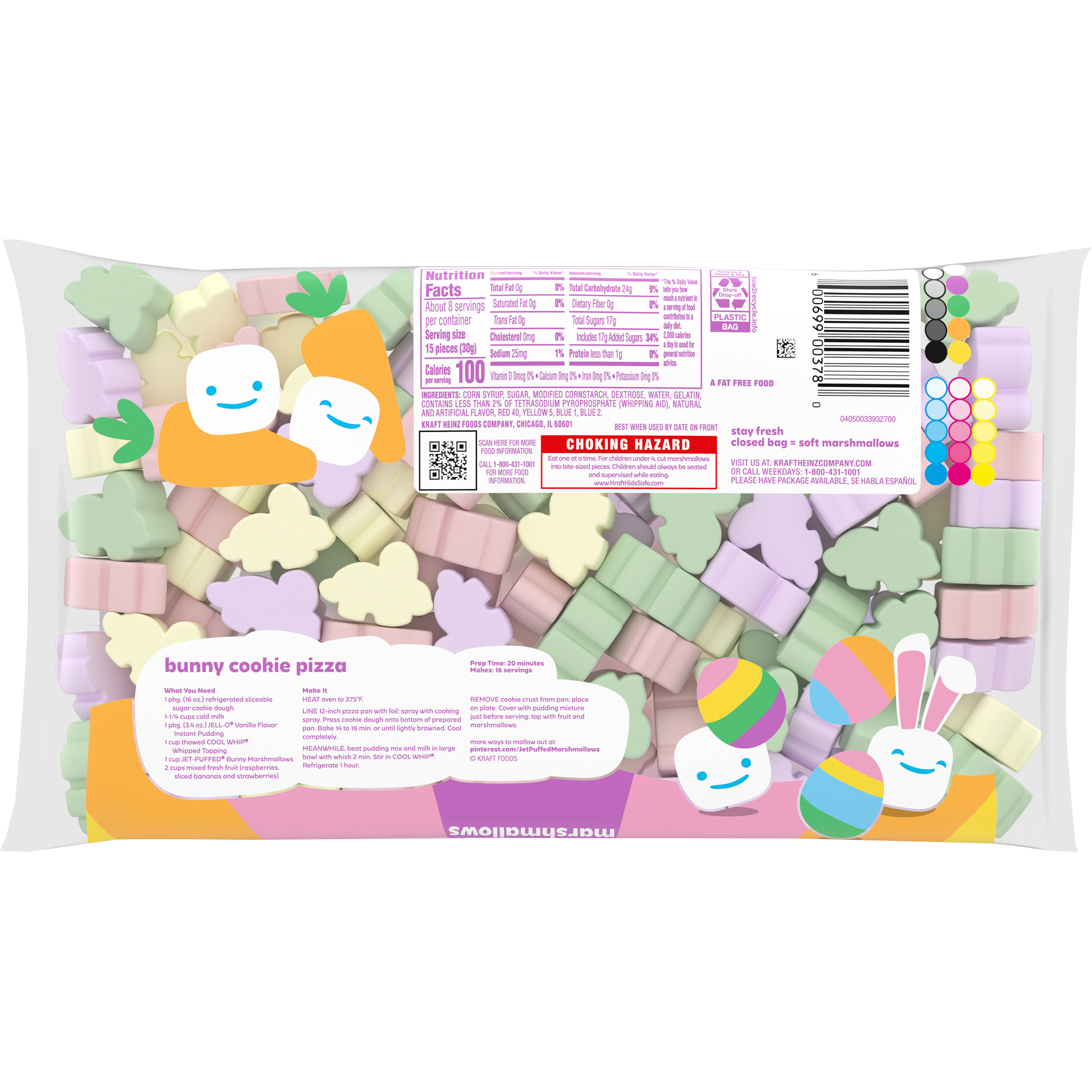 GTIN 00600699003780 Kraft Item Code (SKU) 06006990037870 Product Status Active Pack Level EACH Brand Name Jet-Puffed Business Unit Hydration Desserts & Meals Catalog Platform Desserts Product Category Marshmallows US Consumer Unit Size 8 Consumer Unit Size UOM OZ Packaging Type (Computed) Bag Packaging Type Code BAG Packaging Type Code Override (Manual) Bag Sub Units Per Item 1 Variant Bunny Global Product Classification Sugar Candy/Sugar Candy Substitutes Confectionery Global Product Classification Code 10000312 Computed Exports - Ingredients CORN SYRUP, SUGAR, MODIFIED CORNSTARCH, DEXTROSE, WATER, GELATIN, CONTAINS LESS THAN 2% OF TETRASODIUM PYROPHOSPHATE (WHIPPING AID), NATURAL AND ARTIFICIAL FLAVOR, RED 40, YELLOW 5, BLUE 1, BLUE 2. Parent Reference 10600699003787 Quality Statement Best When Used By Date On Front Storage Instructions Stay Fresh Closed Bag = Soft Marshmallows Customer Guarantee 60 Temperature Classification Code 07 Net Weight 0.5 Gross Weight 0.509 Weight UOM LB Height (in) 6.25 Length/Depth (in) 2 Width (in) 10.5 Case Cube 0.076 Parent Relation CASE_10600699003787 Parent Kraft Item Code (SKU) 06006990037800 Product Title Jet-Puffed Bunny Shaped Marshmallows, 8 oz Bag eCommerce Product Name (Generic Name) Bunny Shaped Marshmallows Product Benefits (Includes Seasonal + Formatting) - One 8 oz bag of Jet-Puffed Bunny Shaped Marshmallows