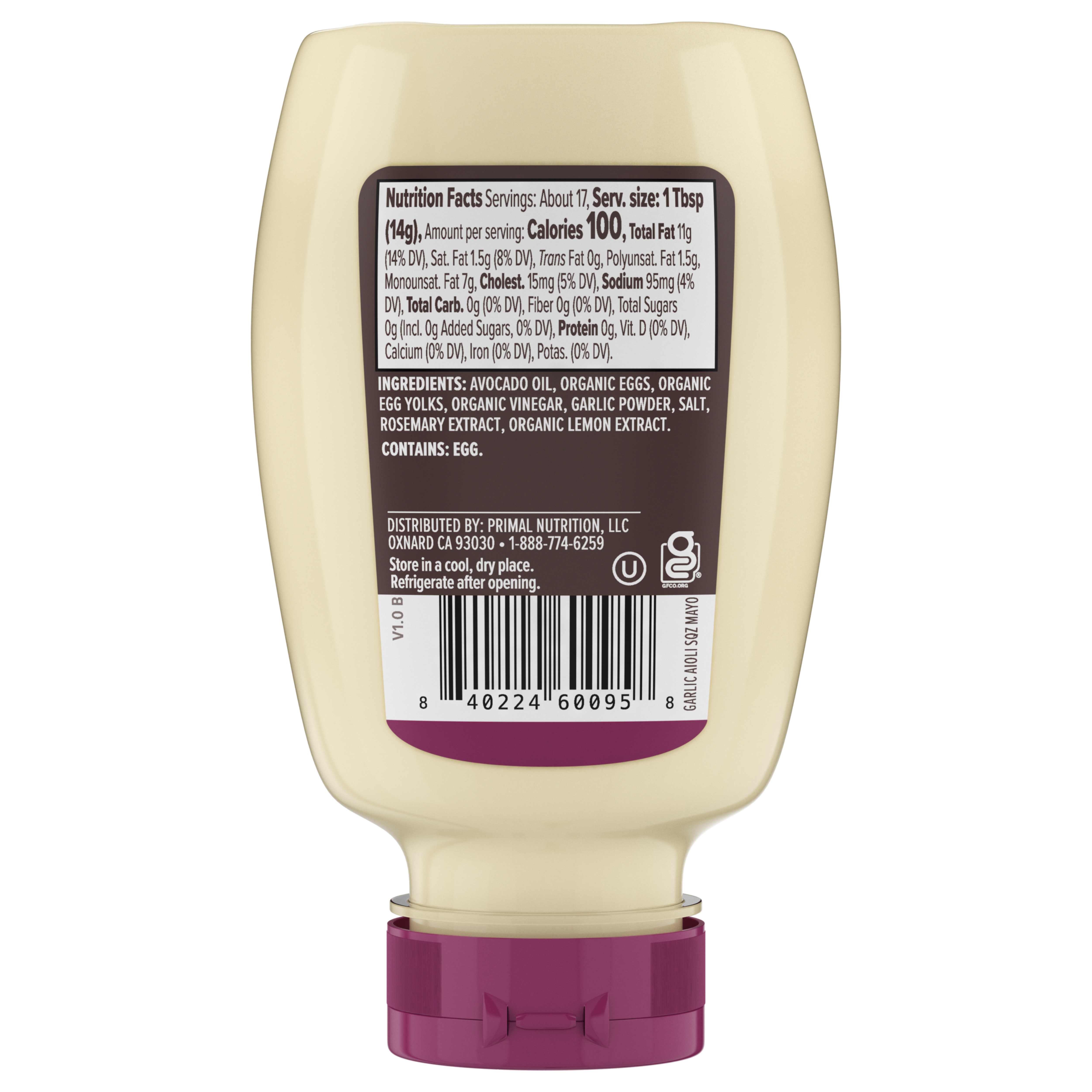 GTIN 00840224600958 Kraft Item Code (SKU) 08402246009570 Product Status Active Pack Level EACH Brand Name PRIMAL KITCHEN Business Unit Elevation Catalog Platform Primal Kitchen Consumer Unit Size 8.5 Consumer Unit Size UOM FO Sub Units Per Item 1 Variant Garlic Aioli Global Product Classification Code 10000280 Computed Exports - Ingredients AVOCADO OIL, ORGANIC EGGS, ORGANIC EGG YOLKS, ORGANIC VINEGAR, GARLIC POWDER, SALT, ROSEMARY EXTRACT, ORGANIC LEMON EXTRACT. Parent Reference 10840224600955 Storage Instructions Store In A Cool, Dry Place | Refrigerate After Opening Customer Guarantee 137 Temperature Classification Code 07 Net Weight 8.5 Gross Weight 0.579 Weight UOM FL OZ Height (in) 5.2 Length/Depth (in) 3 Width (in) 2 Case Cube 0.018 Parent Relation CASE_10840224600955 Product Title Primal Kitchen Garlic Aioli Squeeze Mayo, 8.5 oz Bottle eCommerce Product Name (Generic Name) Garlic Aioli Squeeze Mayo Product Benefits (Includes Seasonal + Formatting) - MADE WITH AVOCADO OIL: A delicious avocado oil base adds subtle flavor and creamy texture to this mayonnaise.