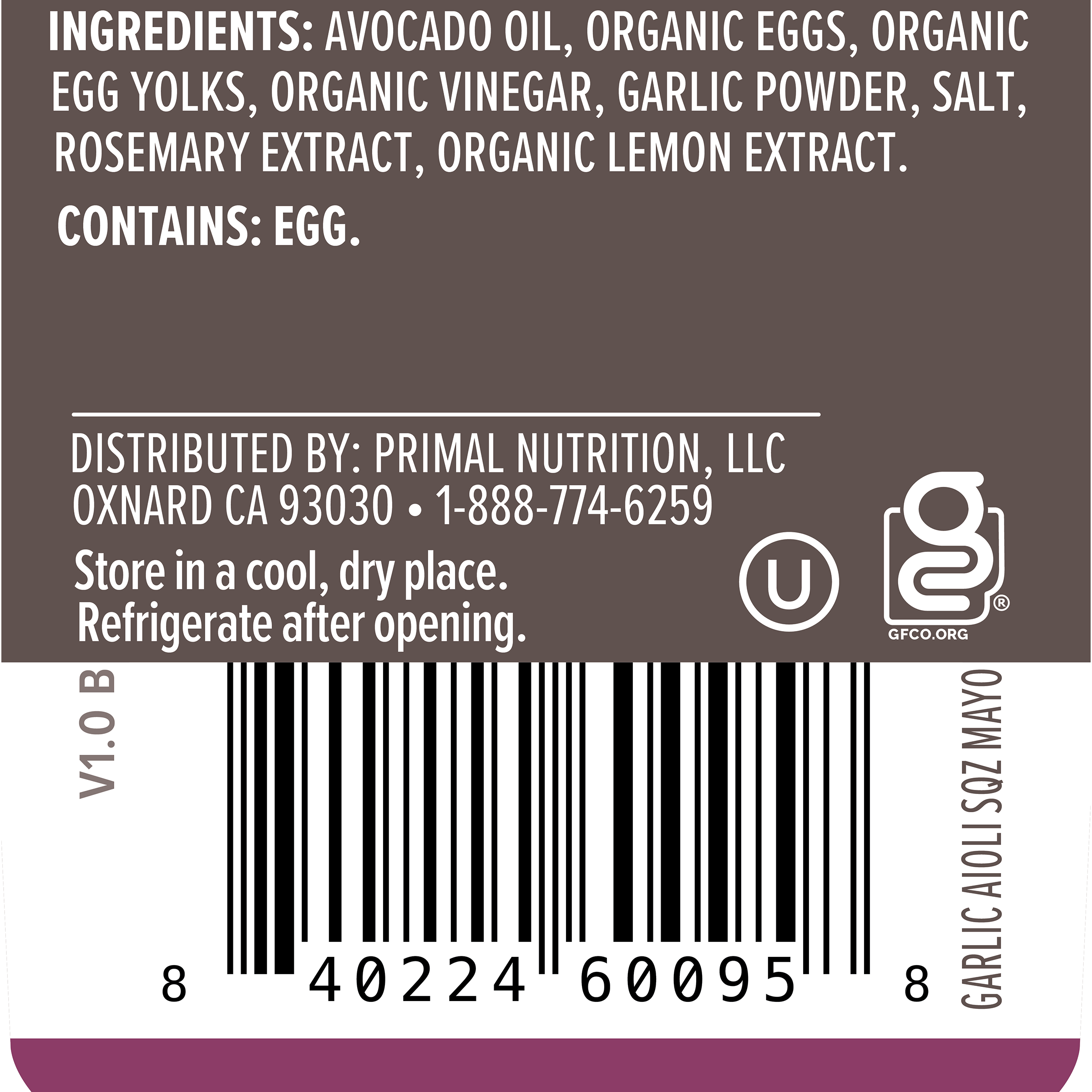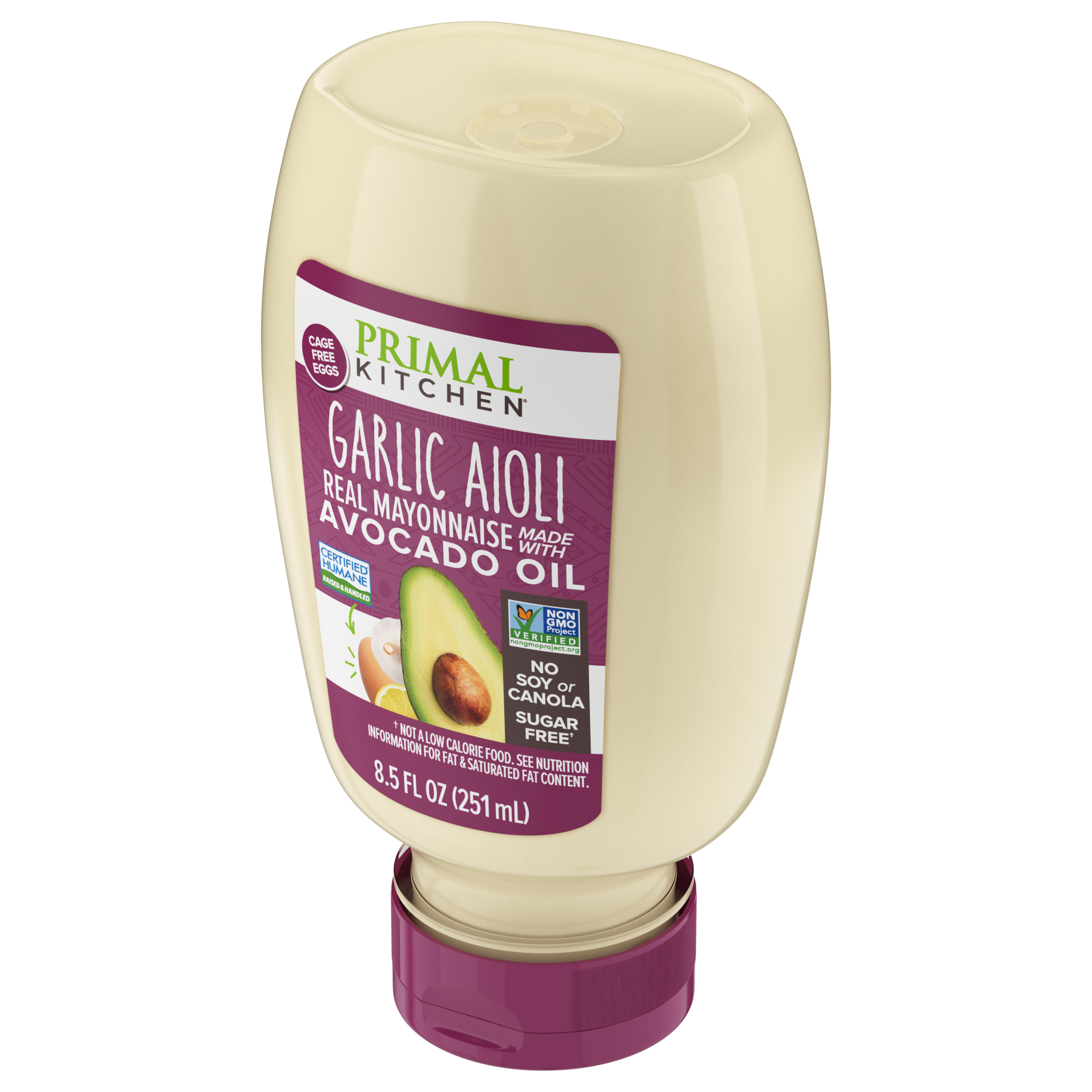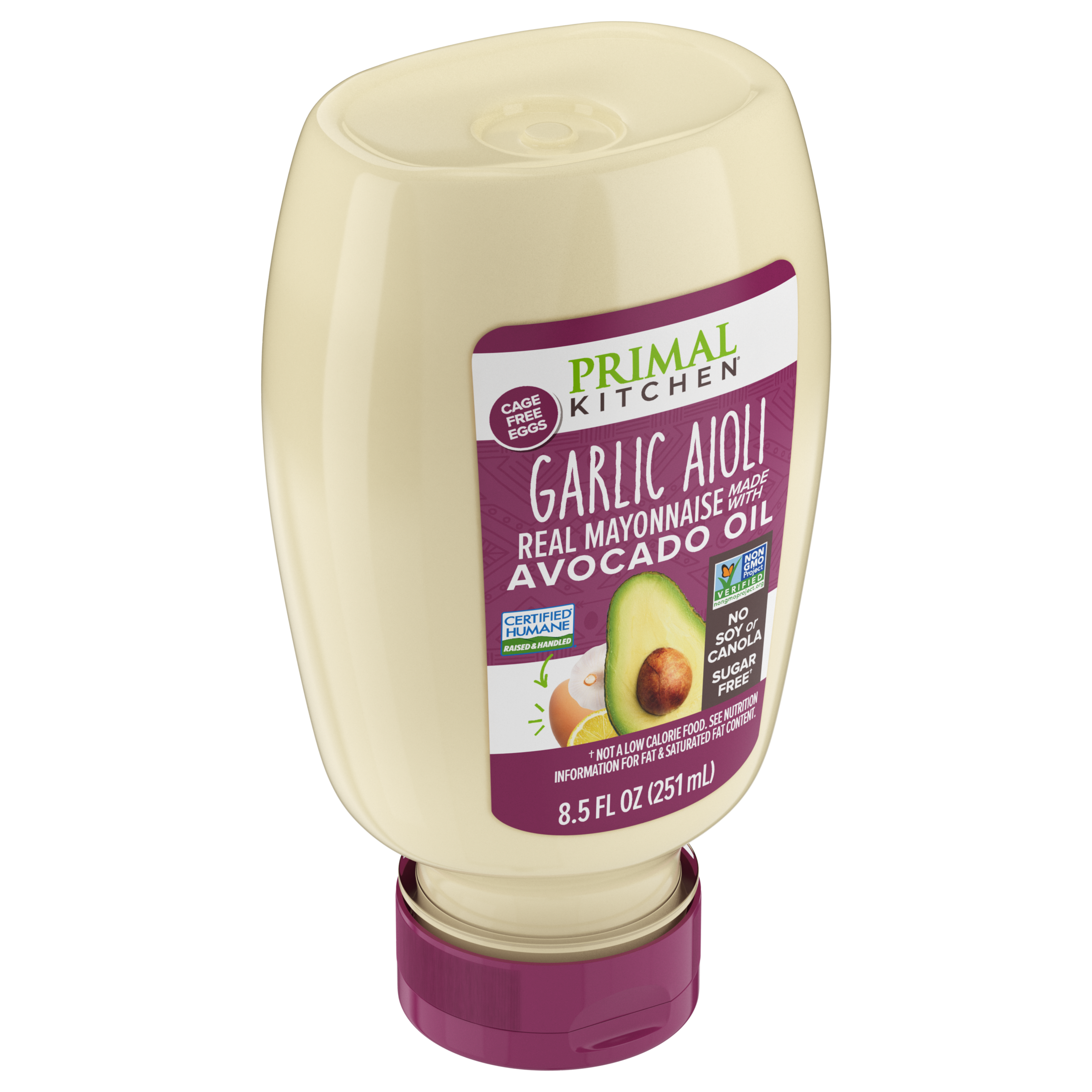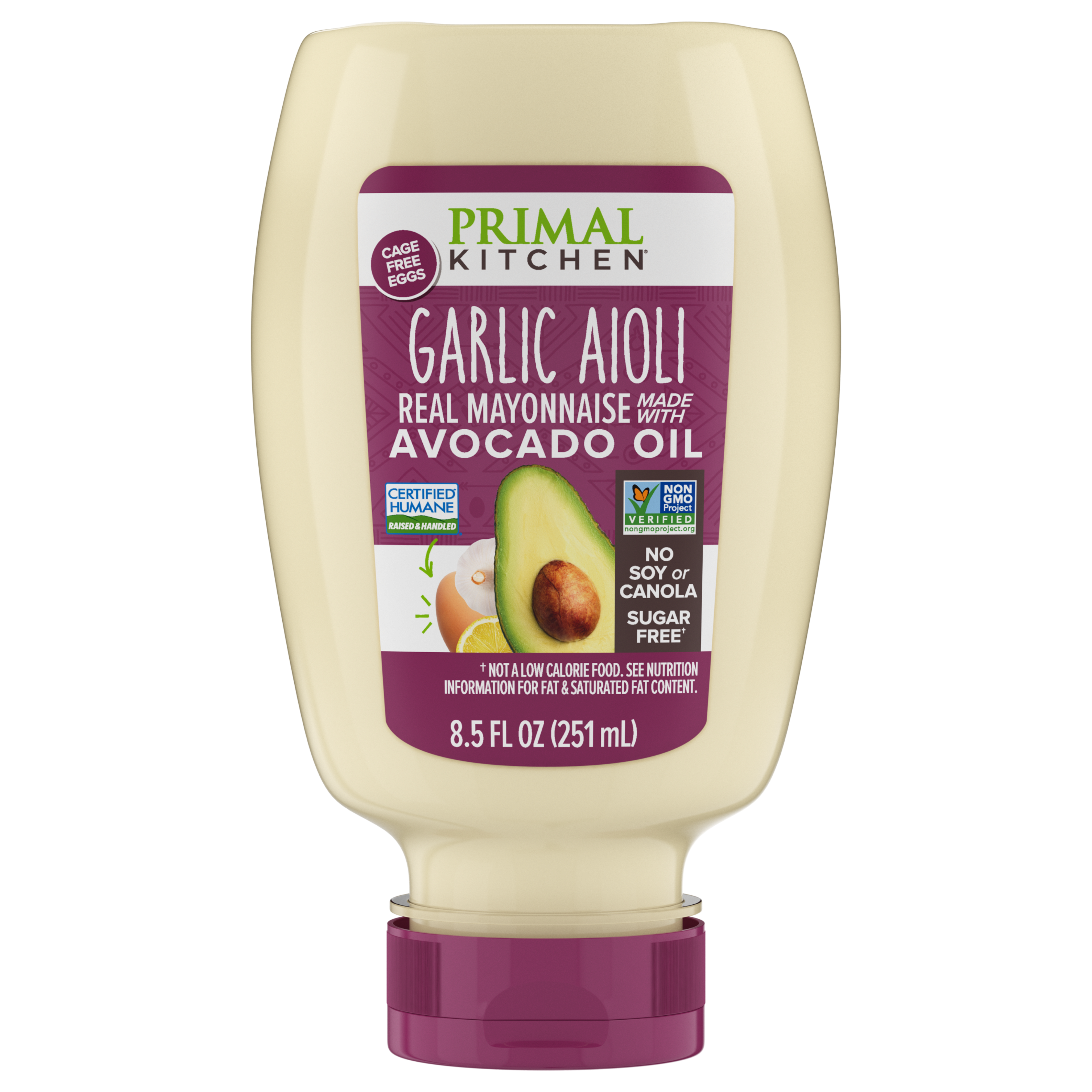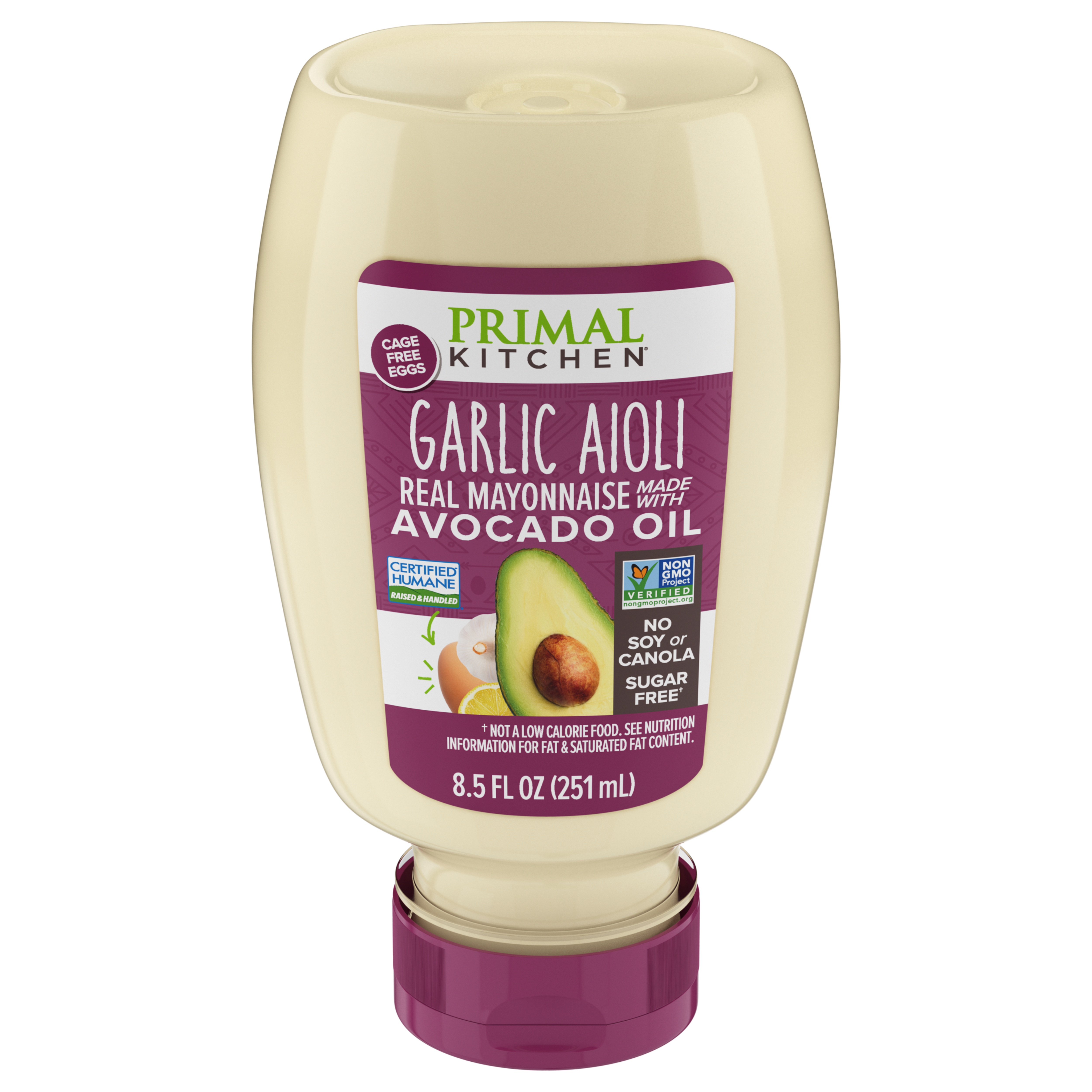 Product Description Holy moley, we made garlic aioli. Meet PRIMAL KITCHEN® Garlic Aioli Mayo, the perfect condiment companion to your artichokes, chicken sandwiches, and salad wraps. Made with avocado oil and organic cage-free eggs, our beloved mayo gets an upgrade with zesty lemon and flavorful garlic.
