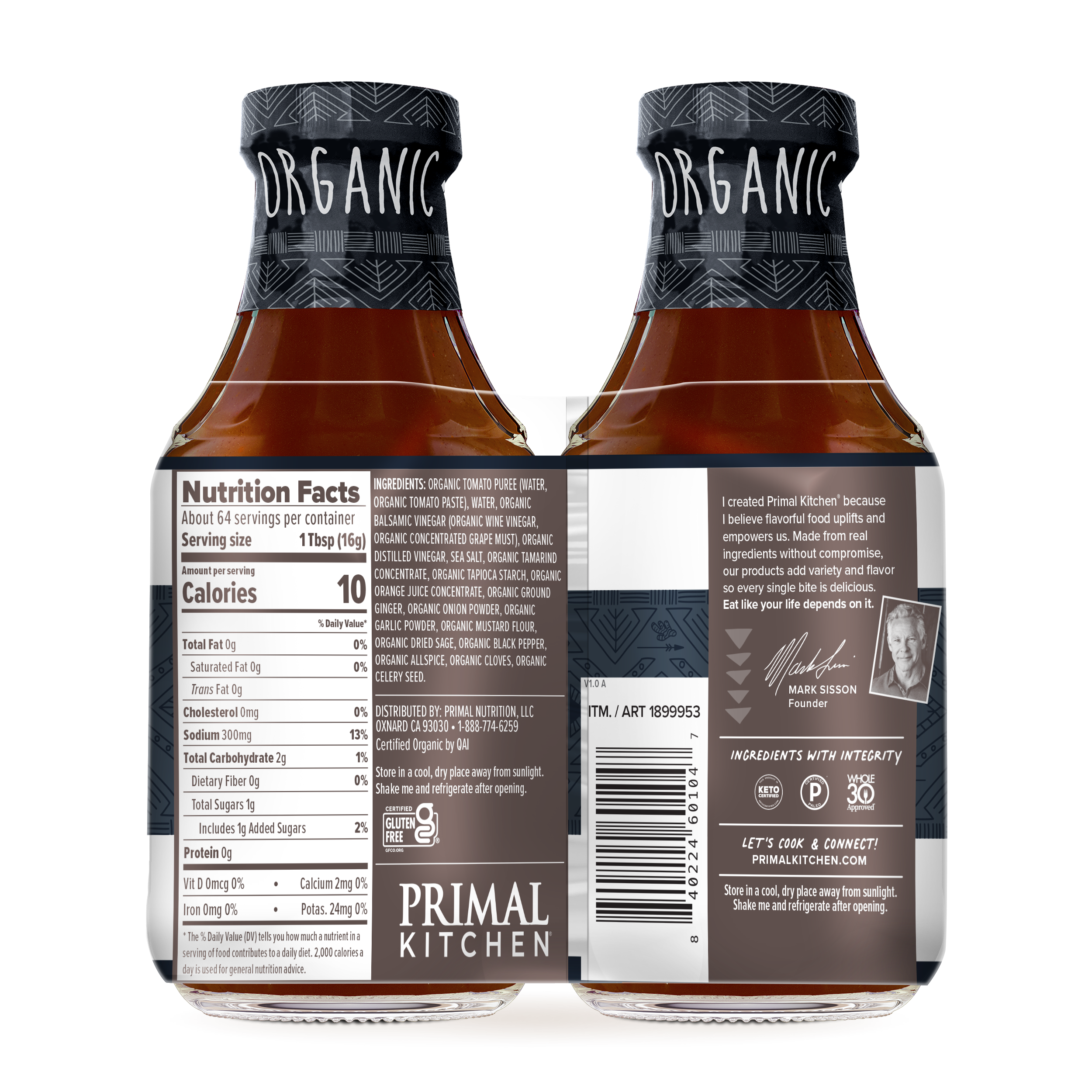GTIN 00840224601047 Product Status Active Pack Level EACH Brand Name PRIMAL KITCHEN Business Unit Elevation Catalog Platform Primal Kitchen Consumer Unit Size 18 Consumer Unit Size UOM OZ Computed Exports - Ingredients TOMATO PUREE* (WATER, TOMATO PASTE*), VINEGAR*, WHITE BALSAMIC VINEGAR* (WHITE WINE VINEGAR*, GRAPE MUST*), SEA SALT, TAMARIND EXTRACT*, TAPIOCA STARCH*, ORANGE JUICE CONCENTRATE*, GINGER POWDER*, ONION POWDER*, GARLIC POWDER*, MUSTARD FLOUR*, DRIED SAGE*, ALLSPICE*, BLACK PEPPER*, CLOVES*, CELERY SEED*. * ORGANIC Parent Reference 10840224601044 Temperature Classification Code 01 Net Weight 2.25 Weight UOM LB Parent Relation CASE_10840224601044 Product Title Primal Kitchen Steak Sauce 2 Pack 18 oz eCommerce Product Name (Generic Name) Steak Sauce Product Description Primal Kitchen Steak Sauce 2 Pack 18 oz