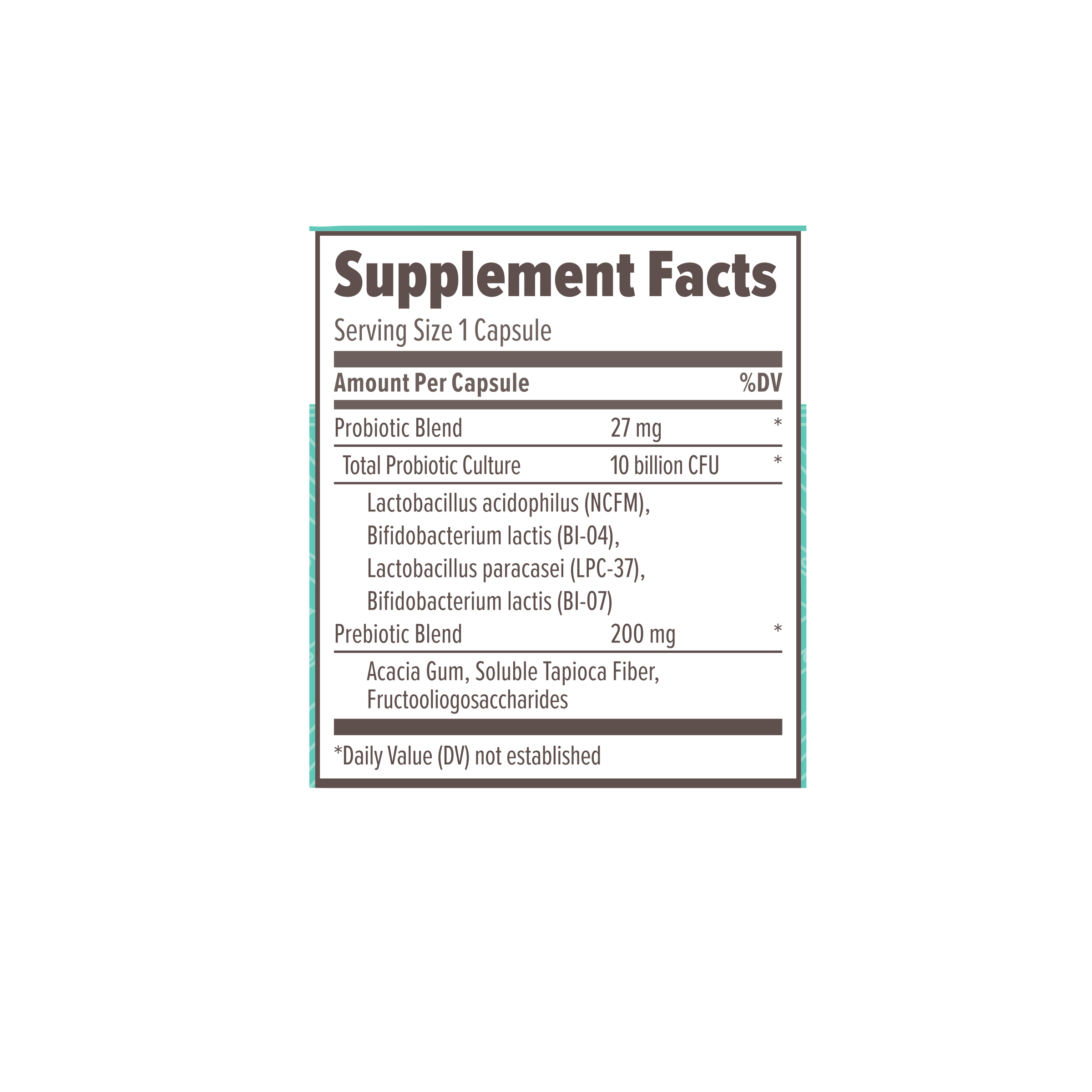 - PROBIOTICS AND PREBIOTICS: Four strains of probiotics and 200mg of prebiotics per capsule