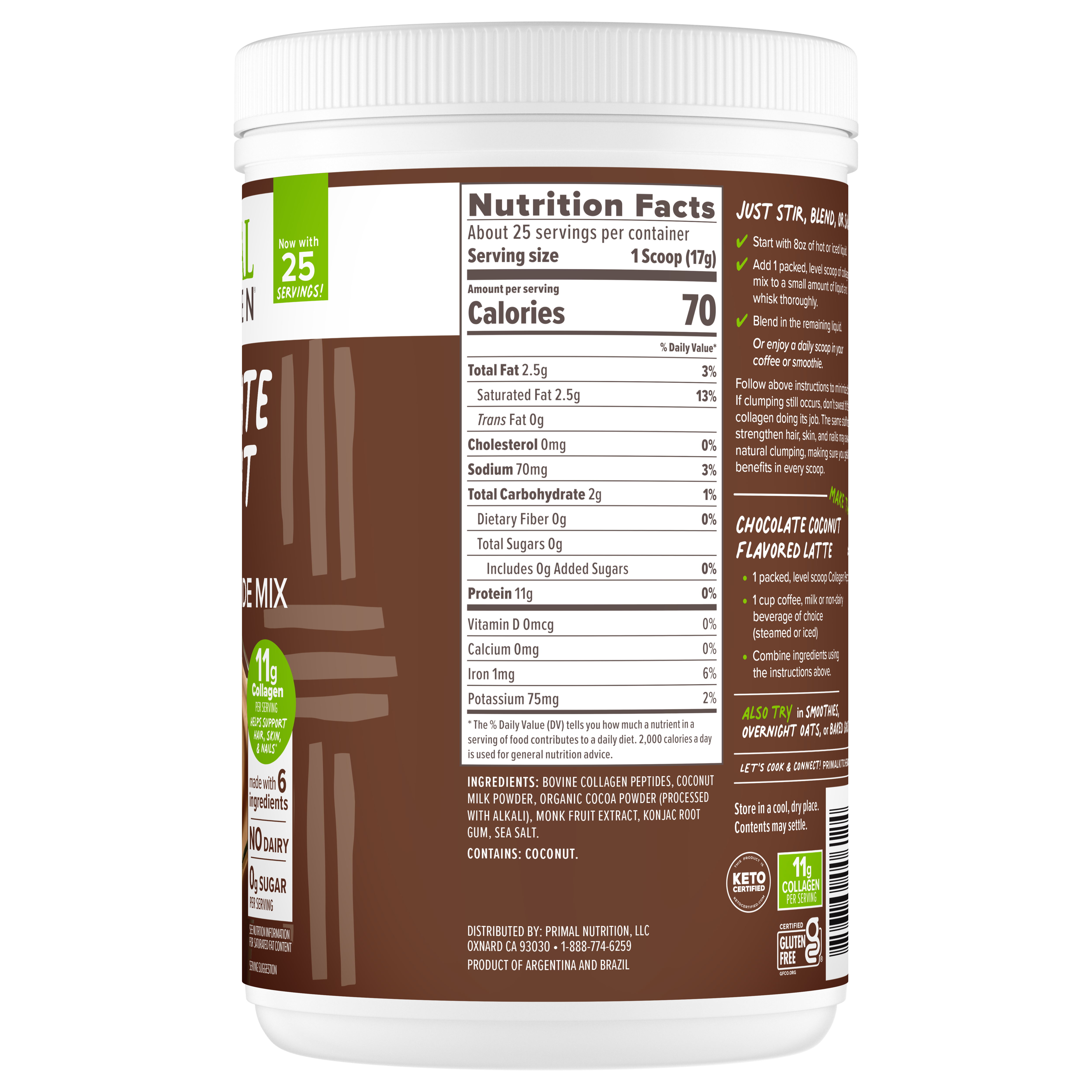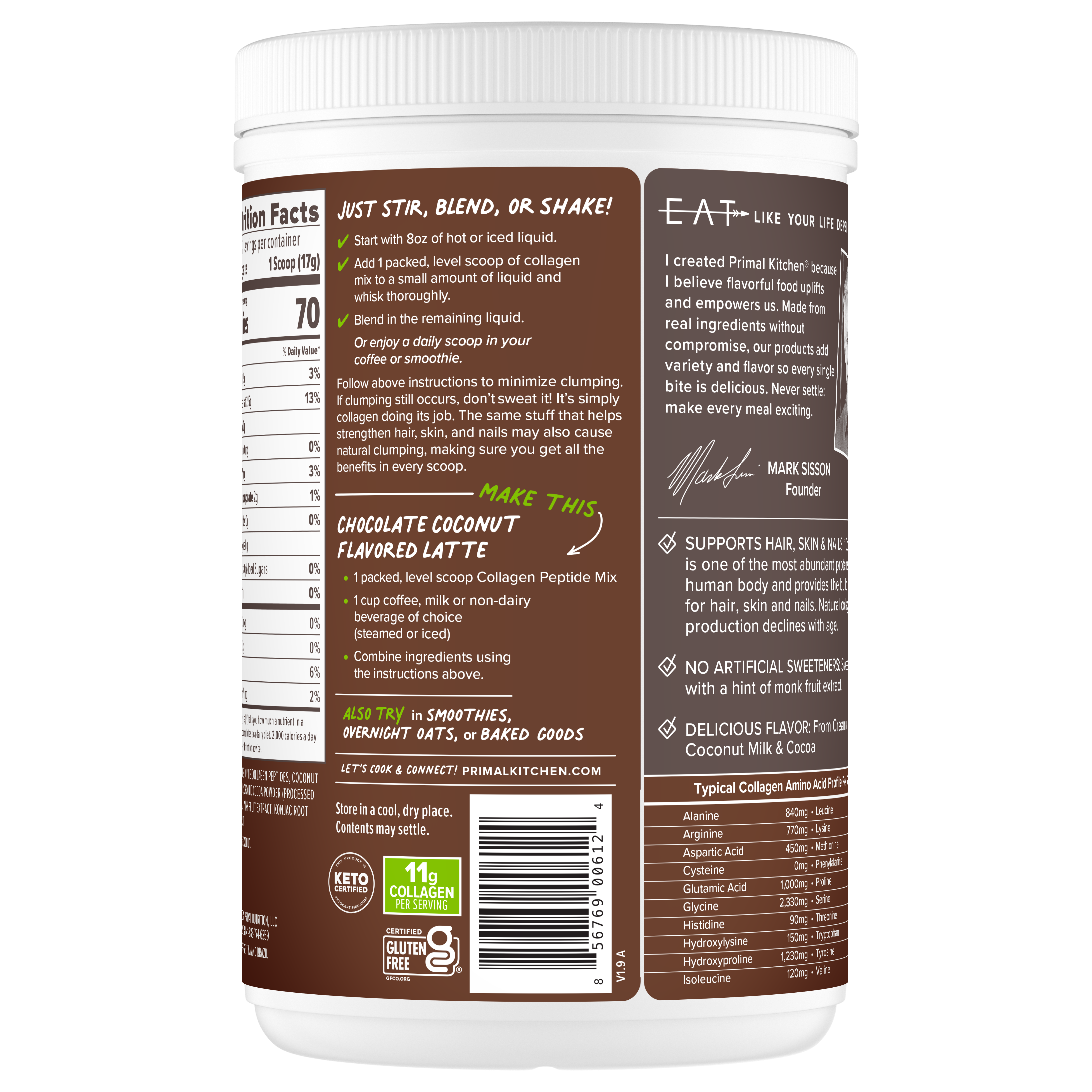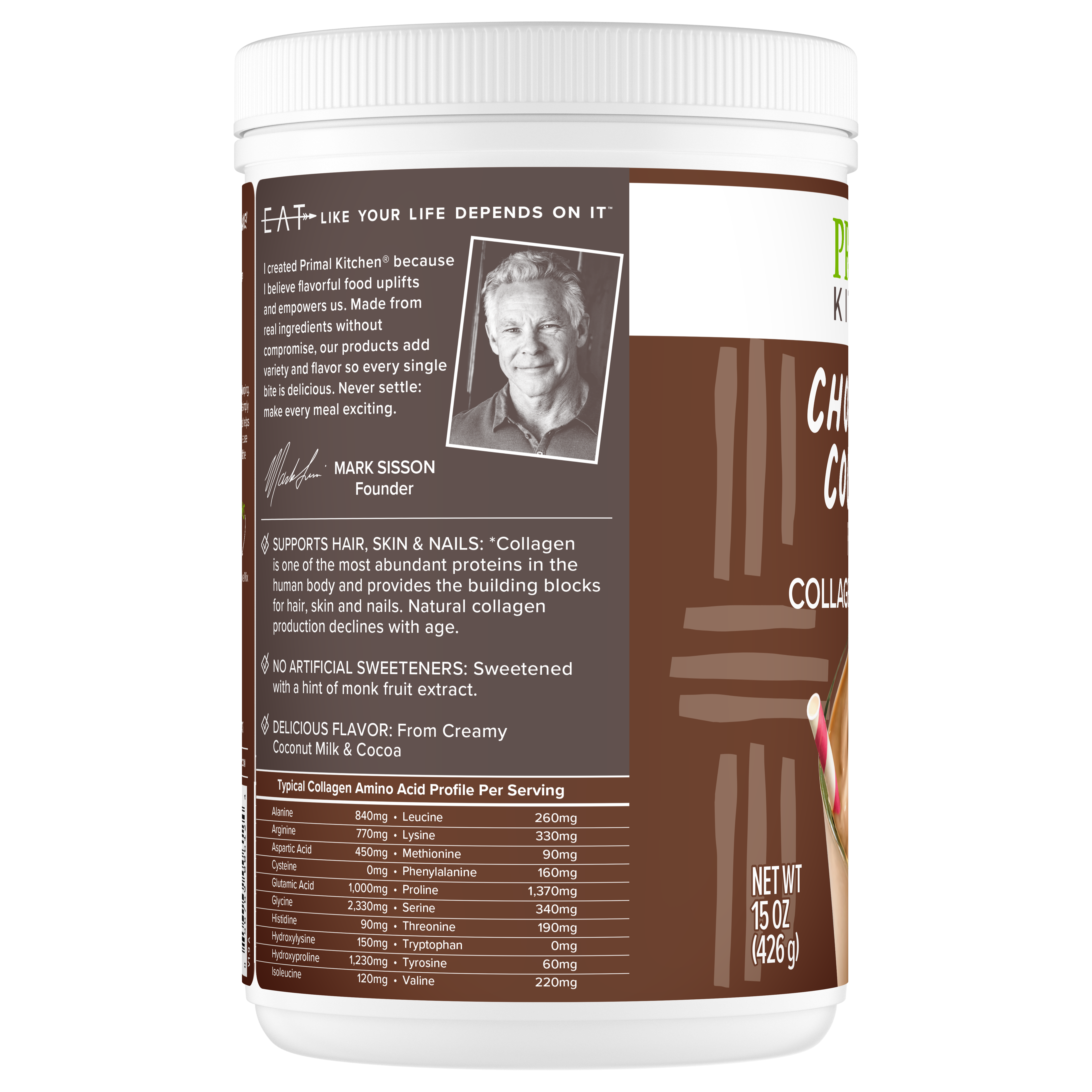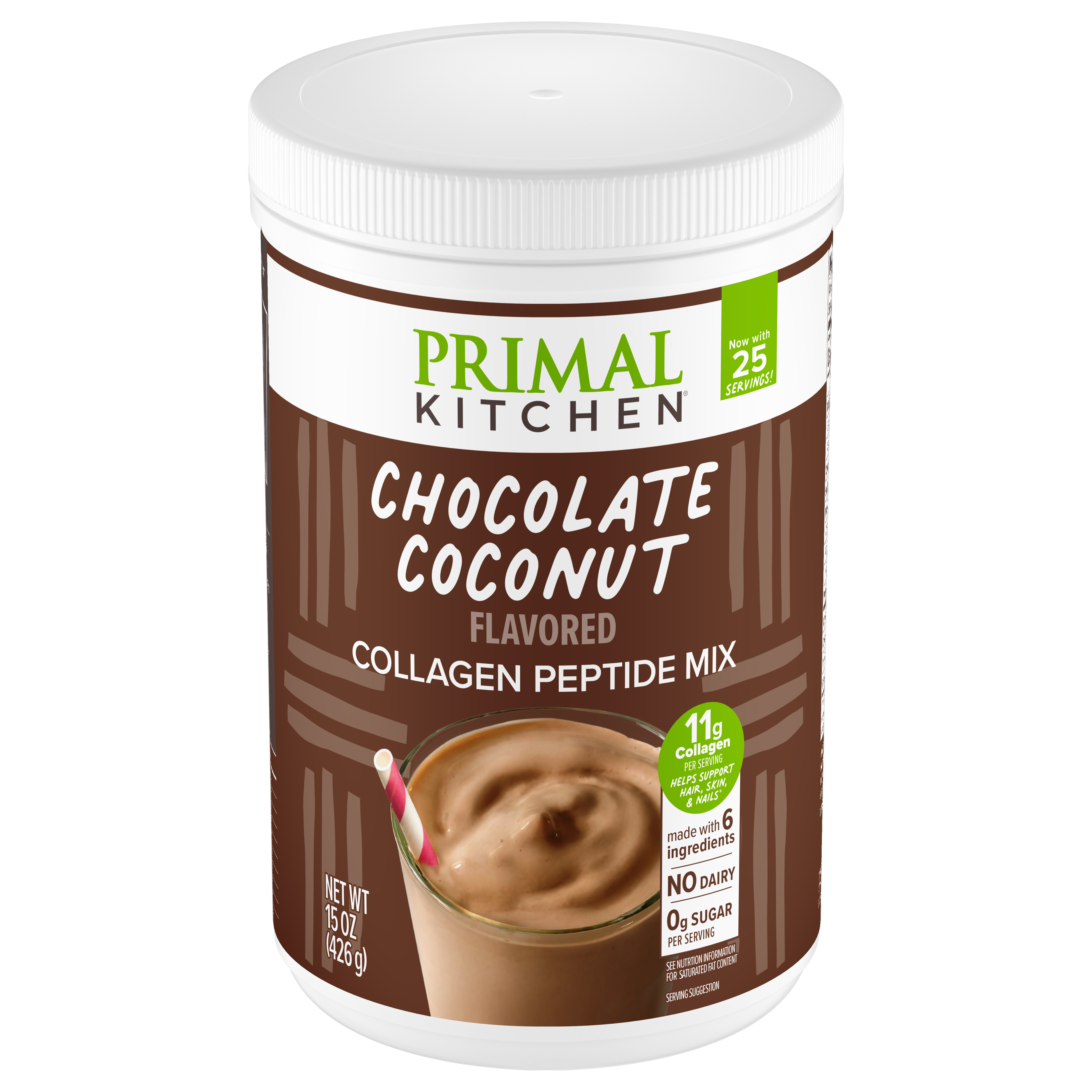 Product Description PRIMAL KITCHEN(™) COLLAGEN FUEL® Drink Mix is the delicious ingredient to help support hair, skin, and nails! Organic, fair-trade cocoa and coconut milk powders pair perfectly with smoothies, coffee, and much more, while collagen peptides pack a punch. Tasty stirred, shaken, or blended.