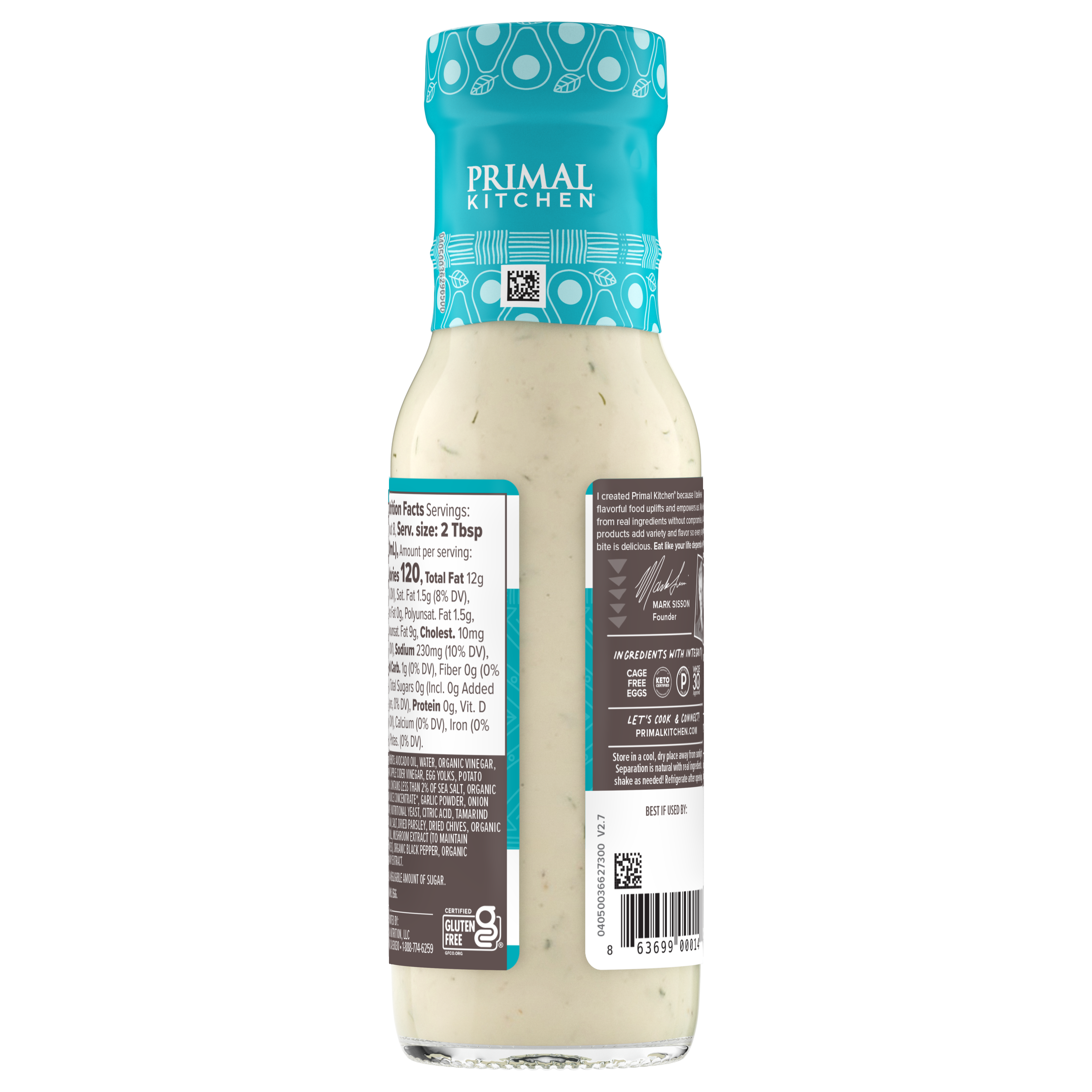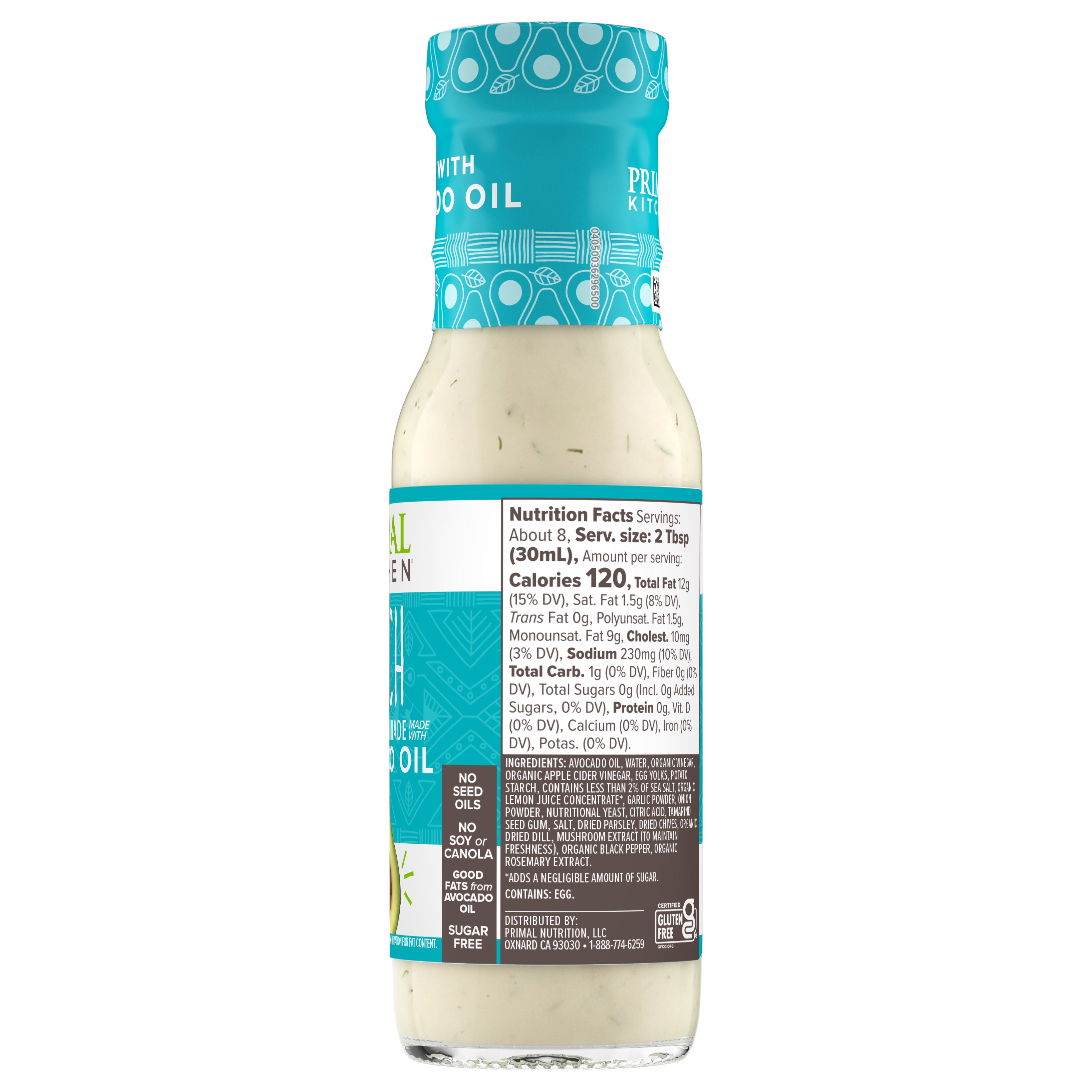 GTIN 00863699000146 Product Status Active Pack Level EACH Brand Name PRIMAL KITCHEN Business Unit Elevation Catalog Platform Primal Kitchen Consumer Unit Size 8 Consumer Unit Size UOM OZ Computed Exports - Ingredients AVOCADO OIL, WATER, ORGANIC VINEGAR, ORGANIC APPLE CIDER VINEGAR, EGG YOLKS, POTATO STARCH, CONTAINS LESS THAN 2% OF SEA SALT, ORGANIC LEMON JUICE CONCENTRATE*, GARLIC POWDER, ONION POWDER, NUTRITIONAL YEAST, CITRIC ACID, TAMARIND SEED GUM, SALT, DRIED PARSLEY, DRIED CHIVES, ORGANIC DRIED DILL, MUSHROOM EXTRACT (TO MAINTAIN FRESHNESS), ORGANIC BLACK PEPPER, ORGANIC ROSEMARY EXTRACT. *ADDS A NEGLIGIBLE AMOUNT OF SUGAR. Parent Reference 10863699000143 Storage Instructions Store Ambient Temperature Classification Code 01 Net Weight 0.5 Gross Weight 1.2 Weight UOM LB Height (in) 7.25 Length/Depth (in) 2.2 Width (in) 2.2 Case Cube 0.02 Parent Relation CASE_10863699000143 Product Title Primal Kitchen Ranch Dressing & Marinade 8 fl eCommerce Product Name (Generic Name) Ranch Dressing & Marinade Product Benefits (Includes Seasonal + Formatting) - The dressing that started it all—kids love the taste and moms love the ingredients! Our Ranch Dressing is crafted with premium ingredients like avocado oil for a refreshingly cool and classic flavor that tastes homemade.