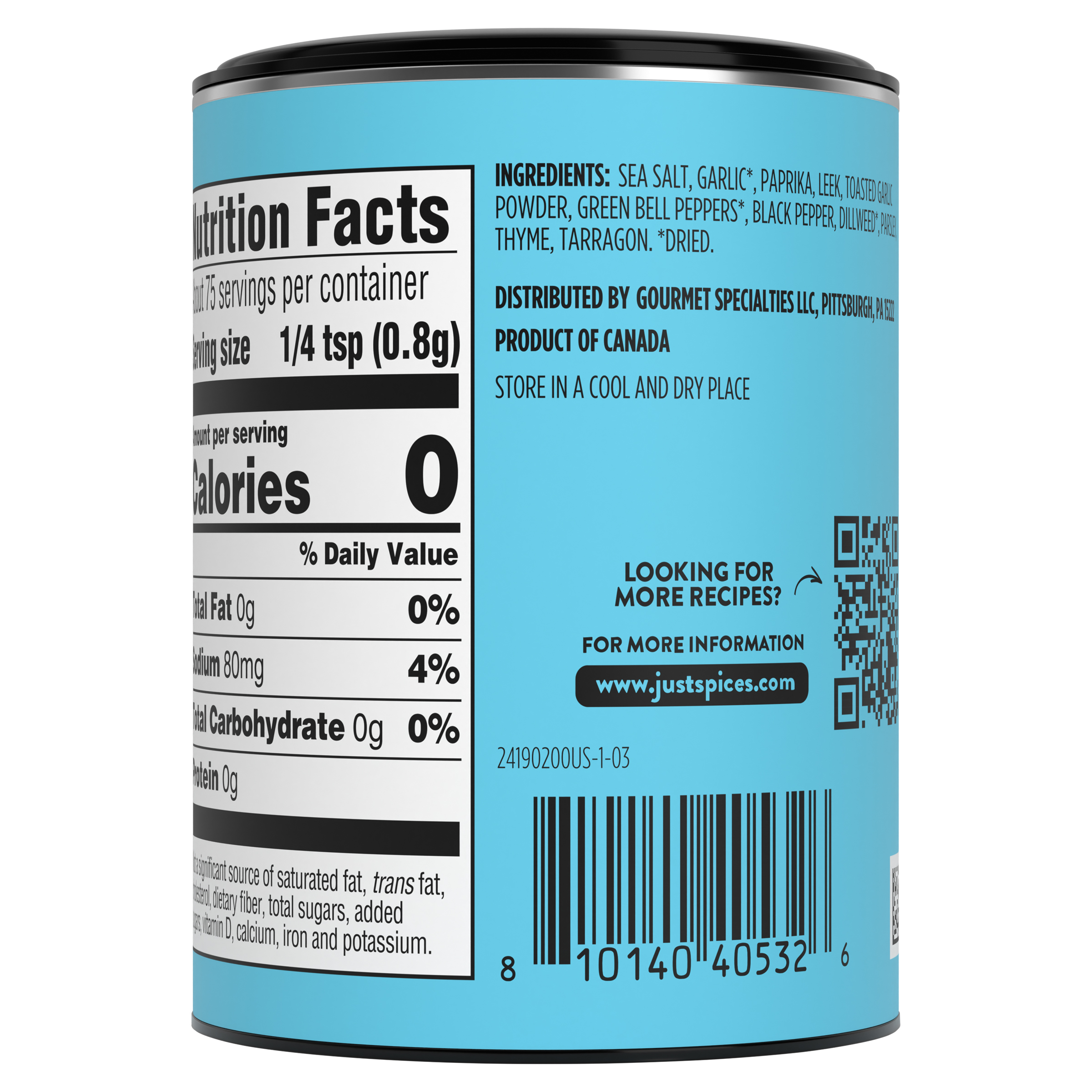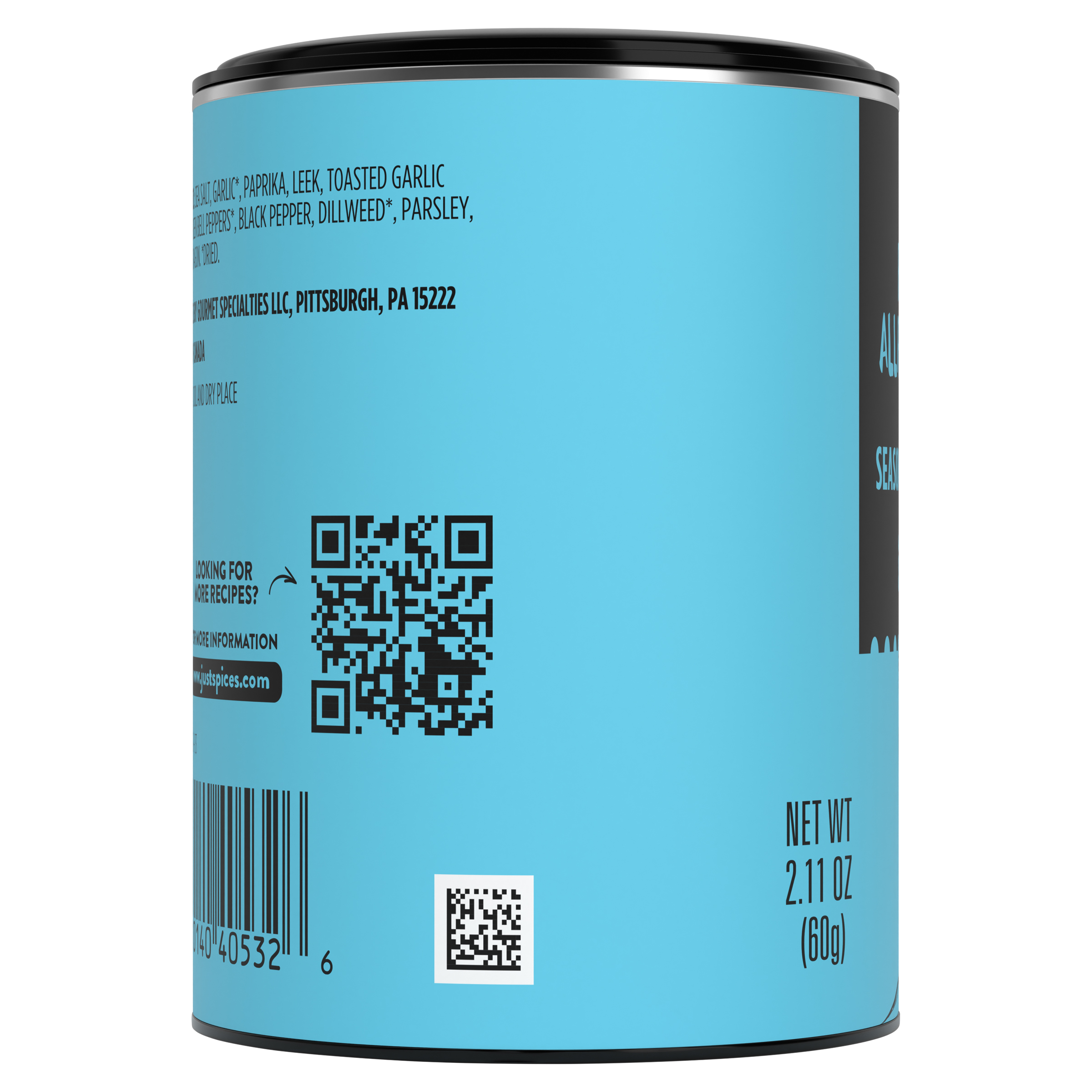 GTIN 04262386343348 Kraft Item Code (SKU) 42623863433470 Product Status Active Pack Level EACH Brand Name Just Spices Business Unit Just Spices Catalog Platform Just Spices Consumer Unit Size 2.11 Consumer Unit Size UOM OZ Packaging Type (Computed) Jar Packaging Type Code JAR Sub Units Per Item 1 Variant Fish Allrounder Global Product Classification Code 10000049 Computed Exports - Ingredients SEA SALT FLAKES, GARLIC*, PAPRIKA, LEEK, TOASTED GARLIC*, GREEN BELL PEPPERS*, BLACK PEPPER, DILL, PARSLEY, THYME, TARRAGON, LEMON MYRTLE. *DRIED. Storage Instructions Store in a Cool and Dry Place Customer Guarantee 90 Temperature Classification Code 01 Net Weight 0.132 Gross Weight 0.173 Weight UOM LB Height (in) 2.874 Length/Depth (in) 2.205 Width (in) 2.205 Case Cube 0.008 Product Title Just Spices Fish Allrounder Seasoning Blend, 2.11 oz Can Product Description Just Spices Fish Allrounder Seasoning Blend, 2.11 oz Can