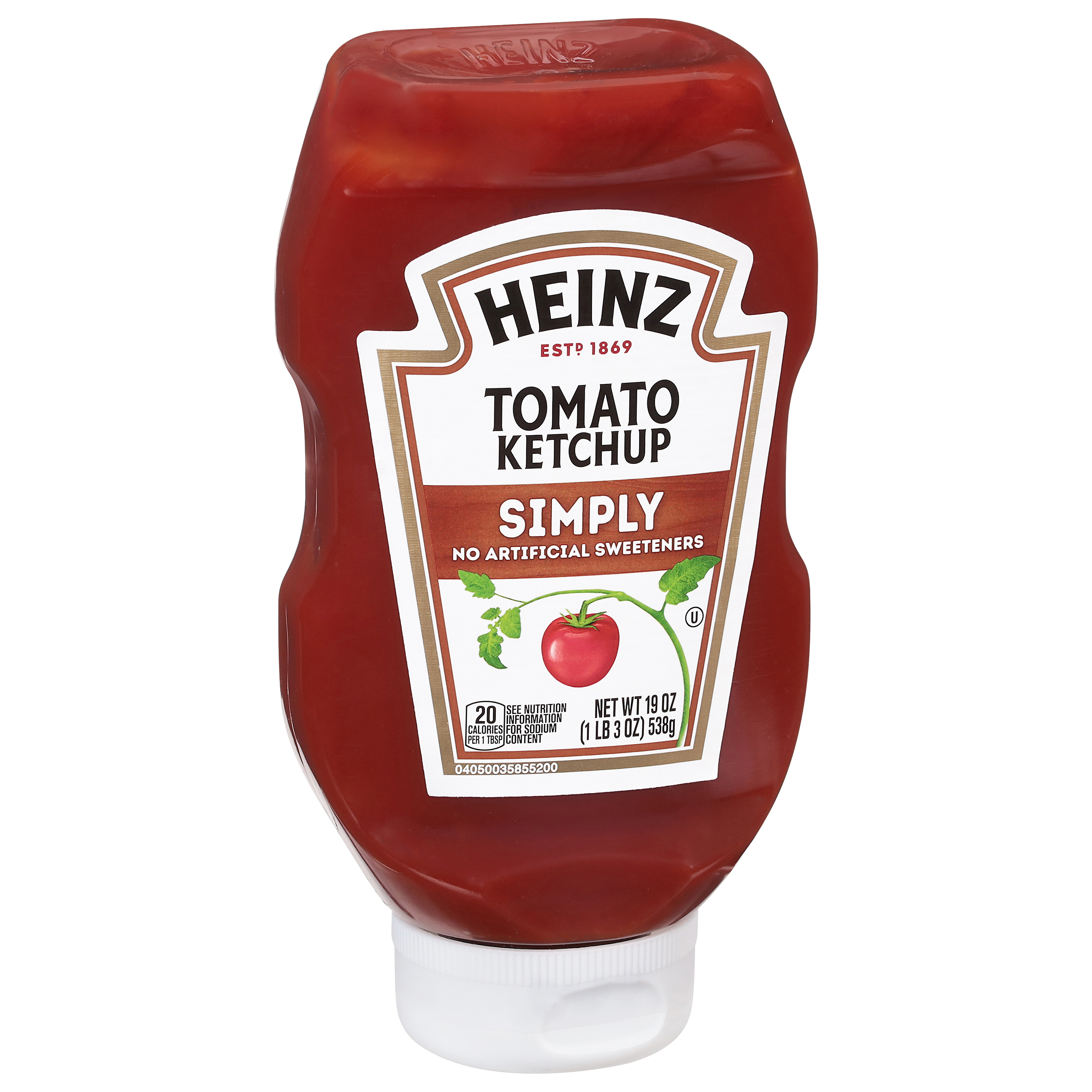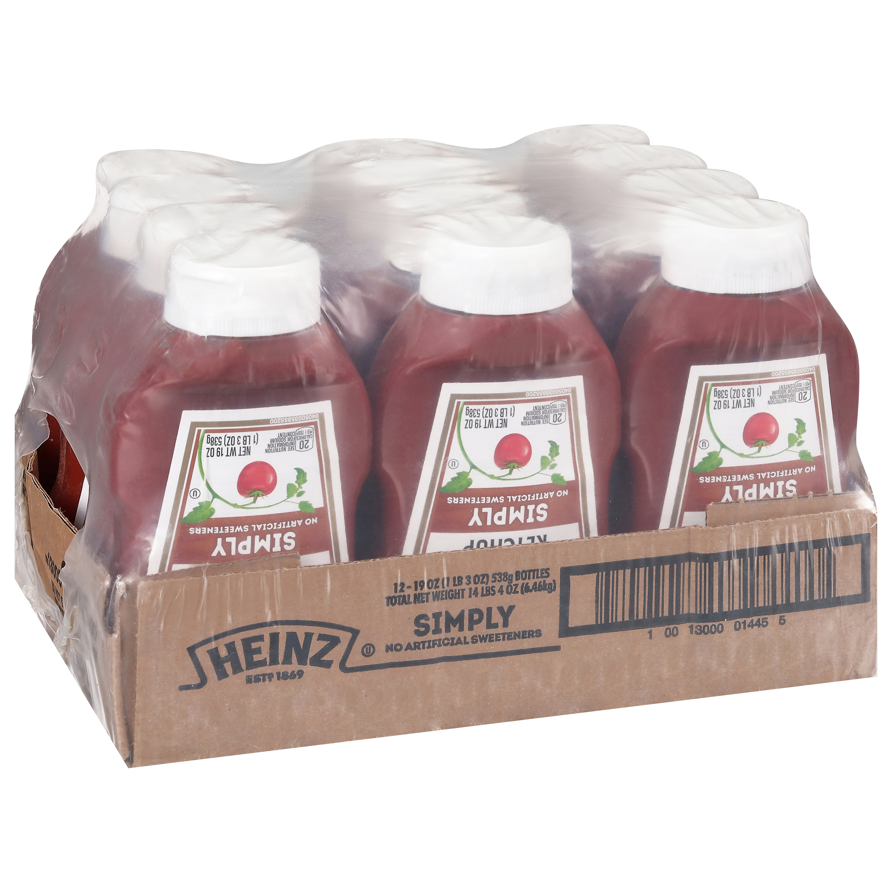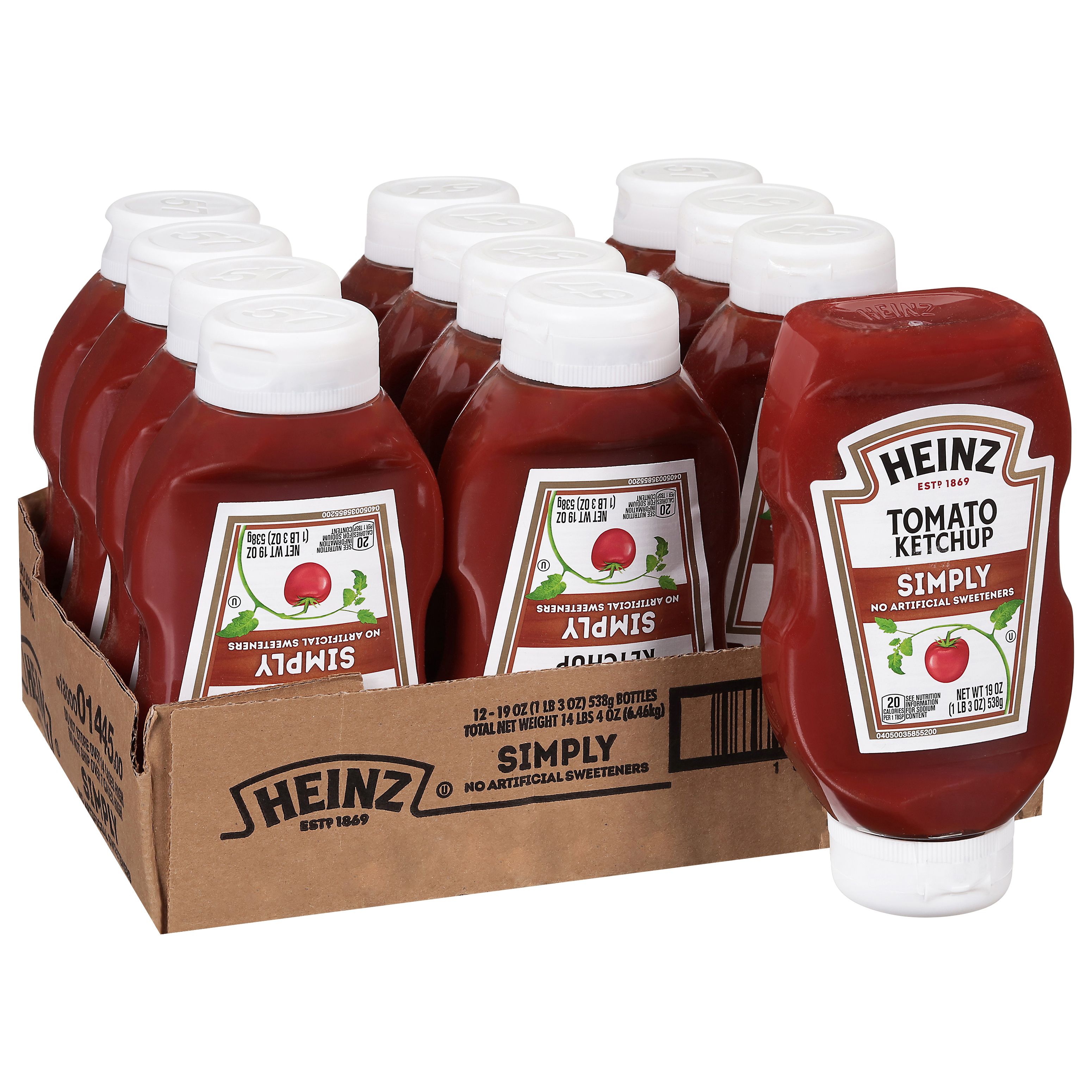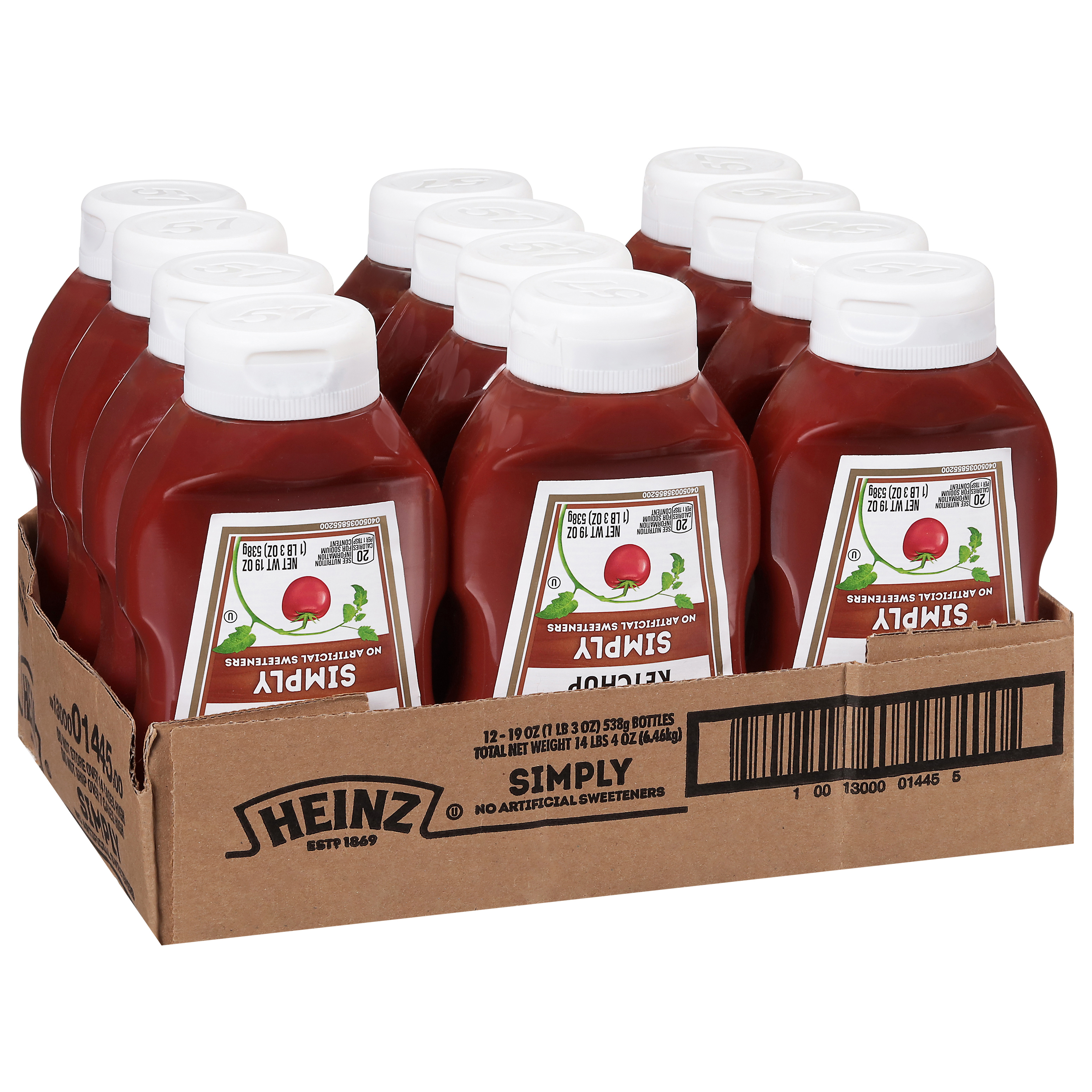 GTIN 10013000014455 Kraft Item Code (SKU) 00130000144500 Product Status Active Pack Level CASE Brand Name SIMPLY HEINZ Business Unit Elevation Catalog Platform Taste Elevation Product Category Ketchup Consumer Unit Size 19 Consumer Unit Size UOM OZ Packaging Type (Computed) Box Packaging Type Code BOX/CARTON Sub Units Per Item 12 Sub Variant Simply Global Product Classification Code 10006325 Computed Exports - Ingredients TOMATO CONCENTRATE FROM RED RIPE TOMATOES, DISTILLED VINEGAR, CANE SUGAR, SALT, ONION POWDER, SPICE, NATURAL FLAVORING. Parent Reference 20013000014452 Child Reference 00013000014458 Customer Guarantee 180 Temperature Classification Code 01 Net Weight 14.25 Gross Weight 15.756 Weight UOM LB Height (in) 7.125 Length/Depth (in) 11.375 Width (in) 9.063 Case Cube 0.425 Child Relation EACH_00013000014458 Parent Relation PALLET_20013000014452 Cases per Tier 17 Tiers per Pallet 7 Cases per Pallet 119 Pallet Stack Limit 1 Product Title Simply Heinz Tomato Ketchup, 12 ct Case Product Description Simply Heinz Tomato Ketchup, 12 ct Case