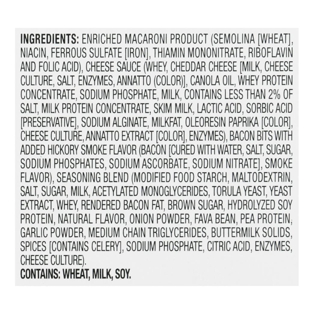 GTIN 10021000070449 Kraft Item Code (SKU) 00210000704400 Product Status Active Pack Level CASE Brand Name DEVOUR Business Unit Hydration Desserts & Meals Catalog Platform Easy Ready Meals Product Category Other Dinners Consumer Unit Size 4 Consumer Unit Size UOM OZ Packaging Type (Computed) Box Packaging Type Code BOX/CARTON Sub Units Per Item 6 Variant Sharp Cheddar And Bacon Global Product Classification Pasta/Noodles - Not Ready to Eat (Perishable) Global Product Classification Code 10000242 Computed Exports - Ingredients ENRICHED MACARONI PRODUCT (SEMOLINA [WHEAT], NIACIN, FERROUS SULFATE [IRON], THIAMIN MONONITRATE, RIBOFLAVIN AND FOLIC ACID), CHEESE SAUCE (WHEY, CHEDDAR CHEESE [MILK, CHEESE CULTURE, SALT, ENZYMES, ANNATTO (COLOR)], CANOLA OIL, WHEY PROTEIN CONCENTRATE, SODIUM PHOSPHATE, MILK, CONTAINS LESS THAN 2% OF SALT, MILK PROTEIN CONCENTRATE, SKIM MILK, LACTIC ACID, SORBIC ACID [PRESERVATIVE], SODIUM ALGINATE, MILKFAT, OLEORESIN PAPRIKA [COLOR], CHEESE CULTURE, ANNATTO EXTRACT [COLOR], ENZYMES), COOKED BACON BITS (BACON [CURED WITH WATER, SALT, SUGAR, SODIUM PHOSPHATES, SODIUM ASCORBATE, SODIUM NITRITE]), SEASONING BLEND (MODIFIED FOOD STARCH, MALTODEXTRIN, SALT, SUGAR, MILK, ACETYLATED MONOGLYCERIDES, TORULA YEAST, YEAST EXTRACT, WHEY, RENDERED BACON FAT, BROWN SUGAR, HYDROLYZED SOY PROTEIN, NATURAL FLAVOR, ONION POWDER, FAVA BEAN, PEA PROTEIN, GARLIC POWDER, MEDIUM CHAIN TRIGLYCERIDES, BUTTERMILK SOLIDS, SPICES [CONTAINS CELERY], SODIUM PHOSPHATE, CITRIC ACID, ENZYMES, CHEESE CULTURE). Parent Reference 20021000070446 Child Reference 00021000070442 Customer Guarantee 60 Temperature Classification Protected 1 to 35 °C / 34 to 95 °F Temperature Classification Code 09 Net Weight 1.5 Gross Weight 2.449 Weight UOM LB Height (in) 6.813 Length/Depth (in) 15.188 Width (in) 5.875 Case Cube 0.352 Child Relation EACH_00021000070442 Parent Relation PALLET_20021000070446 Cases per Tier 20 Tiers per Pallet 6 Cases per Pallet 120 Pallet Stack Limit 2 Product Title DEVOUR 4 OZ SINGLE SERVE CONVENIENCE MEALS SHARP CHEDDAR MAC & CHEESE WITH BACON 6 BOX/CARTON CASE Product Description Sharp Cheddar Mac & Cheese with Bacon