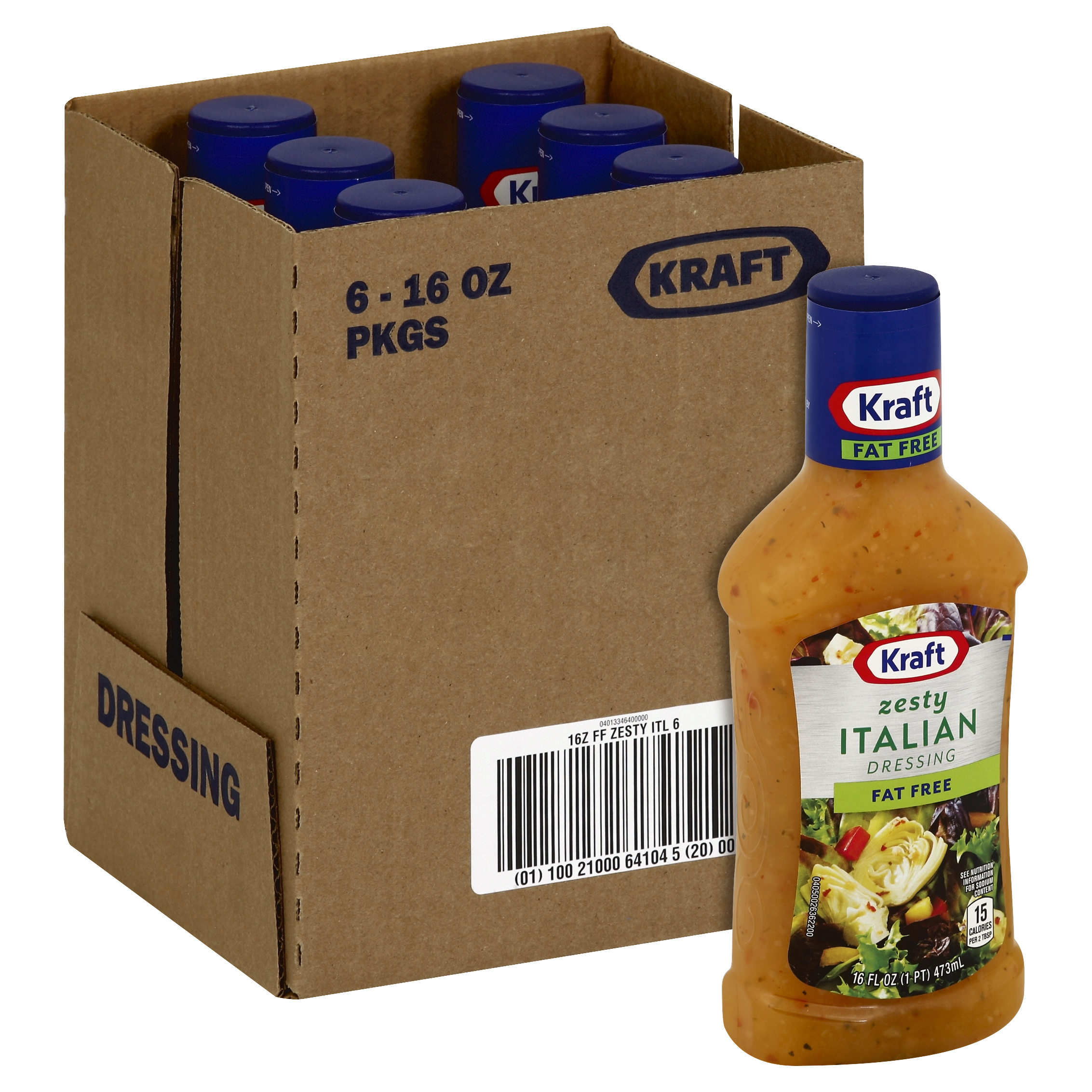 Product Description Kraft Zesty Italian Fat Free Dressing adds delicious flavor to virtually any dish. Savor the rich taste of bold spices blended with tangy vinegar and the perfect amount of sugar for a touch of sweetness. This dressing makes an excellent chicken marinade or Italian sub dressing, or make a cold pasta salad with Italian dressing for your next cookout. This fat free dressing contains no high fructose corn syrup or MSG added, and at 15 calories per serving you can feel good about adding it to recipes. The resealable 16 fluid ounce bottles keep this Italian salad dressing fresh until you're ready to use it.