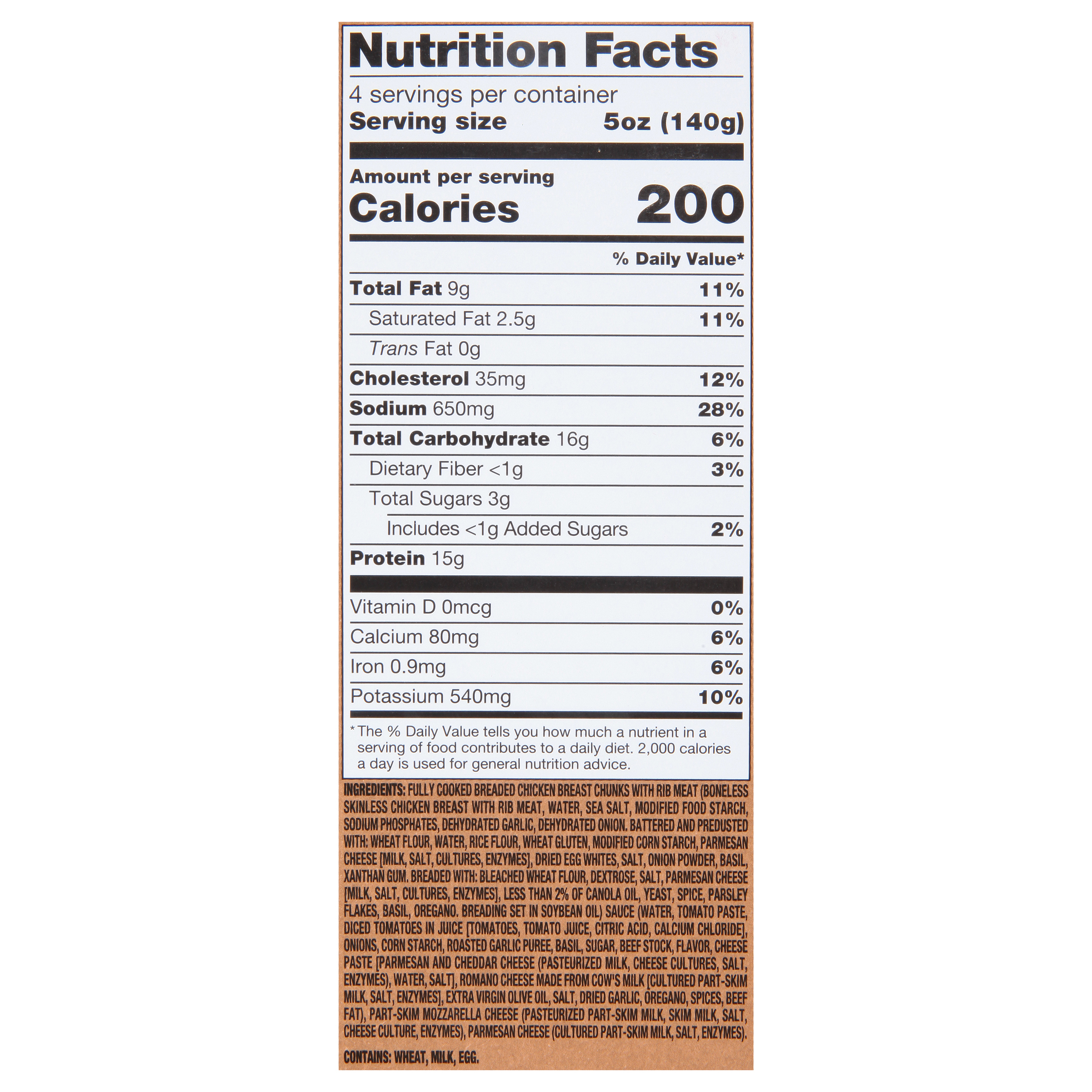 GTIN 10025155000658 Kraft Item Code (SKU) 00251550006500 Product Status Active Pack Level CASE Brand Name HOMEBAKE 425/30 Business Unit Hydration Desserts & Meals Catalog Platform Easy Ready Meals Product Category Frozen Meals - Full Calorie Consumer Unit Size 19.8 Consumer Unit Size UOM OZ Packaging Type (Computed) Box Packaging Type Code BOX/CARTON Sub Units Per Item 5 Variant Chicken Parmesan Global Product Classification Code 10006754 Computed Exports - Ingredients FULLY COOKED BREADED CHICKEN BREAST CHUNKS WITH RIB MEAT (BONELESS SKINLESS CHICKEN BREAST WITH RIB MEAT, WATER, SEA SALT, MODIFIED FOOD STARCH, SODIUM PHOSPHATES, DEHYDRATED GARLIC, DEHYDRATED ONION. BATTERED AND PREDUSTED WITH: WHEAT FLOUR, WATER, RICE FLOUR, WHEAT GLUTEN, MODIFIED CORN STARCH, PARMESAN CHEESE [MILK, SALT, CULTURES, ENZYMES], DRIED EGG WHITES, SALT, ONION POWDER, BASIL, XANTHAN GUM. BREADED WITH: BLEACHED WHEAT FLOUR, DEXTROSE, SALT, PARMESAN CHEESE [MILK, SALT, CULTURES, ENZYMES], LESS THAN 2% OF CANOLA OIL, YEAST, SPICE, PARSLEY FLAKES, BASIL, OREGANO. BREADING SET IN SOYBEAN OIL) SAUCE (WATER, TOMATO PASTE, DICED TOMATOES IN JUICE [TOMATOES, TOMATO JUICE, CITRIC ACID, CALCIUM CHLORIDE], ONIONS, CORN STARCH, ROASTED GARLIC PUREE, BASIL, SUGAR, BEEF STOCK, FLAVOR, CHEESE PASTE [PARMESAN AND CHEDDAR CHEESE (PASTURIZED MILK, CHEESE CULTURES, SALT, ENZYMES), WATER, SALT], ROMANO CHEESE MADE FROM COW'S MILK [CULTURED PART-SKIM MILK, SALT, ENZYMES], EXTRA VIRGIN OLIVE OIL, SALT, DRIED GARLIC, OREGANO, SPICES, BEEF FAT), PART-SKIM MOZZARELLA CHEESE (PASTEURIZED PART-SKIM MILK, SKIM MILK, SALT, CHEESE CULTURE, ENZYMES), PARMESAN CHEESE (CULTURED PART-SKIM MILK, SALT, ENZYMES). Parent Reference 20025155000655 Child Reference 00025155000651 Customer Guarantee 120 Temperature Classification Code 08 Net Weight 6.188 Gross Weight 7.658 Weight UOM LB Height (in) 10.75 Length/Depth (in) 10.5 Width (in) 9.25 Case Cube 0.604 Child Relation EACH_00025155000651 Parent Relation PALLET_20025155000655 Cases per Tier 18 Tiers per Pallet 7 Cases per Pallet 126 Pallet Stack Limit 1 Product Title Homebake 425°/:30 Chicken Parmesan Frozen Meal, 5 ct Case eCommerce Product Name (Generic Name) Homebake Chicken Parmesan Frozen Meal Product Description Homebake 425°/:30 Chicken Parmesan Frozen Meal, 5 ct Case