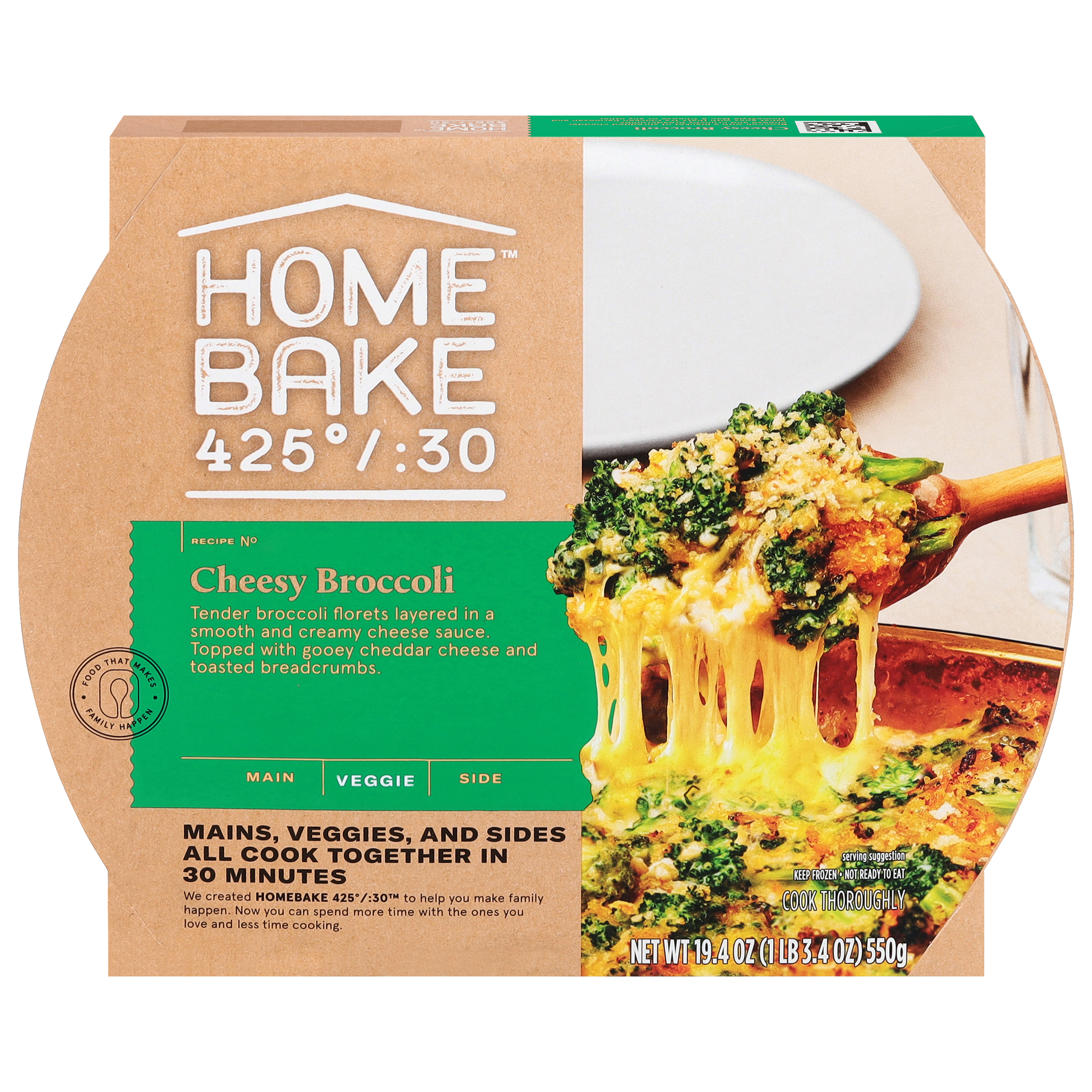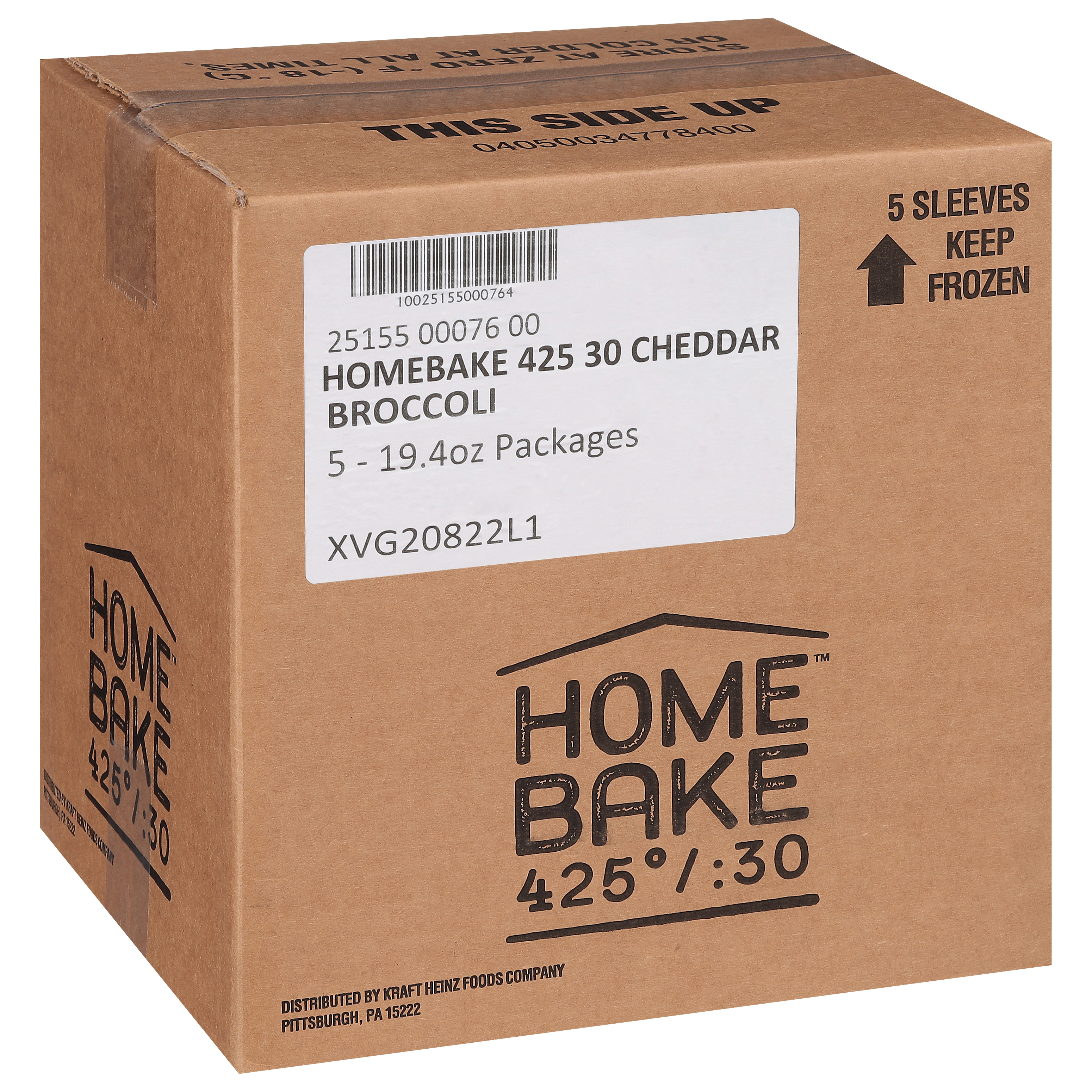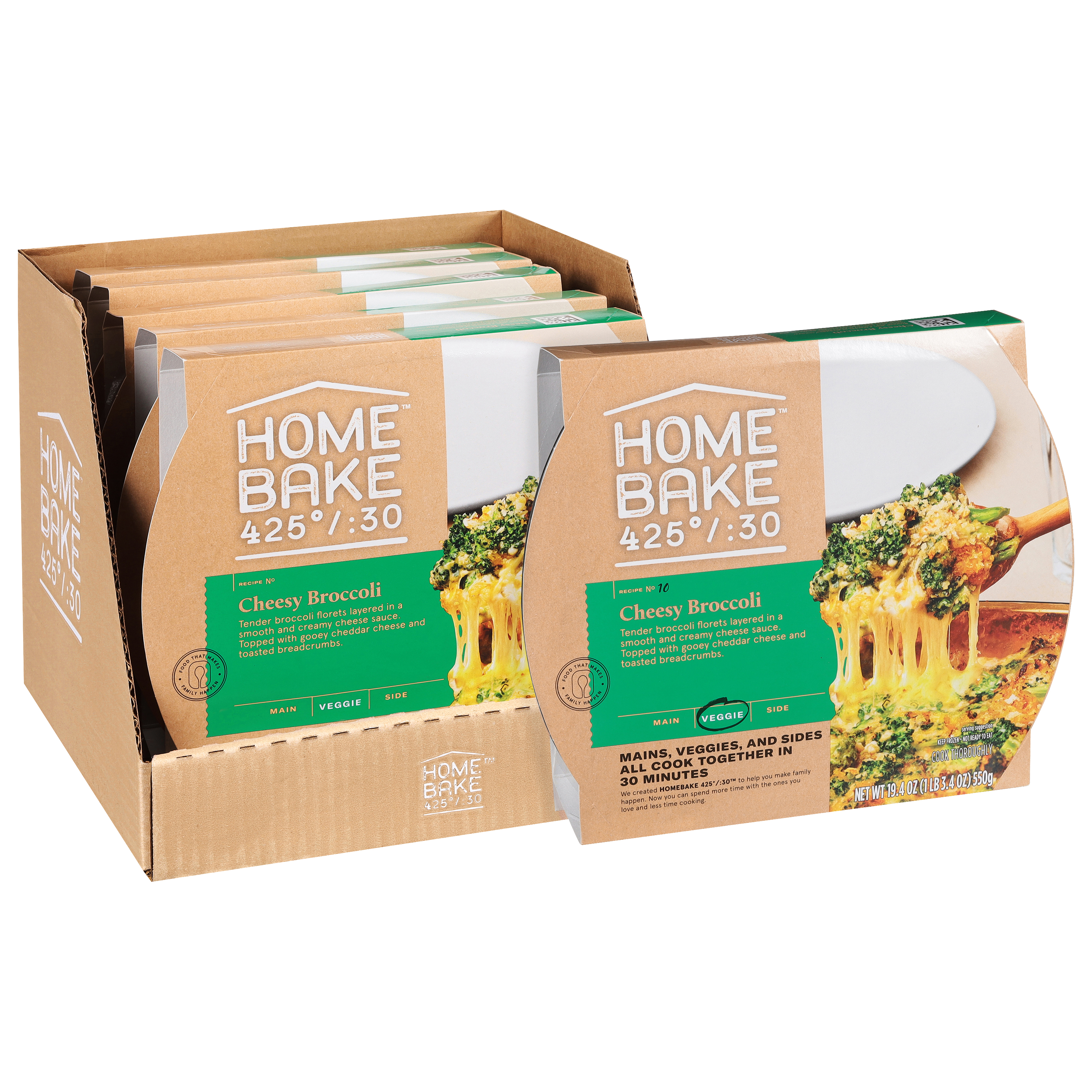 GTIN 10025155000764 Kraft Item Code (SKU) 00251550007600 Product Status Active Pack Level CASE Brand Name HOMEBAKE 425/30 Business Unit Hydration Desserts & Meals Catalog Platform Easy Ready Meals Product Category Frozen Meals - Full Calorie Consumer Unit Size 19.4 Consumer Unit Size UOM OZ Packaging Type (Computed) Box Packaging Type Code BOX/CARTON Sub Units Per Item 5 Variant Cheesy Broccoli Global Product Classification Code 10006754 Computed Exports - Ingredients BROCCOLI, SAUCE (WATER, PASTEURIZED PROCESS WHITE CHEDDAR CHEESE [CHEDDAR CHEESE (CULTURED MILK, SALT, ENZYMES), WATER, SODIUM PHOSPHATE, MILKFAT, SALT], SHARP CHEDDAR CHEESE [PASTEURIZED MILK AND CREAM, CHEESE CULTURE, SALT, ENZYMES, ANNATTO (COLOR)], HALF & HALF [MILK, CREAM], WHEY PROTEIN CONCENTRATE, ROASTED GARLIC PUREE, CORN STARCH, CHEESE FLAVOR BLEND [CHEDDAR CHEESE (PASTEURIZED MILK, CHEESE CULTURES, SALT, ENZYMES), WATER, SODIUM PHOSPHATE, ENZYMES], SALT, SODIUM PHOSPHATE, BLACK PEPPER), BREAD CRUMBS (WHEAT FLOUR, SUGAR, YEAST, SUNFLOWER OIL, SALT), SHARP CHEDDAR CHEESE (PASTEURIZED MILK AND CREAM, CHEESE CULTURE, SALT, ENZYMES, ANNATTO [COLOR]). Parent Reference 20025155000761 Child Reference 00025155000767 Customer Guarantee 120 Temperature Classification Code 08 Net Weight 6.062 Gross Weight 7.532 Weight UOM LB Height (in) 10.75 Length/Depth (in) 10.5 Width (in) 9.25 Case Cube 0.604 Child Relation EACH_00025155000767 Parent Relation PALLET_20025155000761 Cases per Tier 18 Tiers per Pallet 7 Cases per Pallet 126 Pallet Stack Limit 1 Product Title Homebake 425°/:30 Cheesy Broccoli Veggie Dish, 5 ct Case (Frozen) eCommerce Product Name (Generic Name) Homebake Cheesy Broccoli Veggie Dish Product Description Homebake 425°/:30 Cheesy Broccoli Veggie Dish, 5 ct Case (Frozen)