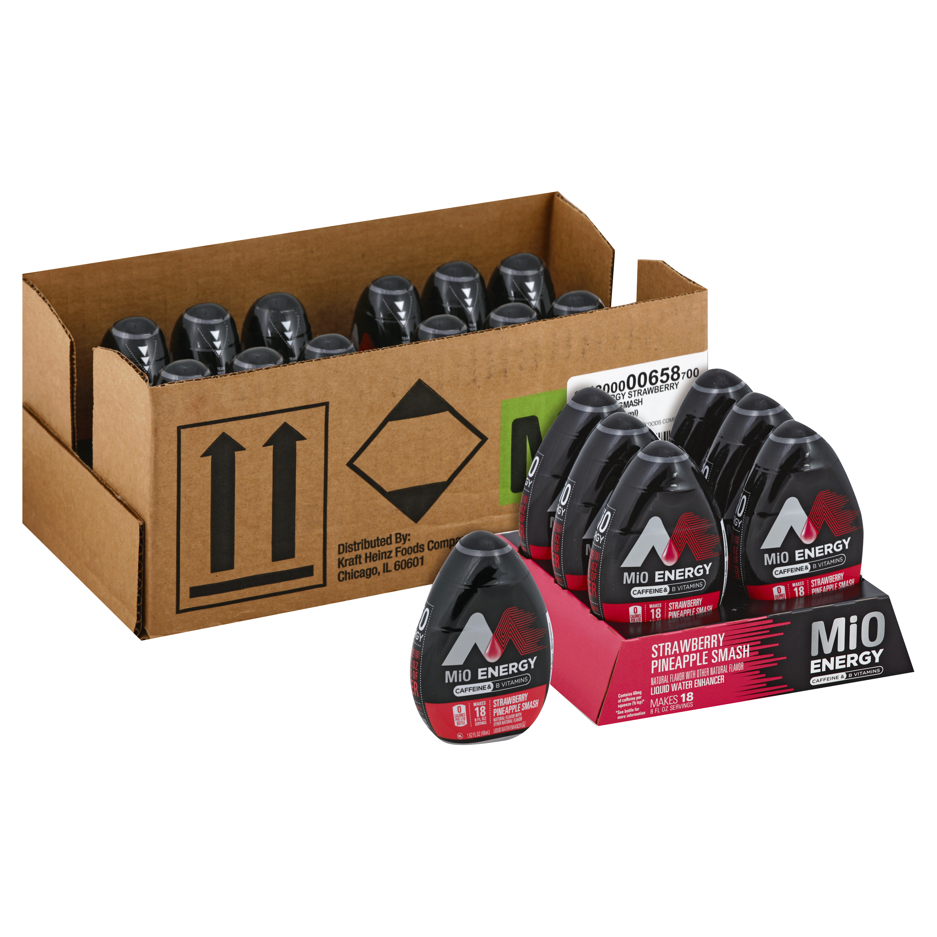 GTIN 10043000006587 Kraft Item Code (SKU) 00430000065800 Product Status Active Pack Level CASE Brand Name Mio Business Unit Hydration Desserts & Meals Catalog Platform Hydration Product Category Total Liquid Concentrates Consumer Unit Size 1.62 Consumer Unit Size UOM FO Packaging Type (Computed) Box Packaging Type Code BOX/CARTON Sub Units Per Item 12 Variant Strawberry Pineapple Global Product Classification Drinks Flavoured - Not Ready to Drink Global Product Classification Code 10000202 Computed Exports - Ingredients WATER, CITRIC ACID, MALIC ACID, CAFFEINE, CONTAINS LESS THAN 2% OF TAURINE, GUARANA EXTRACT, GINSENG EXTRACT (PANAX), NIACINAMIDE (VITAMIN B3), VITAMIN B6, VITAMIN B12, NATURAL FLAVOR, SUCRALOSE AND ACESULFAME POTASSIUM (SWEETENER), SODIUM CITRATE, POTASSIUM CITRATE, GUM ARABIC, SUCROSE ACETATE ISOBUTYRATE, YELLOW 5, RED 40, POTASSIUM SORBATE (PRESERVATIVE). Parent Reference 20043000006584 Child Reference 00043000006580 Customer Guarantee 120 Temperature Classification Ambient Prevailing Conditions Temperature Classification Code 01 Net Weight 1.215 Gross Weight 2.191 Weight UOM LB Height (in) 4.563 Length/Depth (in) 10.875 Width (in) 6.063 Case Cube 0.174 Child Relation EACH_00043000006580 Parent Relation PALLET_20043000006584 Cases per Tier 26 Tiers per Pallet 9 Cases per Pallet 234 Pallet Stack Limit 2 Product Title MiO Energy Strawberry Pineapple Smash Liquid Water Enhancer, 6 ct Pack, 1.62 fl oz Bottles Product Benefits (Includes Seasonal + Formatting) - Six 1.62 fl oz bottles of MiO Versatile Fruit Variety Naturally Flavored Liquid Water Enhancer