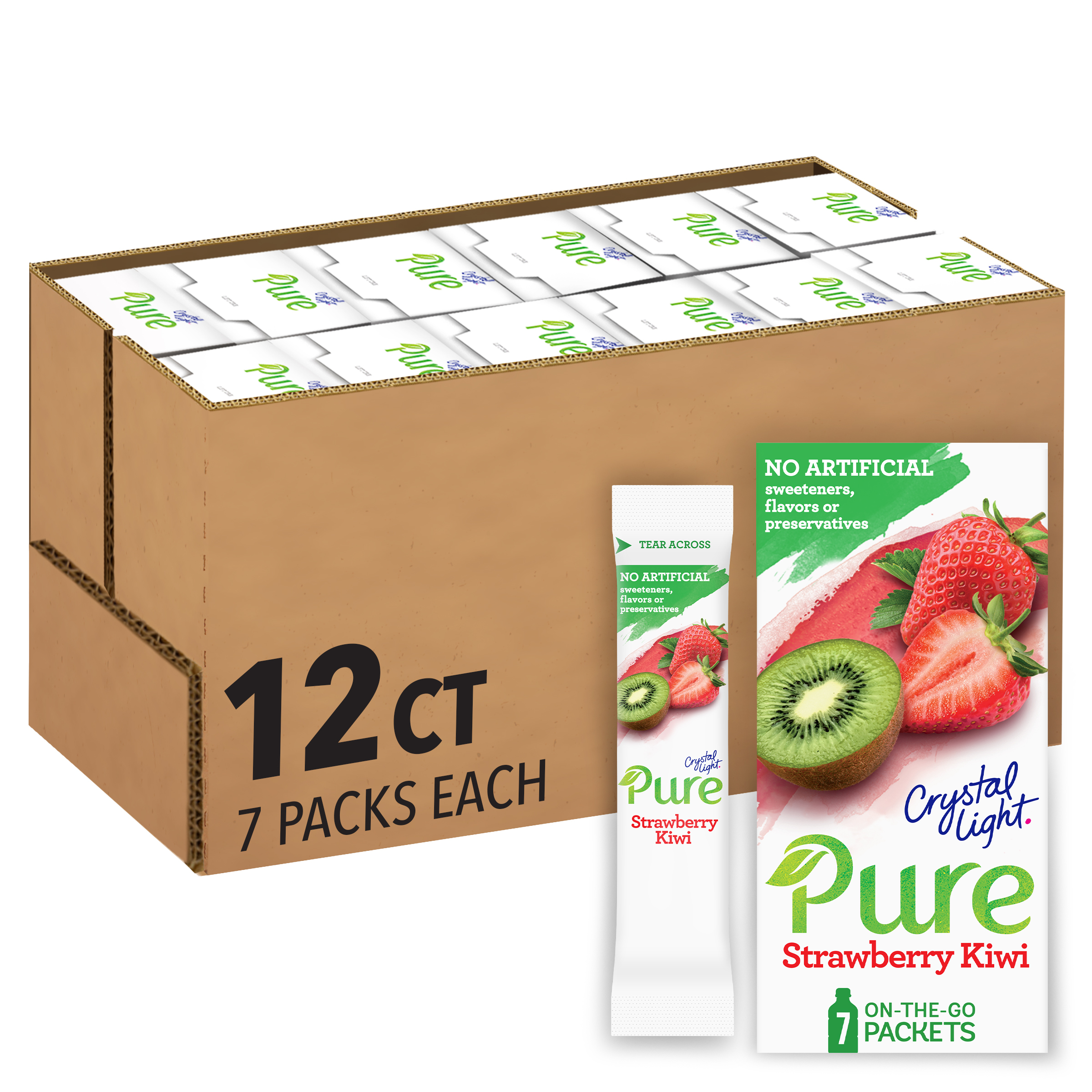 Product Description Crystal Light Pure Strawberry Kiwi On-the-Go Powdered Drink Mix is a deliciously fruity drink you can enjoy anywhere. Crystal Light drink mix contains no artificial sweeteners, flavors or preservatives, and has 90 percent fewer calories than other leading beverages, so you can feel good about what you sip without having to compromise (this product is 10 calories, leading beverages are 130 calories). Crystal Light blends the bright, flavors of strawberry and kiwi for a refreshing taste that will take you back to summer, any time of year. Each 0.12 ounce individual packet in our 12 pack of 7 count boxes (84 packets total) of powdered fruit drink mix fits easily in your bag, desk, or car, so you can enjoy a refreshing glass of Crystal Light Pure Strawberry Kiwi anywhere. Simply empty one of our singles to-go drink mix packets into a 16.9 fluid ounce bottle or glass of water, mix and enjoy! If you like our drink mix singles, try our Crystal Light drink mix pitcher packs.