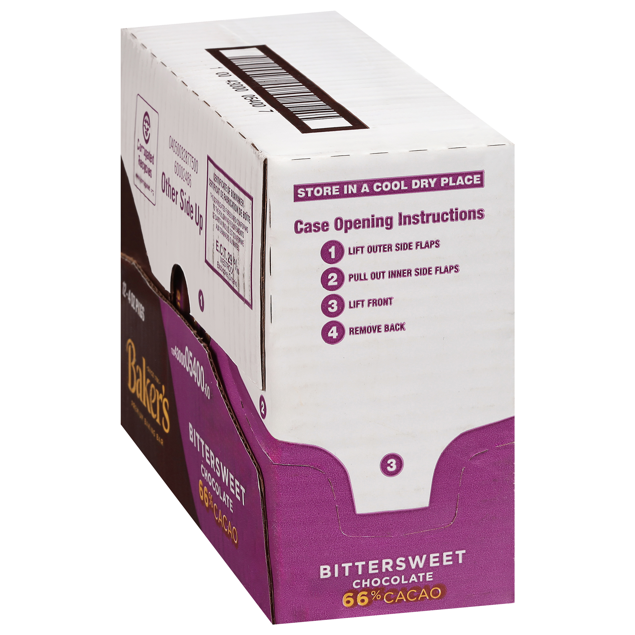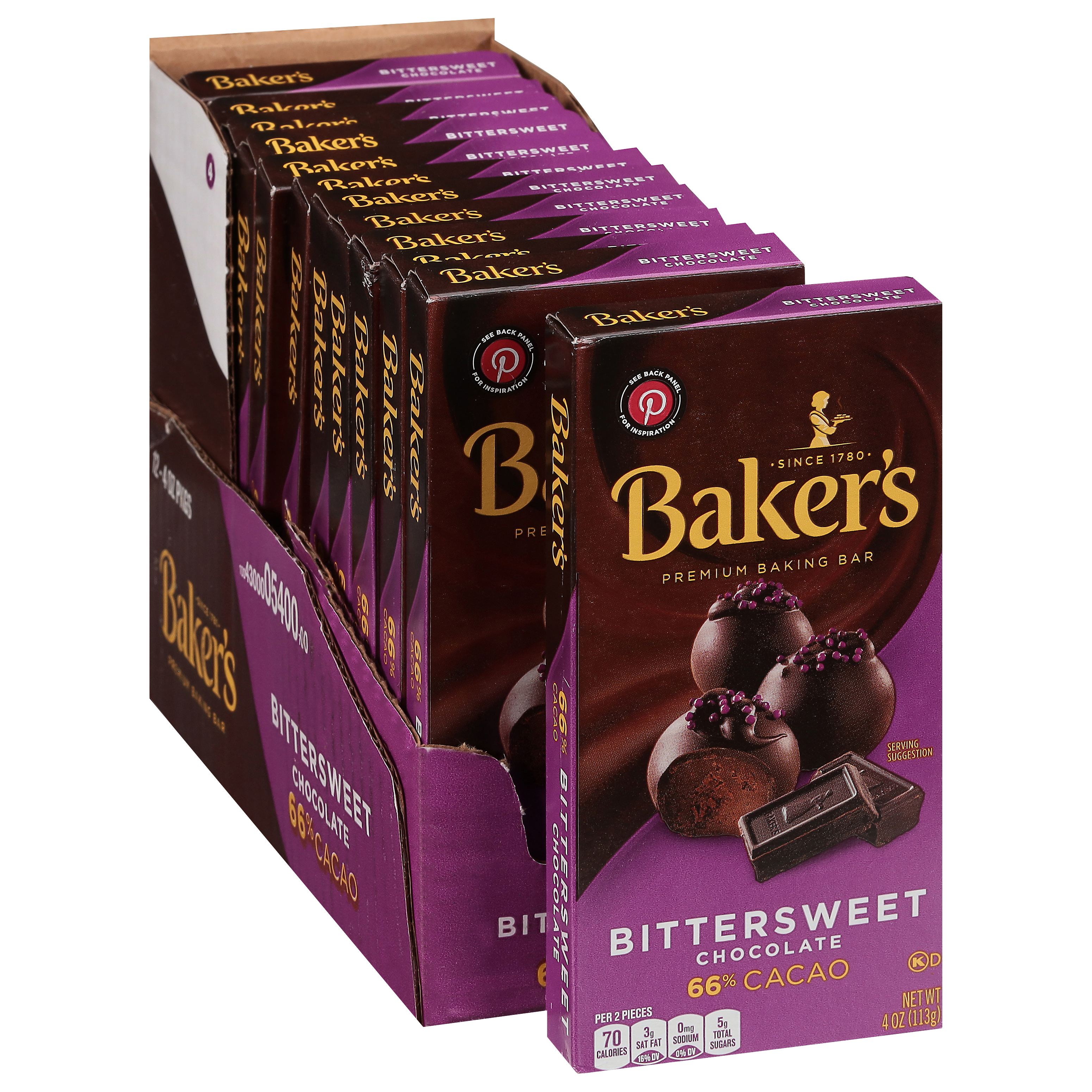 GTIN 10043000054007 Kraft Item Code (SKU) 00430000540000 Product Status Active Pack Level CASE Brand Name Baker's Business Unit Hydration Desserts & Meals Catalog Platform Desserts Product Category Baking & MM Consumer Unit Size 4 Consumer Unit Size UOM OZ Packaging Type (Computed) Box Packaging Type Code BOX/CARTON Packaging Type Code Override (Manual) PACK Sub Units Per Item 12 Lowest Level Side Override (Manual) 4 oz Boxes Variant Baking Bar Sub Variant Premium Baking Bar Global Product Classification Baking/Cooking Supplies (Shelf Stable) Global Product Classification Code 10000045 Computed Exports - Ingredients BITTERSWEET CHOCOLATE (CHOCOLATE, SUGAR, COCOA BUTTER, SOY LECITHIN [EMULSIFIER], VANILLA EXTRACT). Parent Reference 20043000054004 Child Reference 00043000054000 Customer Guarantee 120 Temperature Classification Conditioned Storage 10 to 20 °C / 50 to 68 °F, Relative Humidity less than 65% Temperature Classification Code 07 Net Weight 3 Gross Weight 3.573 Weight UOM LB Height (in) 3.5 Length/Depth (in) 8.75 Width (in) 6.438 Case Cube 0.114 Child Relation EACH_00043000054000 Parent Relation PALLET_20043000054004 Cases per Tier 32 Tiers per Pallet 10 Cases per Pallet 320 Pallet Stack Limit 2 Product Title Baker's Bittersweet Chocolate Premium Baking Bar with 66% Cacao, 12 ct Pack, 4 oz Boxes Product Benefits (Includes Seasonal + Formatting) - Twelve 4 oz boxes of Baker's Premium Bittersweet Baking Chocolate