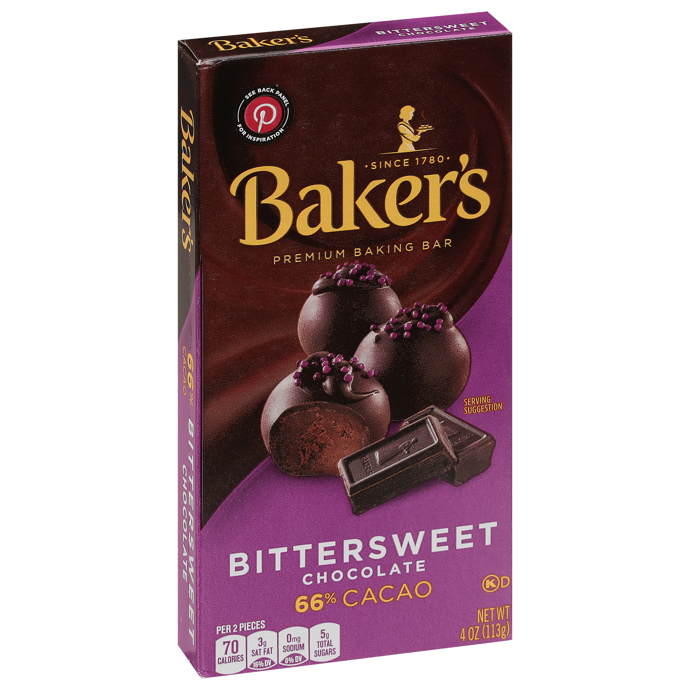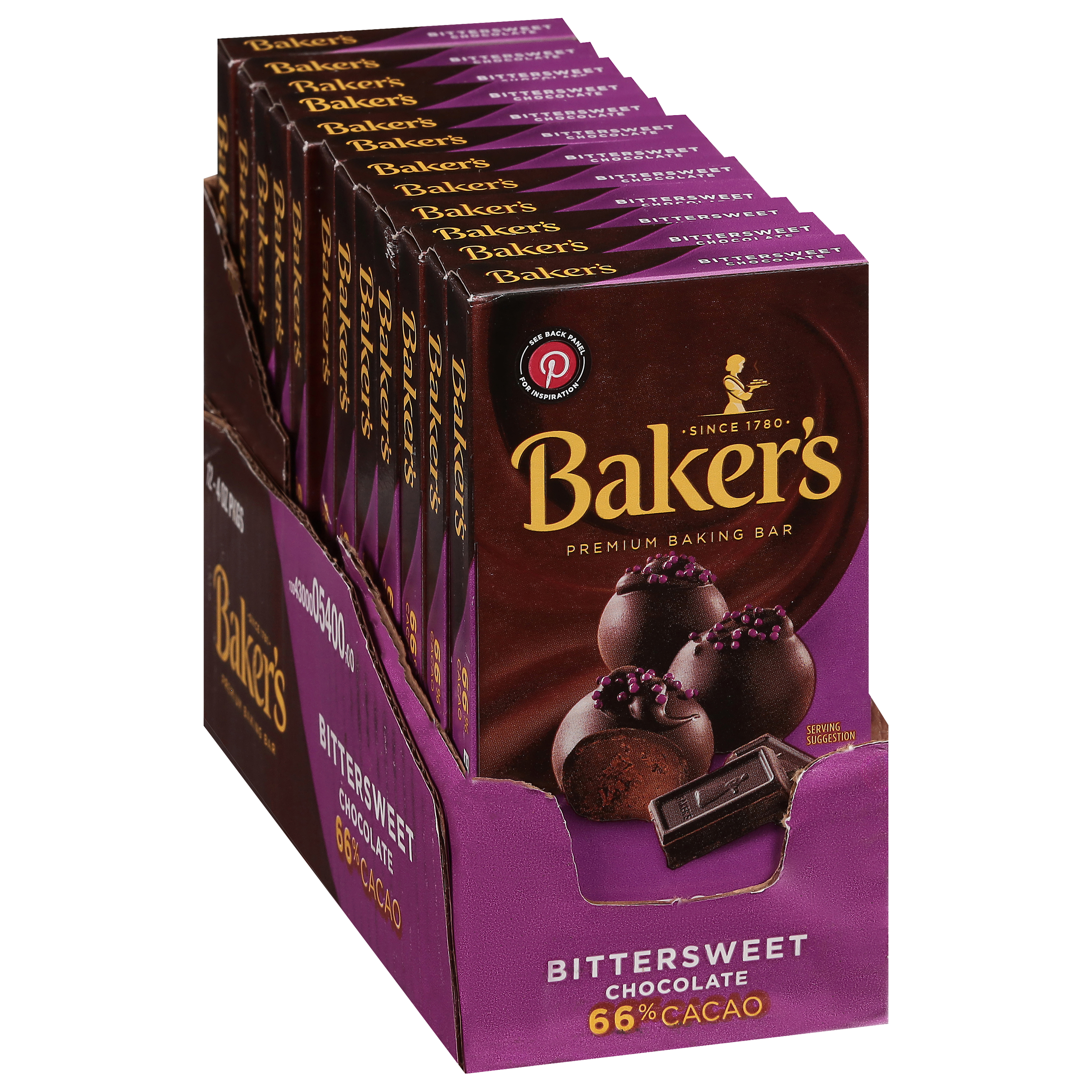 Product Description Baker's Premium Bittersweet Chocolate Baking Bar is the is premium bittersweet chocolate designed especially for bakers. With just a hint of sweetness, this bittersweet chocolate bar enhances the quality of your favorite bittersweet chocolate recipes. Each premium easy melt bar is made with cocoa butter for creamy texture and rich flavor. Made with 66 percent cacao, these 4 ounce bars is the baker's ingredient of choice when making decadent chocolate desserts. The new scored bar snaps cleanly into 1/4 ounce pieces, so you can easily and precisely measure the required chocolate in your favorite baking recipe. Each piece melts evenly, giving you reliable results whether you're folding it into cake batters or hand-dipping truffles. A paper wrapper keeps unused portions contained inside the box until your next baking session.