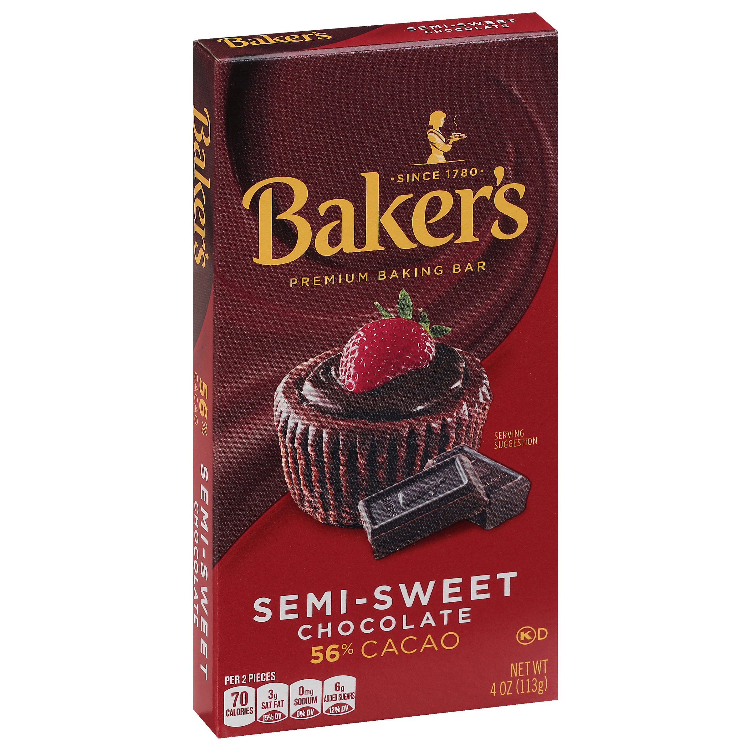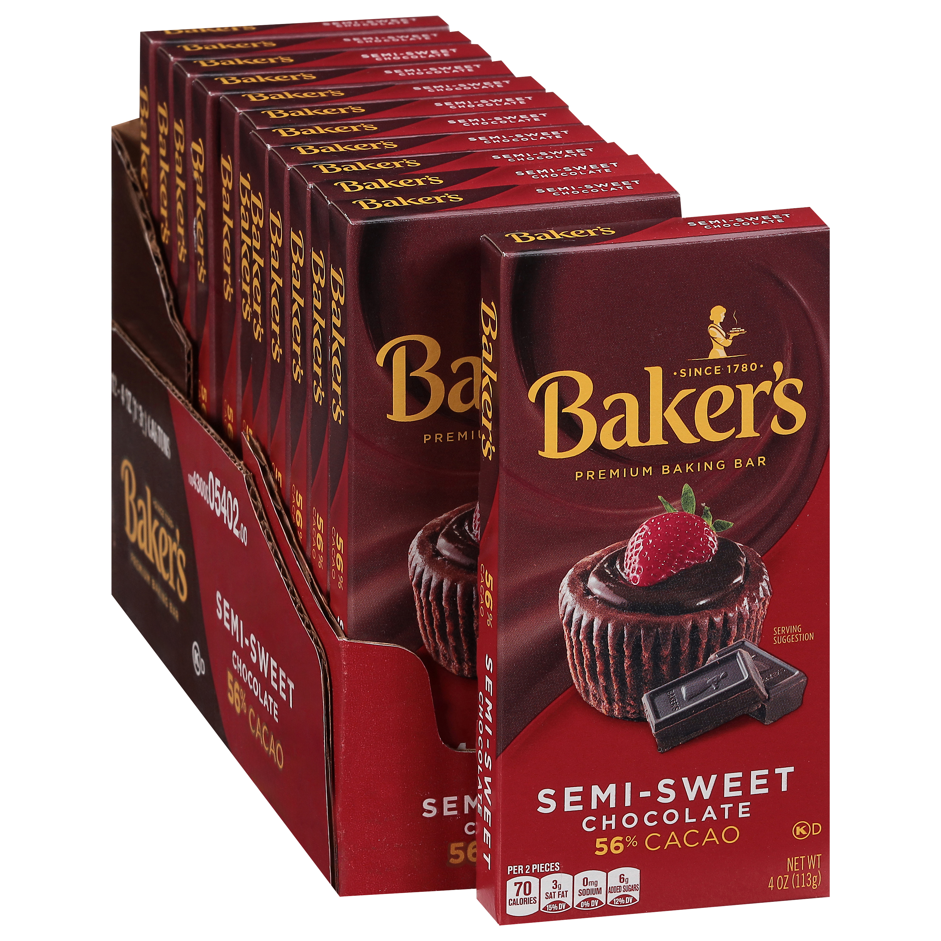 Product Description Baker's Premium Semi-Sweet Chocolate Baking Bar is a great addition to your recipes, serving as America's favorite premium chocolate since 1780. This semi-sweet baking bar is made with 56% cacao for a decadent flavor and smooth texture that makes all your recipes a hit. Made with cocoa butter, this premium baking bar breaks apart easily into semi sweet chocolate squares for quick portioning to fit your favorite cake, cookie, fudge and frosting recipes. This semi sweet chocolate for baking melts smoothly and easily in the microwave, so it's also great for dips or candy making. To ensure freshness, store this baking cocoa in a cool, dry place. One baking bar contains 4 ounce of semi-sweet chocolate.