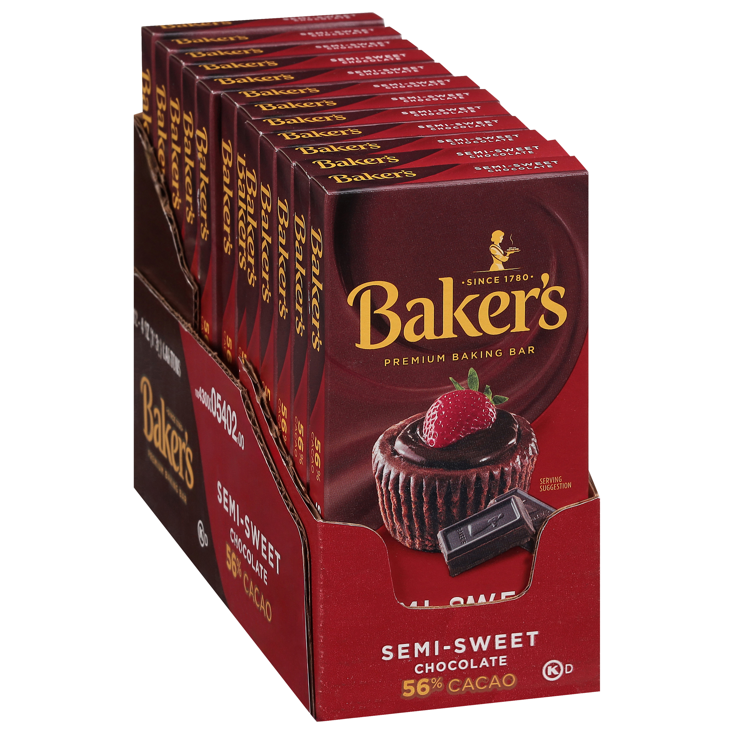 GTIN 10043000054021 Kraft Item Code (SKU) 00430000540200 Product Status Active Pack Level CASE Brand Name Baker's Business Unit Hydration Desserts & Meals Catalog Platform Desserts Product Category Baking & MM Consumer Unit Size 4 Consumer Unit Size UOM OZ Packaging Type (Computed) Box Packaging Type Code BOX/CARTON Sub Units Per Item 12 Variant Semi-Sweet Chocolate Sub Variant Premium Baking Bar Global Product Classification Baking/Cooking Supplies (Shelf Stable) Global Product Classification Code 10000045 Computed Exports - Ingredients SEMI-SWEET CHOCOLATE (CHOCOLATE, SUGAR, COCOA BUTTER, SOY LECITHIN [EMULSIFIER], VANILLA EXTRACT). Parent Reference 20043000054028 Child Reference 00043000054024 Customer Guarantee 180 Temperature Classification Conditioned Storage 10 to 20 °C / 50 to 68 °F, Relative Humidity less than 65% Temperature Classification Code 07 Net Weight 3 Gross Weight 3.573 Weight UOM LB Height (in) 3.5 Length/Depth (in) 8.75 Width (in) 6.438 Case Cube 0.114 Child Relation EACH_00043000054024 Parent Relation PALLET_20043000054028 Cases per Tier 32 Tiers per Pallet 10 Cases per Pallet 320 Pallet Stack Limit 2 Product Title Baker's Semi-Sweet Chocolate Premium Baking Bar with 56% Cacao, 4 oz Box Product Benefits (Includes Seasonal + Formatting) - Baker's Premium Semi-Sweet Chocolate Baking Bar is America's favorite premium chocolate since 1780