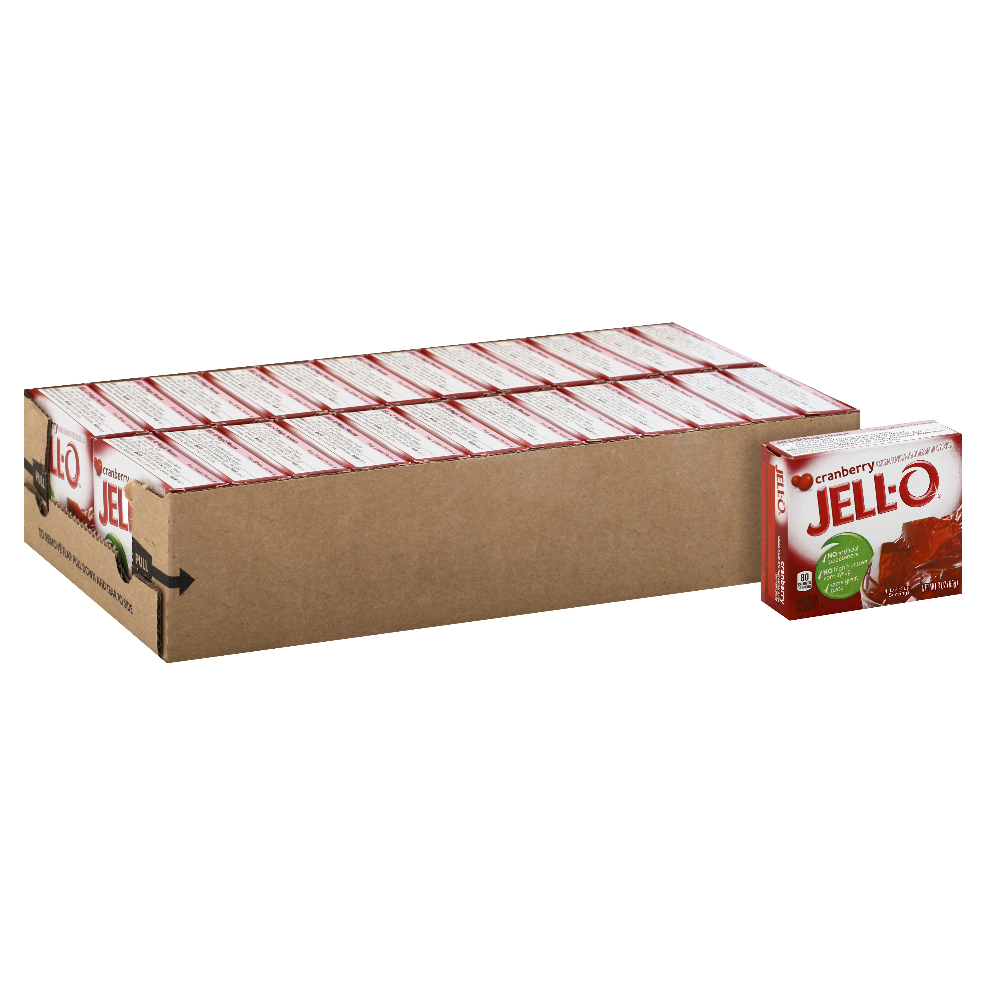 Product Description Jell-O Cranberry Instant Gelatin Mix is an easy to make cranberry flavored dessert. Perfect for cooling off on a hot day, this mouthwatering treat delivers the classic refreshingly sweet and tart cranberry taste you know and love. With no artificial sweeteners and no high fructose corn syrup and fat free, this dessert is one you can feel good about sharing with your family. These 3 ounce packages each make four 1/2-cup servings so you can prepare enough for the whole family. It's easy to make a tasty dessert for kids or adults Simply mix the cranberry flavored gelatin mix with boiling water, stir in cold water and refrigerate until set.