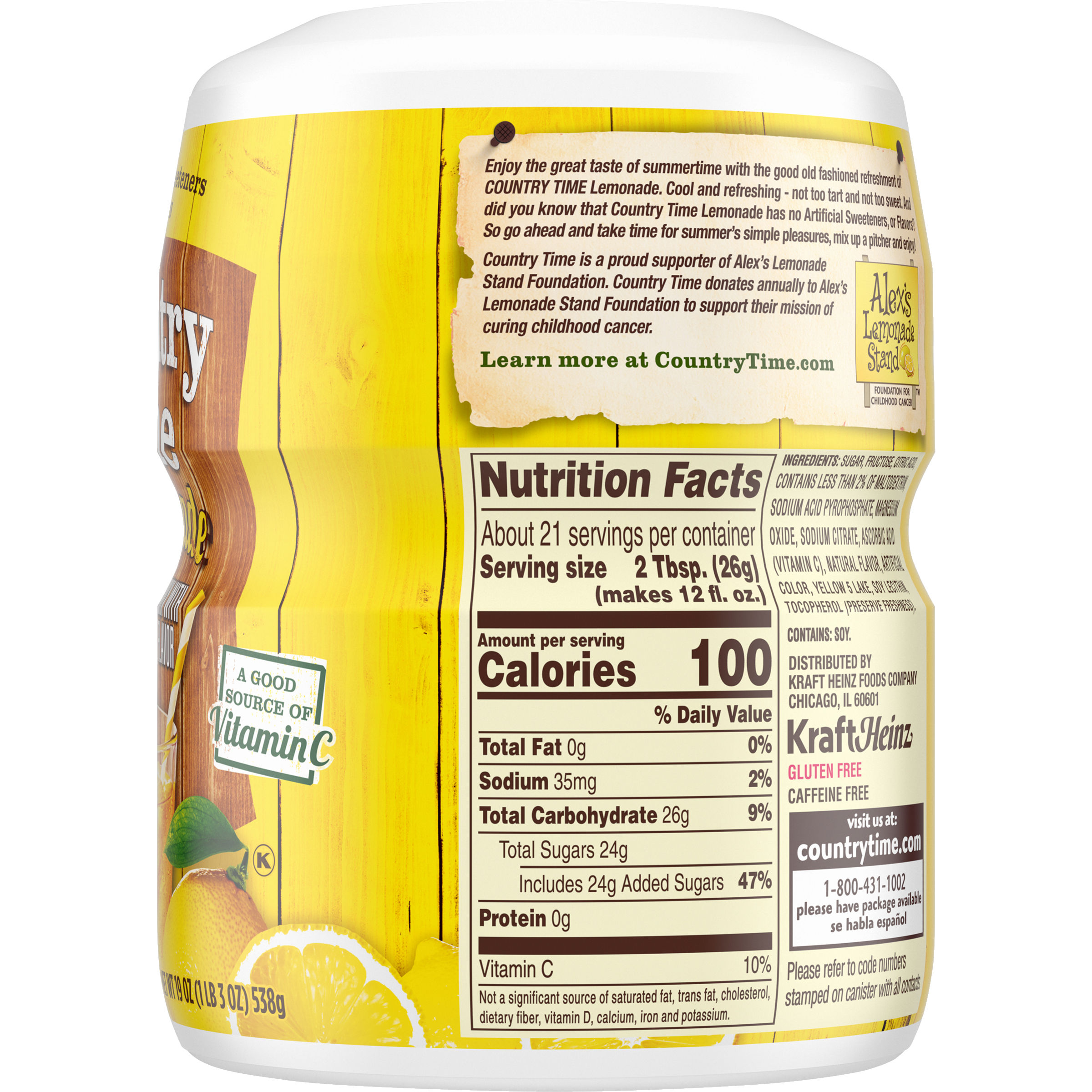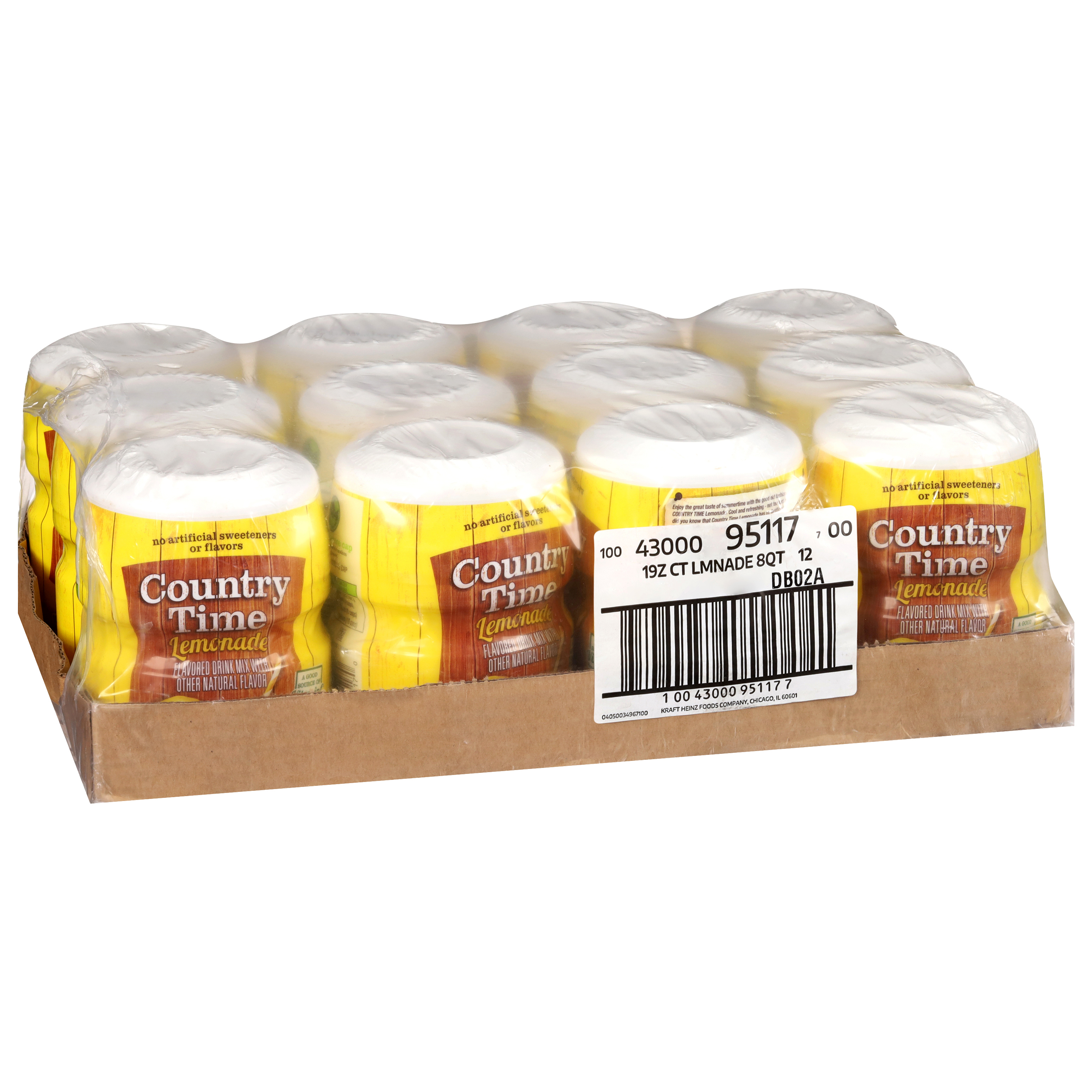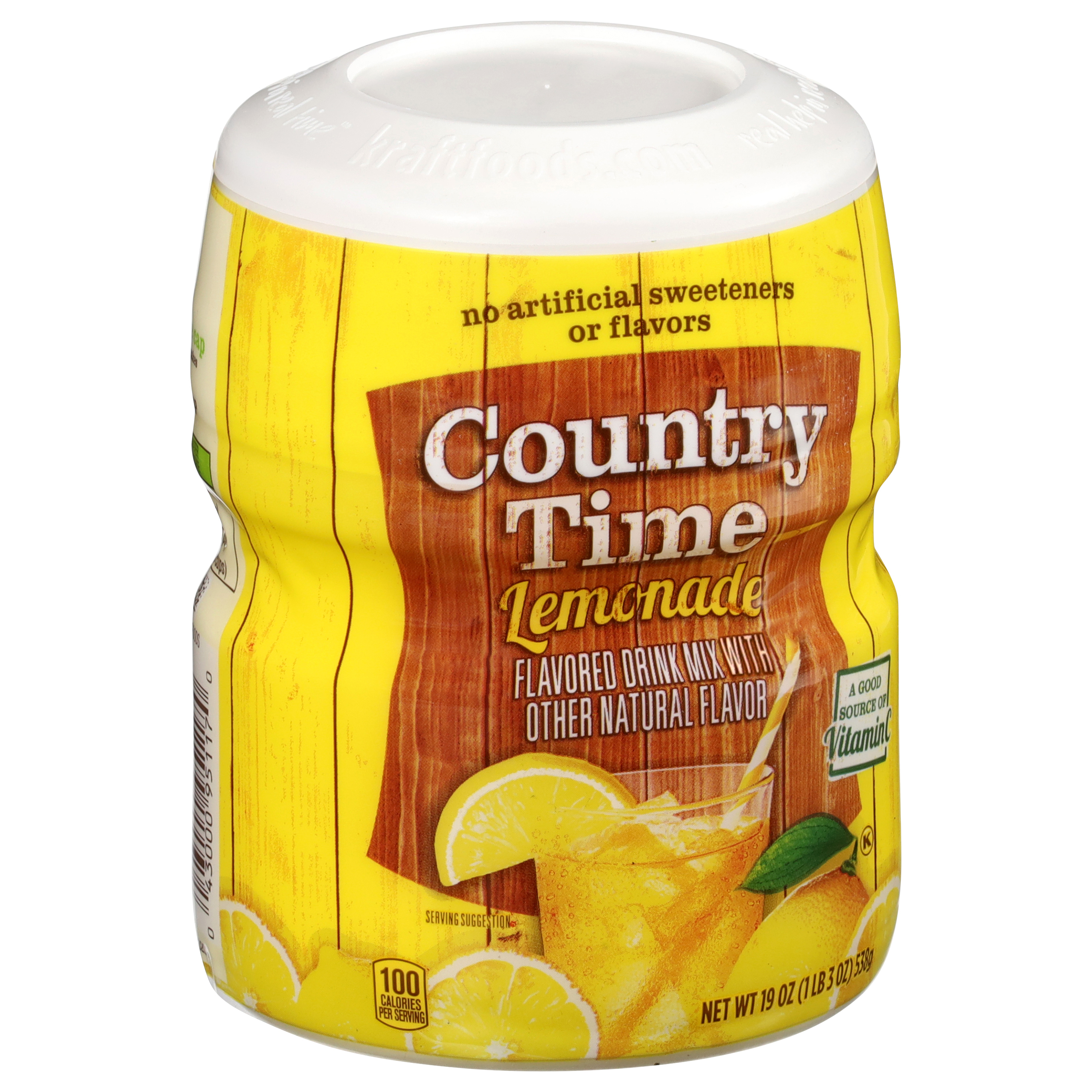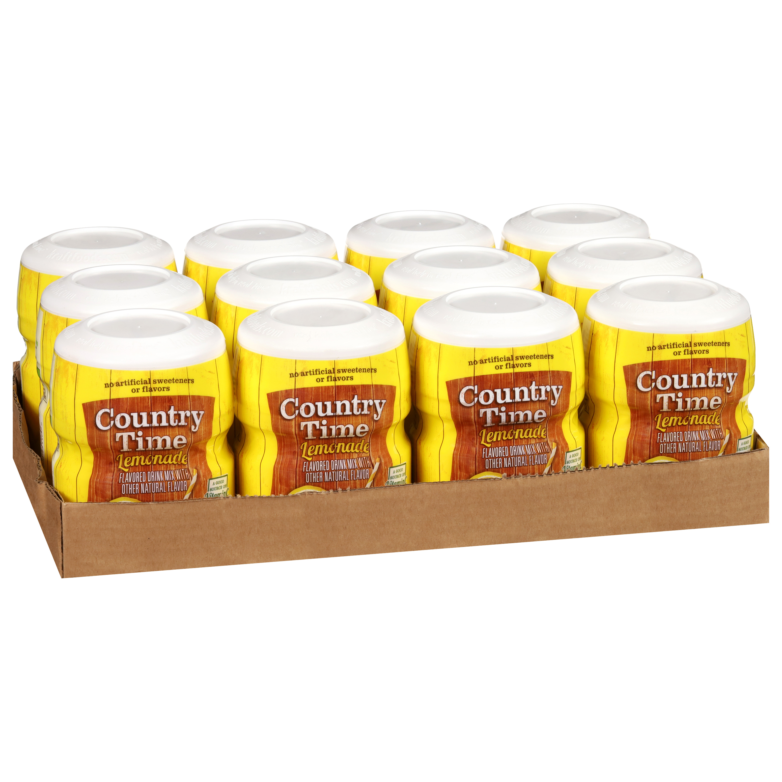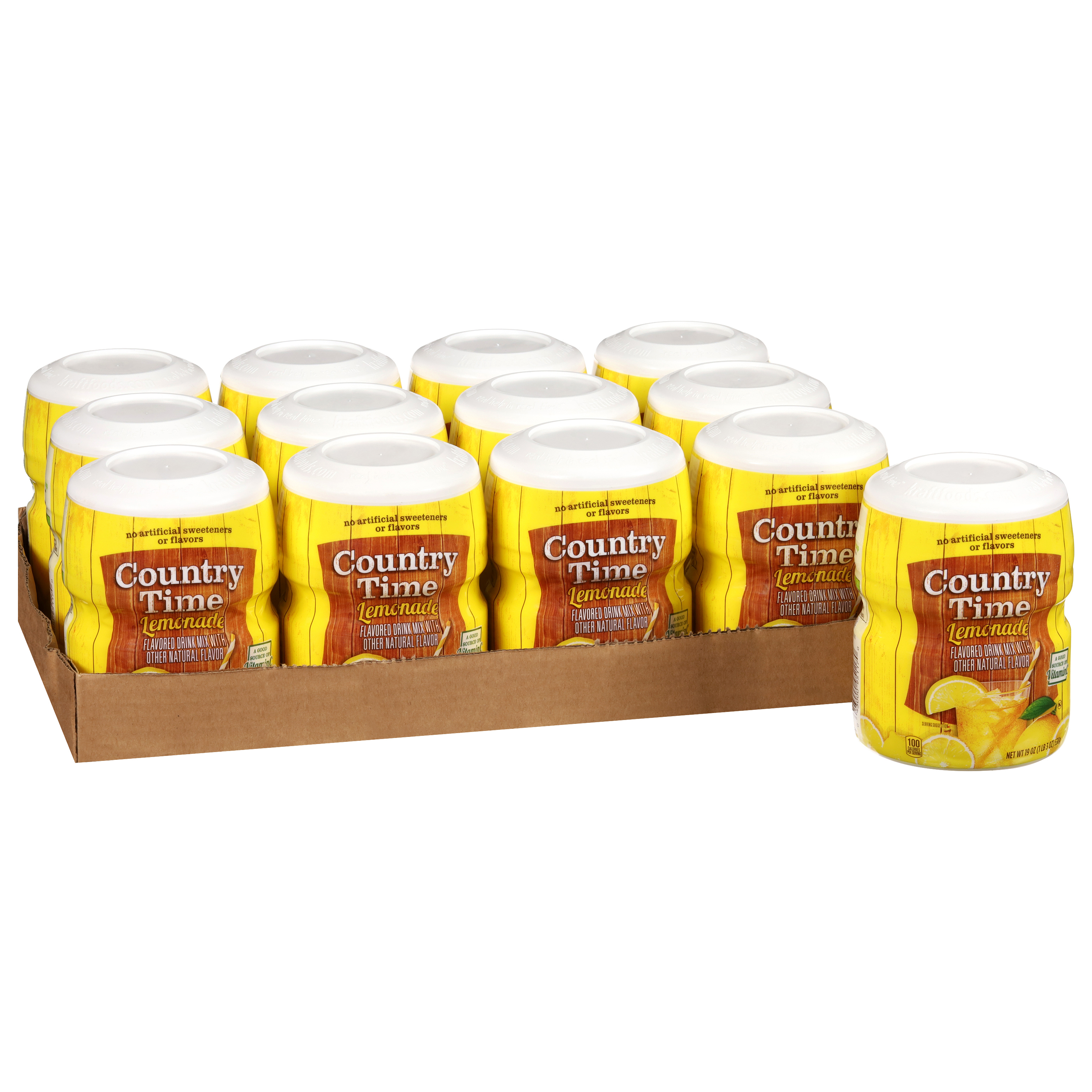 Product Description Country Time Naturally Flavored with other natural flavor Lemonade Powdered Drink Mix combines the great taste of summer and old-fashioned lemonade in our satisfying refreshment. A good source of vitamin C, made with real sugar and no artificial flavors or sweeteners, Country Time’s powdered lemonade drink mix is the perfect choice to help keep you cool on warm days. A classic since 1976, Country Time Lemonade has established itself as a beverage staple in homes nationwide. From serving at your child’s first lemonade stand to sharing a cold glass of lemonade with a friend on a sunny day, our lemonade mix is the go-to option for making lasting memories with those you love. Great with grilled fare such as burgers and hot dogs or as a tasty refreshment at your next picnic in the park. Country Time's sweet and tart flavor makes every occasion delicious. Our gluten free and kosher lemonade powder comes in a resealable canister to keep the product fresh and comes with an easy-measure lid for simple preparation. Each of the twelve 19-ounce canisters makes 8 quarts of lemonade, so there is enough drink mix for the whole family to enjoy! To prepare, simply pour our powdered lemonade mix into a plastic or glass pitcher, add water and ice, stir, and serve. Enjoy the great taste of summer, any time of year, with Country Time!