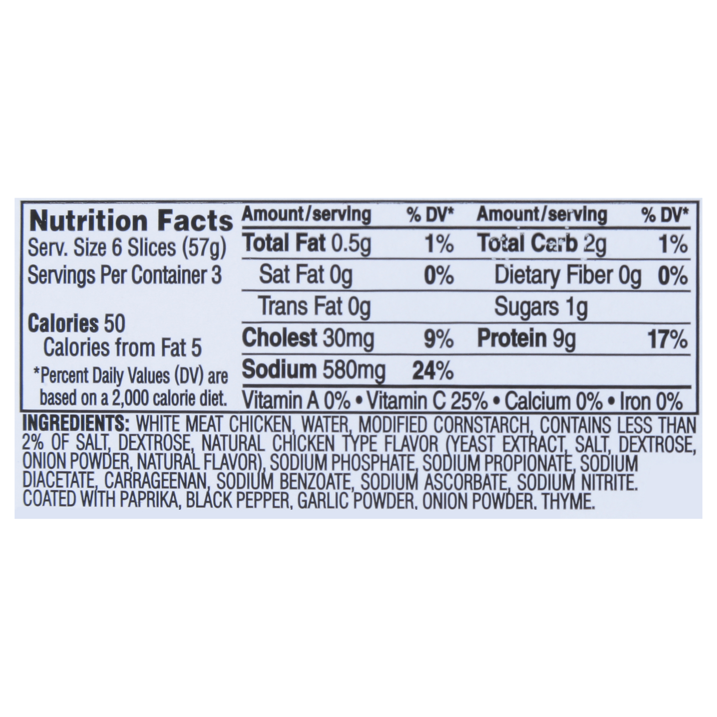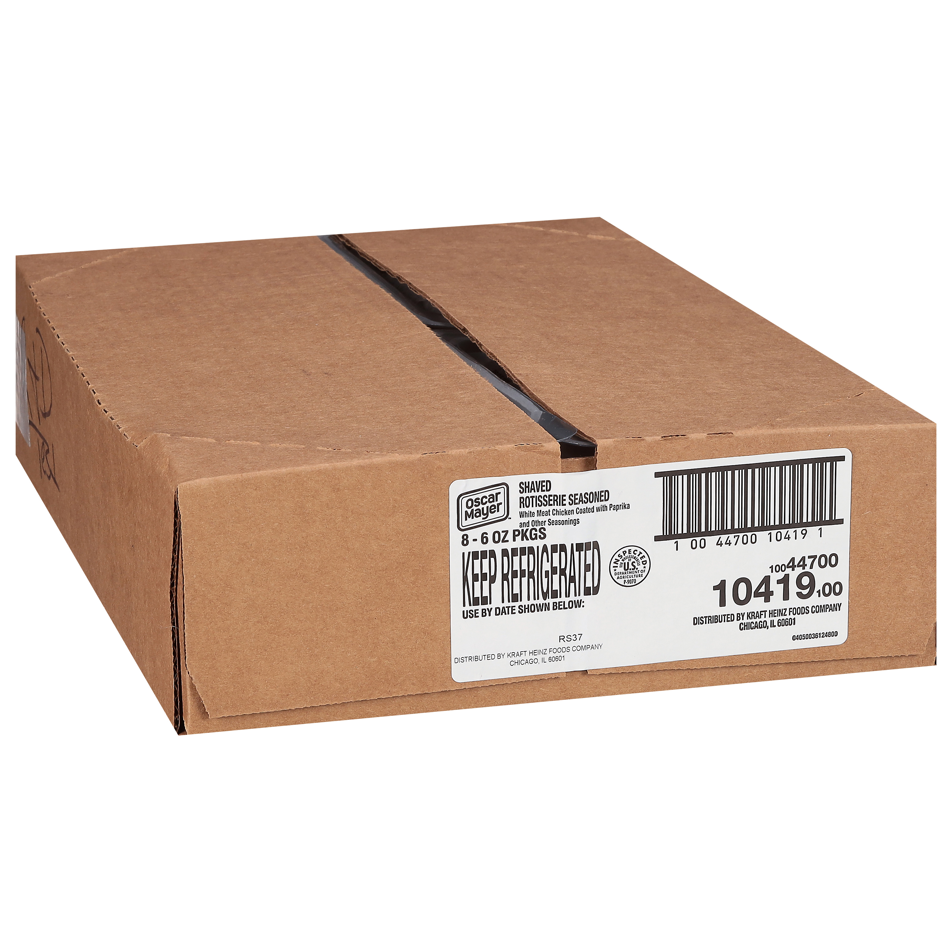 GTIN 10044700104191 Kraft Item Code (SKU) 00447001041900 Product Status Active Pack Level CASE Brand Name Oscar Mayer Business Unit Meat Cheese Coffee & Snacks Catalog Platform Meats Product Category Cold Cuts Consumer Unit Size 6 Consumer Unit Size UOM OZ Packaging Type (Computed) Box Packaging Type Code BOX/CARTON Sub Units Per Item 8 Variant Rotisserie Seasoned Global Product Classification Code 10005778 Computed Exports - Ingredients WHITE MEAT CHICKEN, WATER, MODIFIED CORNSTARCH, CONTAINS LESS THAN 2% OF SALT, DEXTROSE, NATURAL CHICKEN TYPE FLAVOR (YEAST EXTRACT, SALT, DEXTROSE, ONION POWDER, NATURAL FLAVOR), SODIUM PHOSPHATE, SODIUM PROPIONATE, SODIUM DIACETATE, CARRAGEENAN, SODIUM BENZOATE, SODIUM ASCORBATE, SODIUM NITRITE. COATED WITH PAPRIKA, BLACK PEPPER, GARLIC POWDER, ONION POWDER, THYME. Parent Reference 20044700104198 Child Reference 00044700104194 Customer Guarantee 40 Temperature Classification Code 02 Net Weight 3 Gross Weight 3.961 Weight UOM LB Height (in) 3.5 Length/Depth (in) 16 Width (in) 11.438 Case Cube 0.371 Child Relation EACH_00044700104194 Parent Relation PALLET_20044700104198 Cases per Tier 10 Tiers per Pallet 20 Cases per Pallet 200 Pallet Stack Limit 1 Product Title Oscar Mayer Smoked Rotisserie Seasoned Chicken, 8 ct. Case Product Description Oscar Mayer Smoked Rotisserie Seasoned Chicken, 8 ct. Case