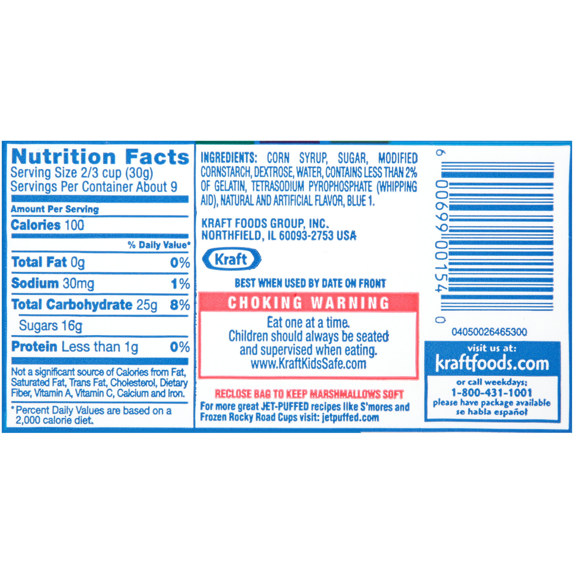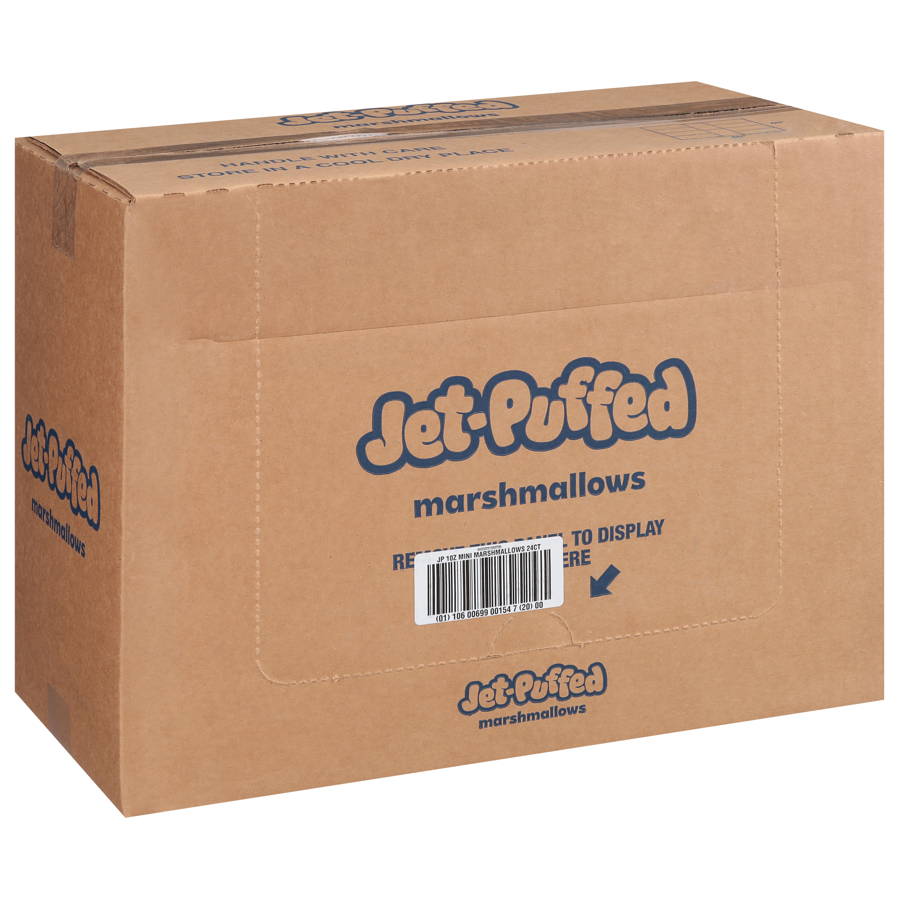 GTIN 10600699001547 Kraft Item Code (SKU) 06006990015400 Product Status Active Pack Level CASE Brand Name Jet-Puffed Business Unit Hydration Desserts & Meals Catalog Platform Desserts Product Category Marshmallows US Consumer Unit Size 10 Consumer Unit Size UOM OZ Packaging Type (Computed) Box Packaging Type Code BOX/CARTON Sub Units Per Item 24 Variant Vanilla Global Product Classification Sugar Candy/Sugar Candy Substitutes Confectionery Global Product Classification Code 10000312 Computed Exports - Ingredients CORN SYRUP, SUGAR, MODIFIED CORNSTARCH, DEXTROSE, WATER, CONTAINS LESS THAN 2% OF GELATIN, TETRASODIUM PYROPHOSPHATE (WHIPPING AID), NATURAL AND ARTIFICIAL FLAVOR, BLUE 1. Parent Reference 20600699001544 Child Reference 00600699001540 Customer Guarantee 60 Temperature Classification Conditioned Storage 10 to 20 °C / 50 to 68 °F, Relative Humidity less than 65% Temperature Classification Code 07 Net Weight 15 Gross Weight 16.888 Weight UOM LB Height (in) 14.875 Length/Depth (in) 19.125 Width (in) 9.5 Case Cube 1.564 Child Relation EACH_00600699001540 Parent Relation PALLET_20600699001544 Cases per Tier 10 Tiers per Pallet 6 Cases per Pallet 60 Pallet Stack Limit 1 Product Title Jet-Puffed Mini Marshmallows, Pack of 24, 10 oz. Bags Product Benefits (Includes Seasonal + Formatting) - Twenty-four 10 oz bags of Jet-Puffed Marshmallows
