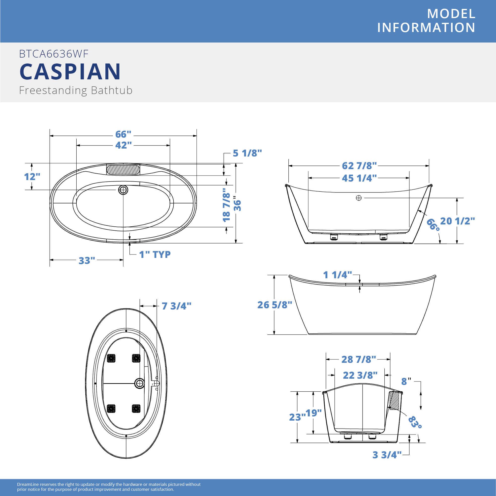 Unique ID BTCA6636WFXXC00 Brand Dreamline Product Category Bathtub Product Name DreamLine Caspian 66 inch L x 27 inch H White Acrylic Freestanding Bathtub Sellable Part Number BTCA6636WFXXC00 UPC 849388081566 Family Caspian Product Dimensions (in.) 66" x 36" x 26 5/8" Product Length (in.) 66 Product Height (in.) 26.625 Product Width (in.) 36 9 Set - Bullet 01 Model Size: 66 in. L x 36 in. W x 26 5/8 in. H 9 Set - Bullet 02 Configuration: 2-piece freestanding bathtub in white 9 Set - Bullet 03 Maximized bathing well with center drain 9 Set - Bullet 04 Ample deck space for faucet installation 9 Set - Bullet 05 Above-the-floor rough (AFR) 9 Set - Bullet 06 Innovative leveling legs for easy installation 9 Set - Bullet 07 Drain not included 9 Set - Bullet 08 Product Warranty: Lifetime limited 9 Set - Bullet 09 Proudly made in North America