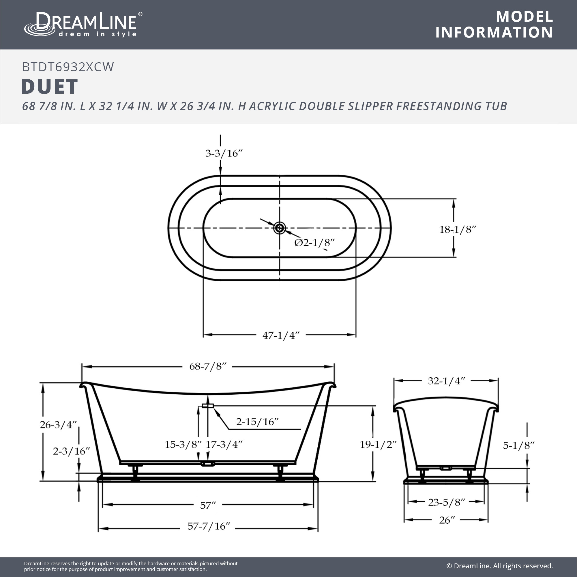 | 9 Set - Bullet 01 | Tub Size: 68-7/8" L x 32-1/4" W x 26-3/4" H; Soaking Depth: 15-3/8" |