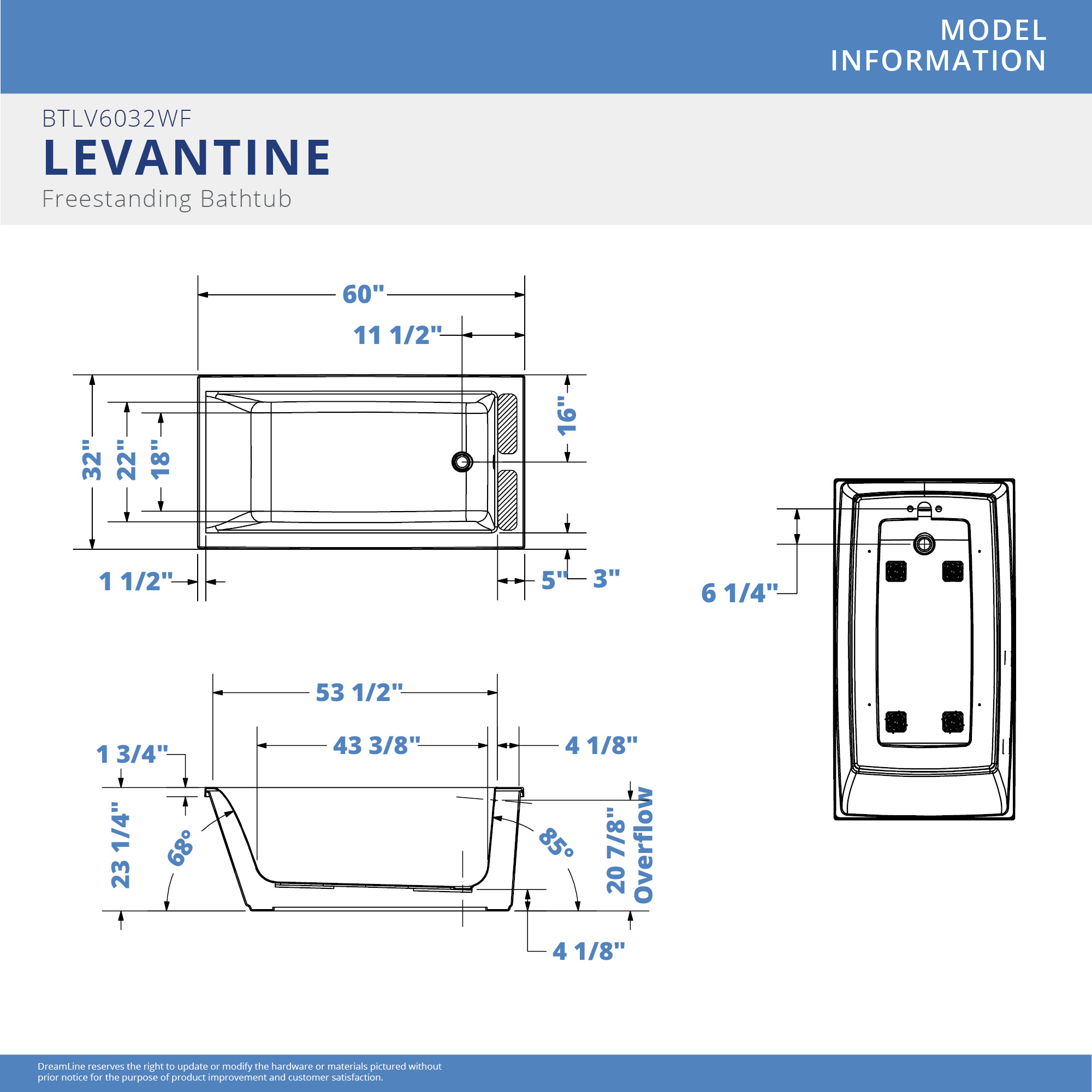 Unique ID BTLV6032WFXXF00 Brand Dreamline Product Category Bathtub Product Name DreamLine Levantine 60 inch L x 23 inch H White Acrylic Freestanding Bathtub Sellable Part Number BTLV6032WFXXF00 UPC 849388081702 Family Levantine Product Dimensions (in.) 60" x 32" x 23 1/4" Product Length (in.) 60 Product Height (in.) 23.25 Product Width (in.) 32 9 Set - Bullet 01 Model Size: 60 in. L x 32 in. W x 23 1/4 in. H 9 Set - Bullet 02 Configuration: 2-piece freestanding bathtub in white 9 Set - Bullet 03 Maximized bathing well with end drain 9 Set - Bullet 04 Ample deck space for faucet installation 9 Set - Bullet 05 Above-the-floor rough (AFR) 9 Set - Bullet 06 Innovative leveling legs for easy installation 9 Set - Bullet 07 Drain not included 9 Set - Bullet 08 Product Warranty: Lifetime limited 9 Set - Bullet 09 Proudly made in North America