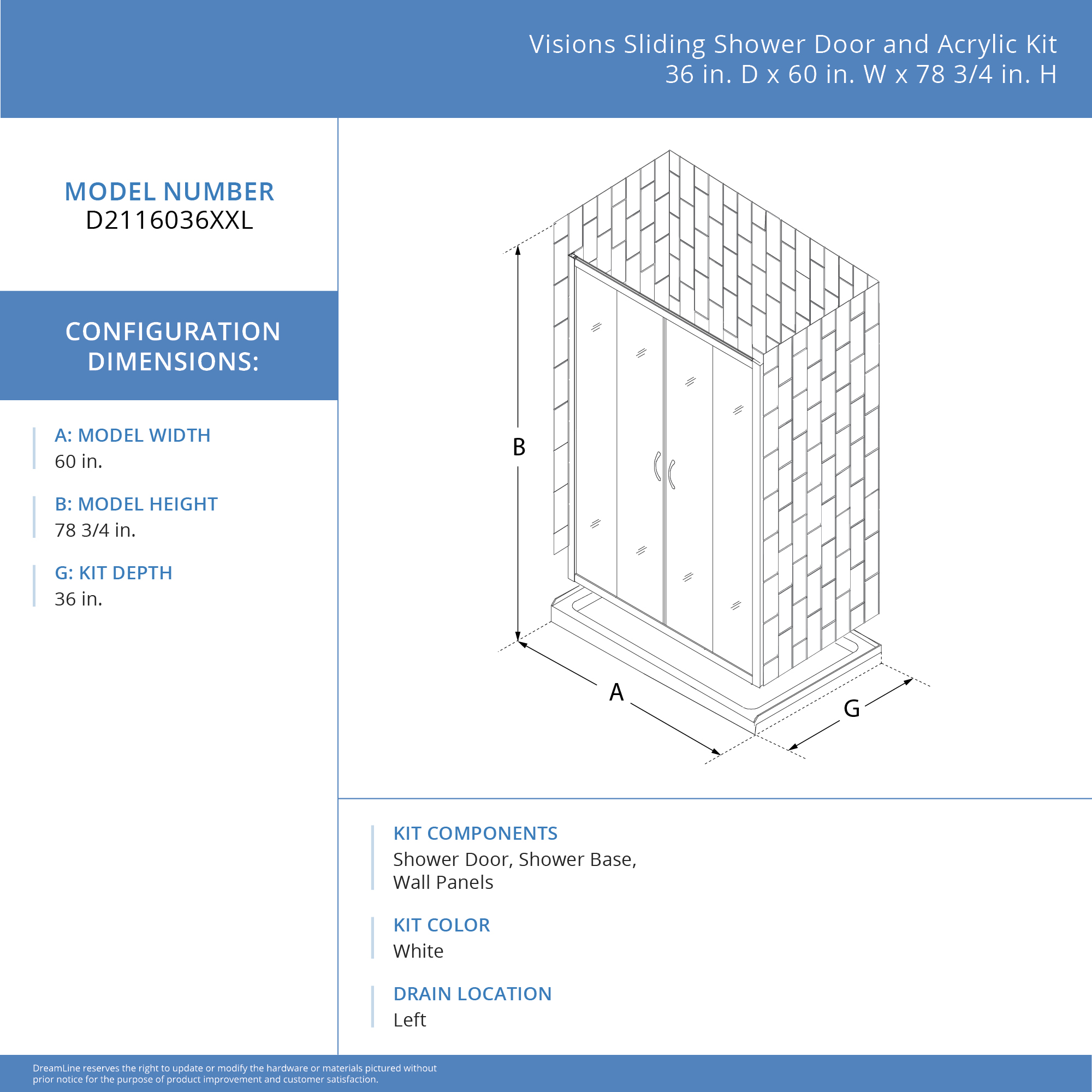 | 9 Set - Bullet 01 | Kit includes: Reversible shower door, base, and wall kit; Kit Size: 36 in. D x 60 in. W x 78 3/4 in. H; Walk-In Opening: 22 7/8 - 26 7/8 in. |