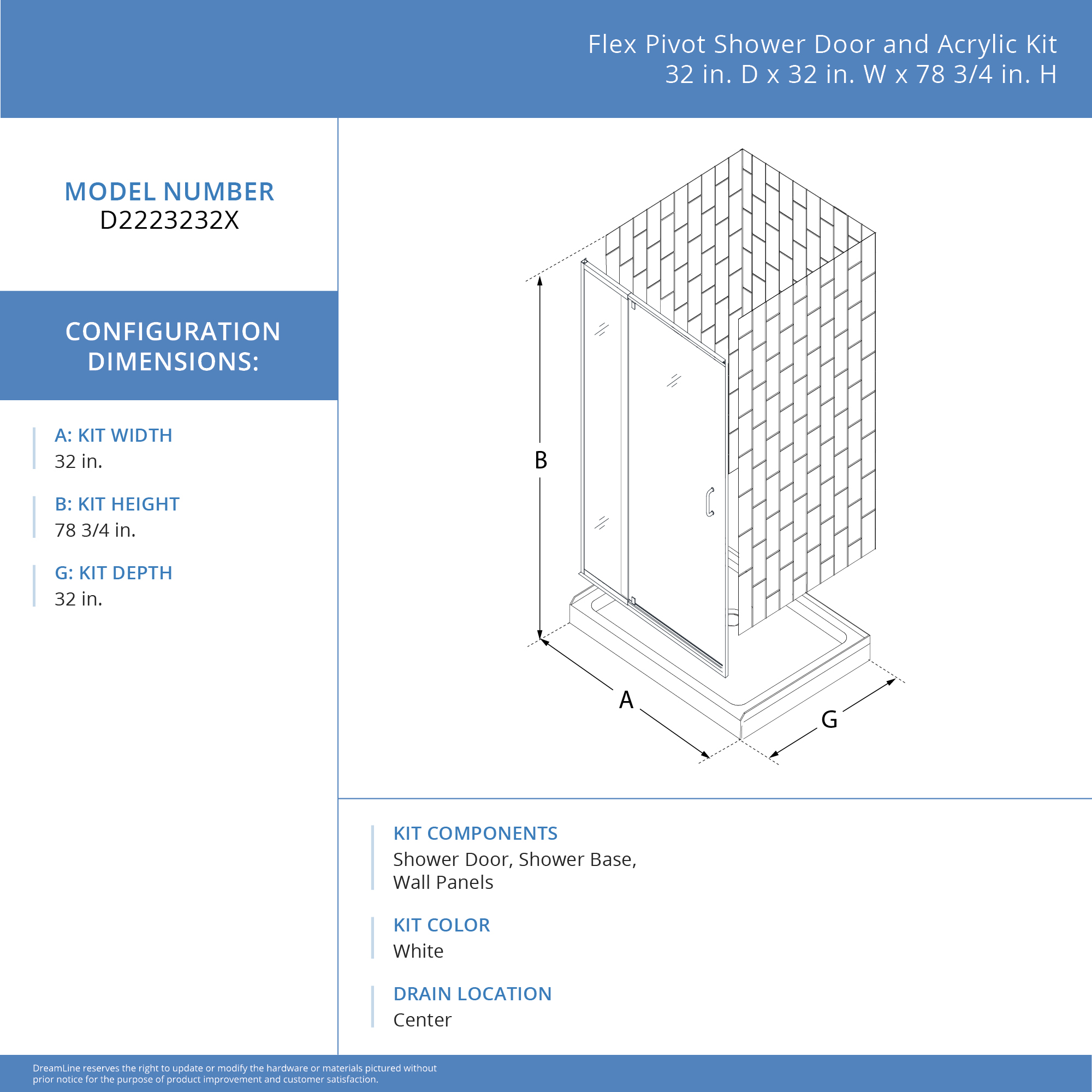 | 9 Set - Bullet 01 | Kit includes: Reversible shower door, base, and wall kit; Kit Size: 32 in. D x 32 in. W x 78 3/4 in. H; Walk-in Opening: 18 7/8 in. |