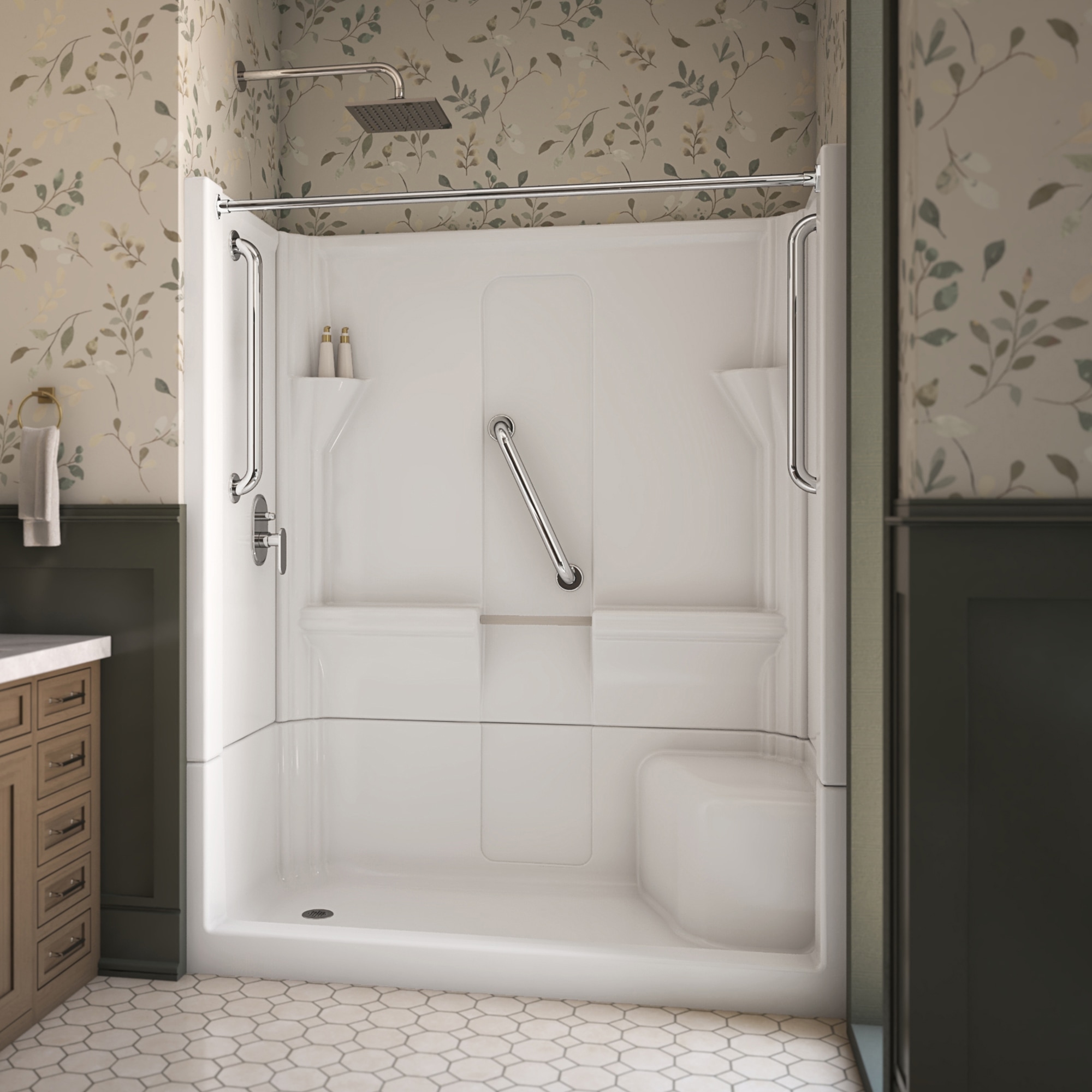 | 9 Set - Bullet 04 | Features a low 4” threshold, comfort height seat, shelving, and a foot ledge. |