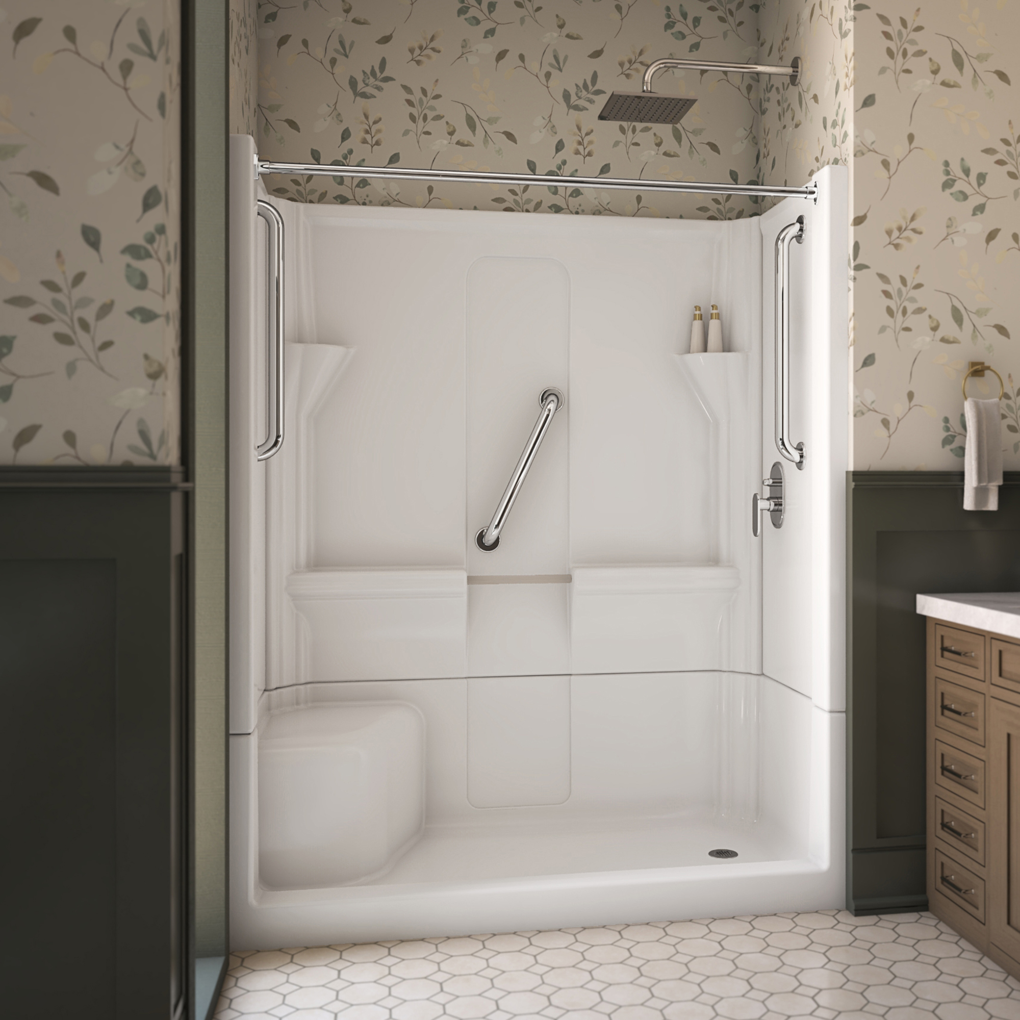 | 9 Set - Bullet 04 | Features a low 4” threshold, comfort height seat, shelving, and a foot ledge. |