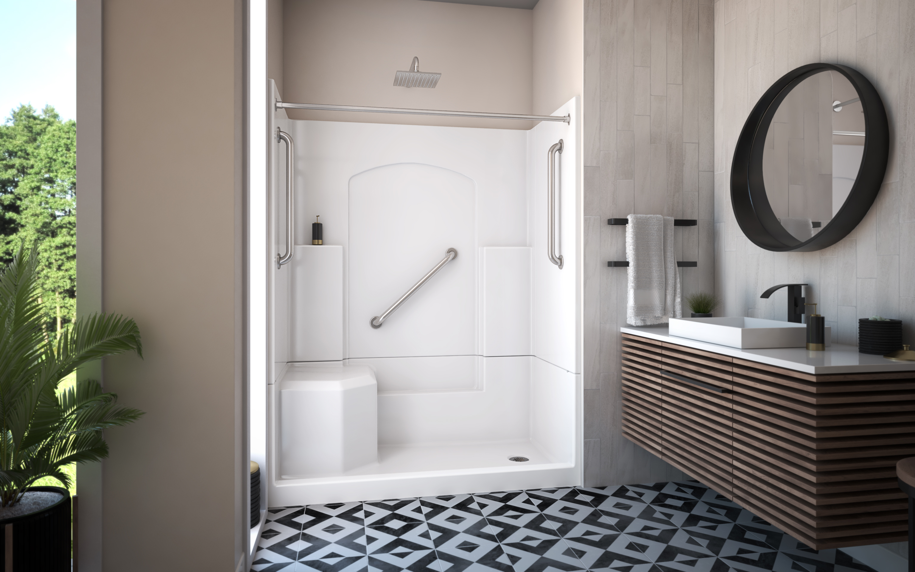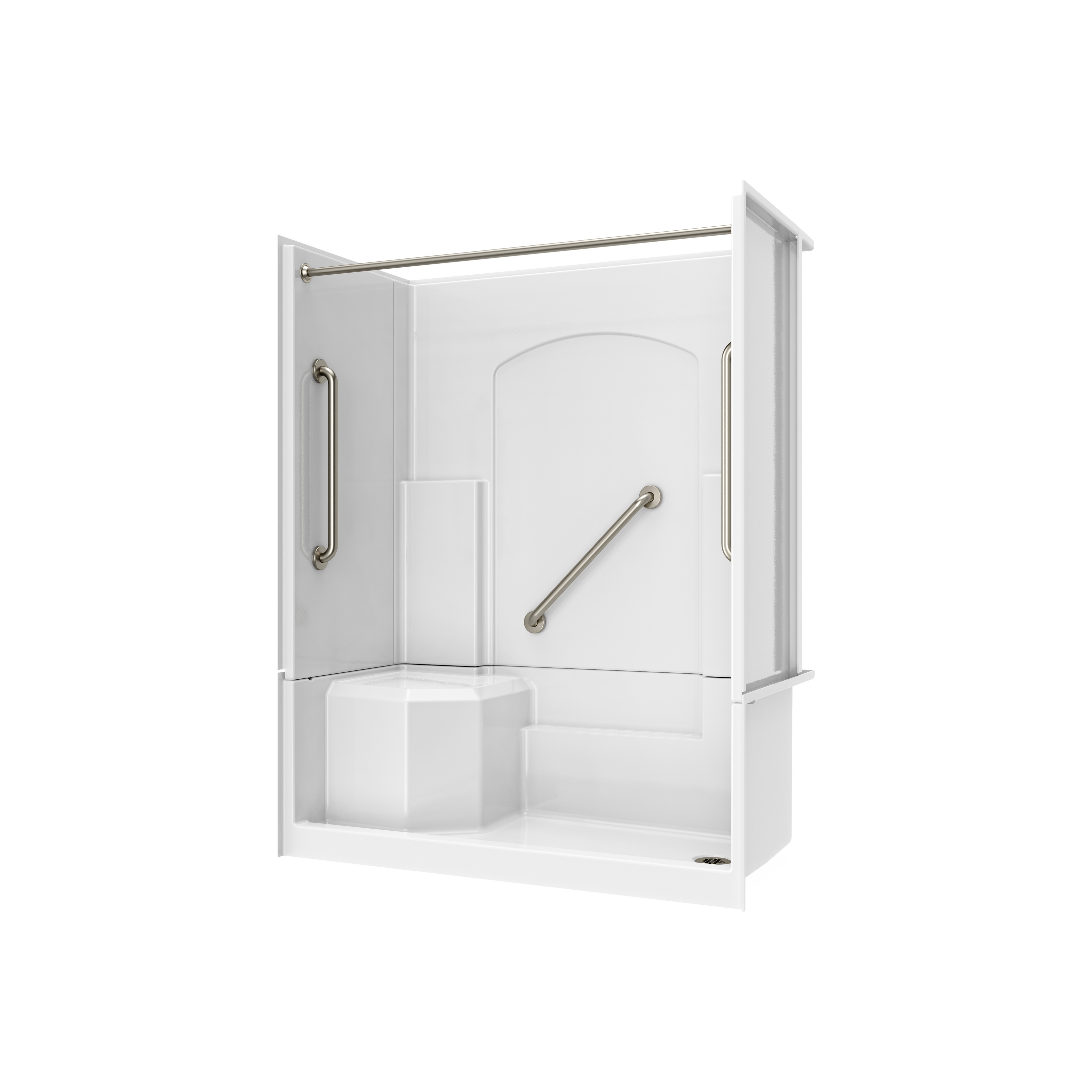 | 9 Set - Bullet 04 | Features a low 4” threshold, comfort height seat, shelving, and a foot ledge. |