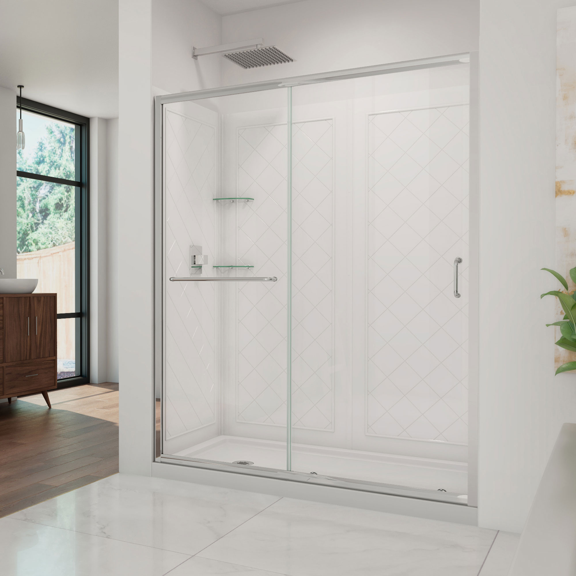 | 9 Set - Bullet 01 | Kit Includes: Infinity-Z Shower Door, SlimLine Shower Base, and Backwall; Kit Size: 32 in. D x 60 in. W x 76 3/4 in. H; Walk-in: 21 3/8 - 25 3/8 in. |