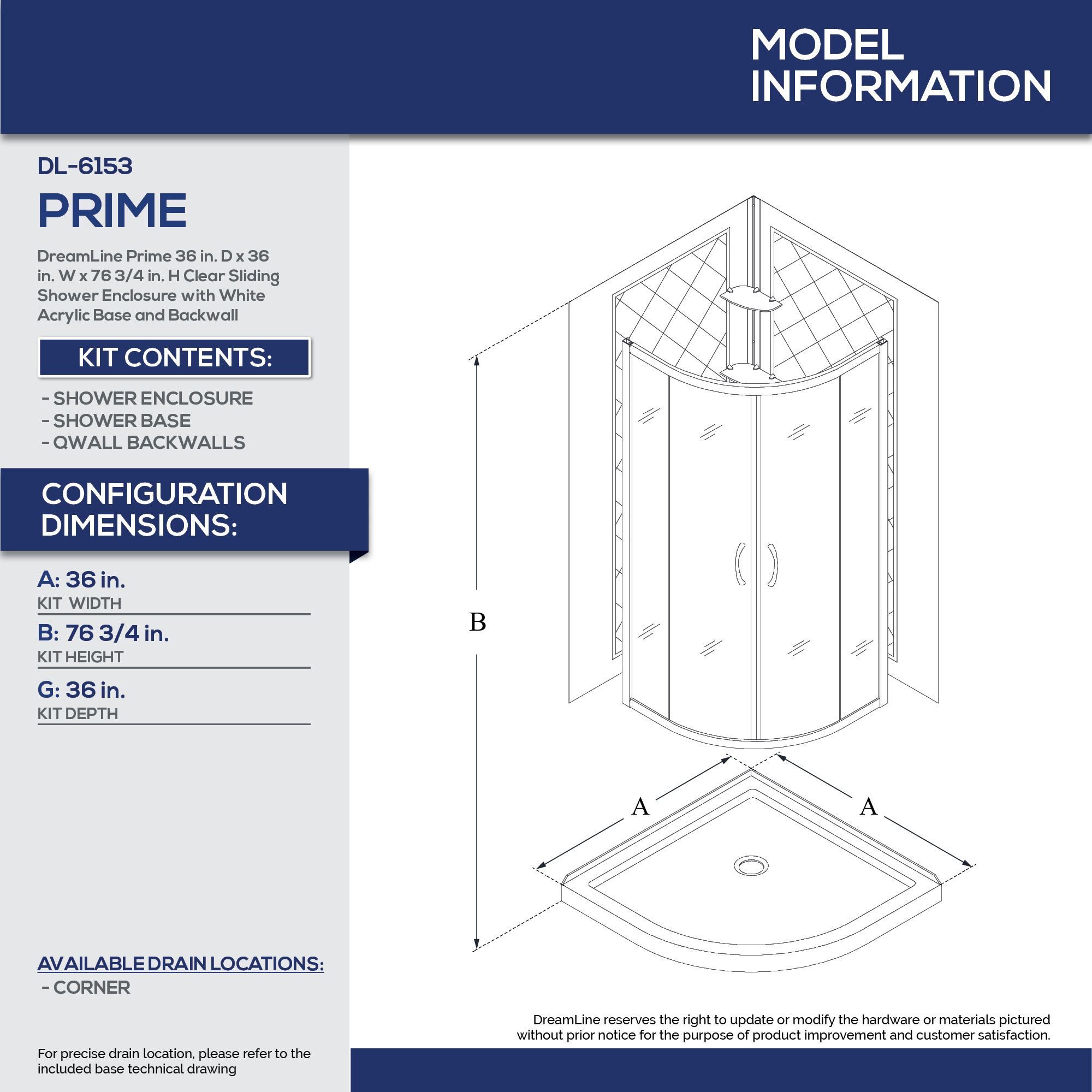 | 9 Set - Bullet 01 | Kit includes: Shower Enclosure, Shower Base, and Backwalls; Kit Size: 36 in. D x 36 in. W x 76 3/4 in. H; Walk-In Opening: 20 3/8 in. |